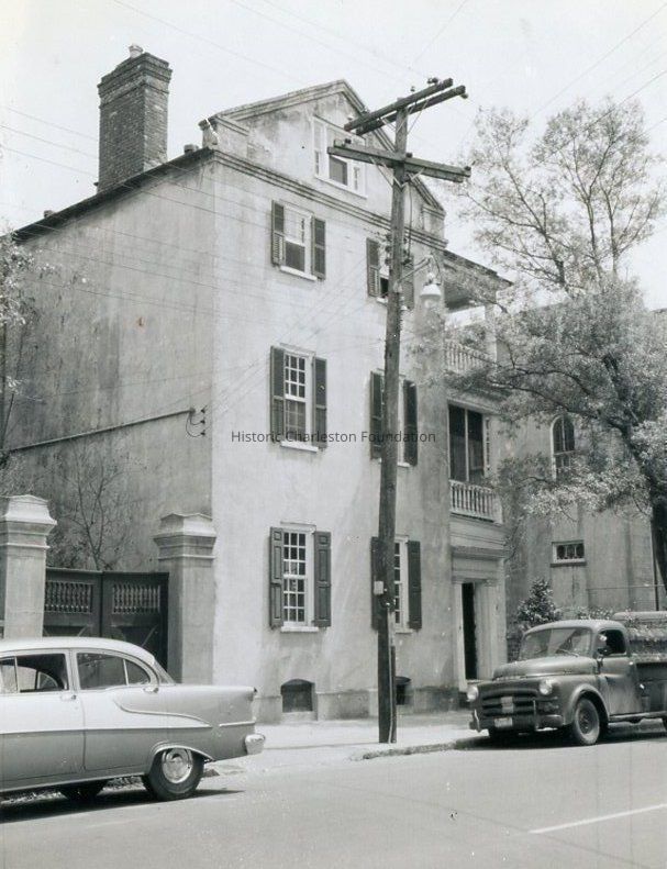 B&W Polaroid photograph of the Young-Motte House (30 Meeting Street), corner view showing the west (front) and north elevations.
