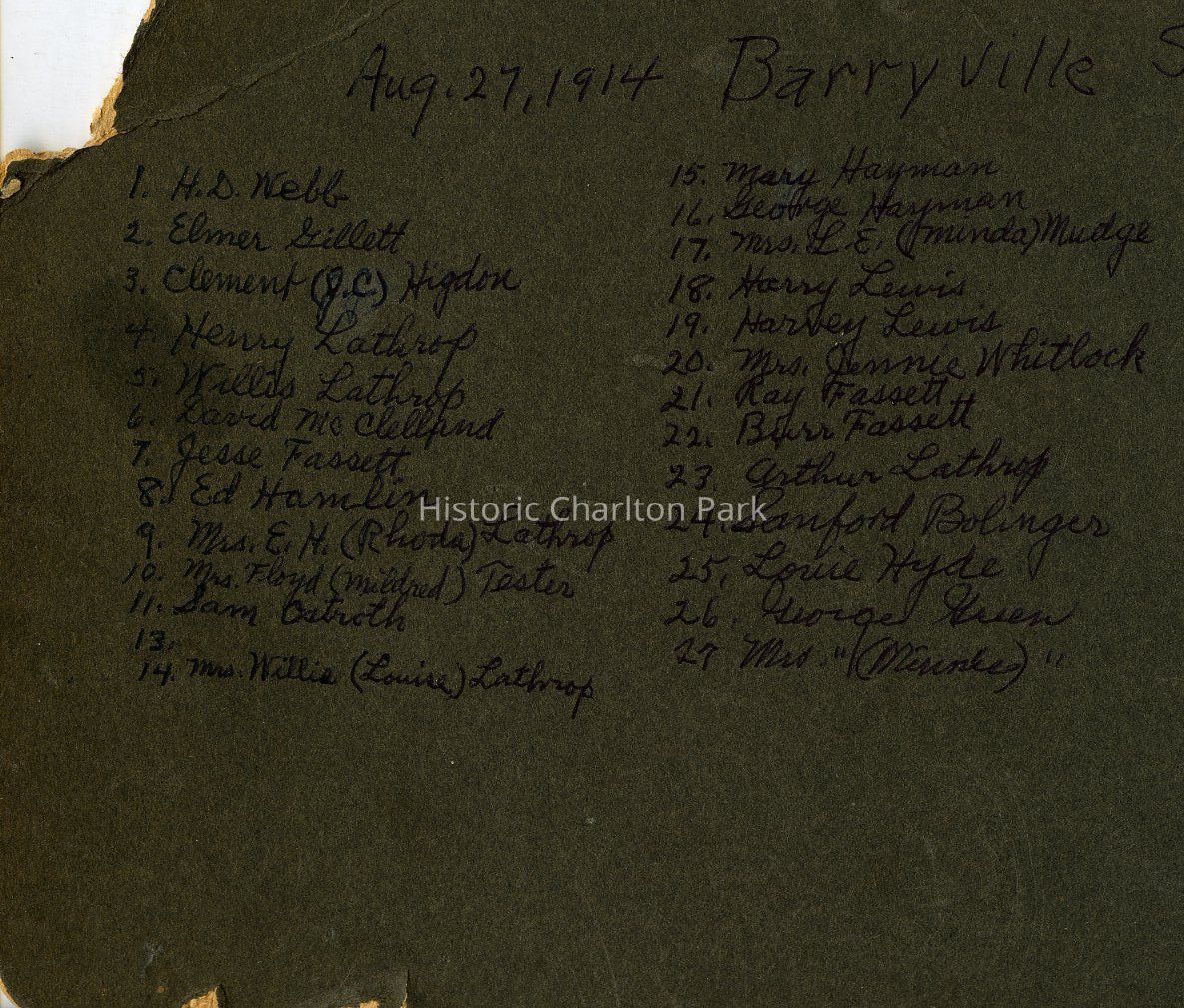 Bolinger, Sanford, Fassett, Burr, Fassett, Jesse, Fassett, Ray, Gillett, Elmer, Green, George, Green, Minnie, Green, Mrs. George, Hamlin, Ed, Hayman, George, Hayman, Mary, Higdon, Clement, Hyde, Louie, Lathrop, Arthur, Lathrop, Henry, Lathrop, Louise, Lathrop, Mrs. E. H., Lathrop, Mrs. Willis, Lathrop, Rhoda, Lathrop, Willis, Lewis, Harry, Lewis, Harvey, McClelland, David, Mudge, Minda, Mudge, Mrs. L. E., Ostroth, Sam, Tester, Mildred, Tester, Mrs. Floyd, Webb, H. D., Whitlock, Mrs. Jennie