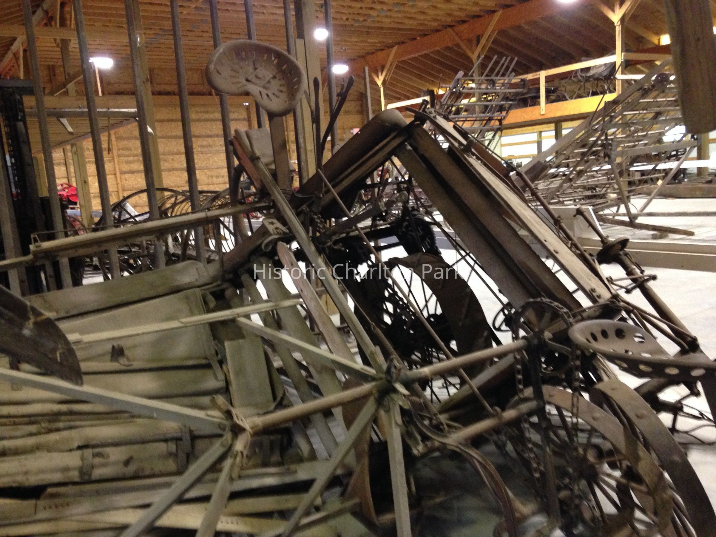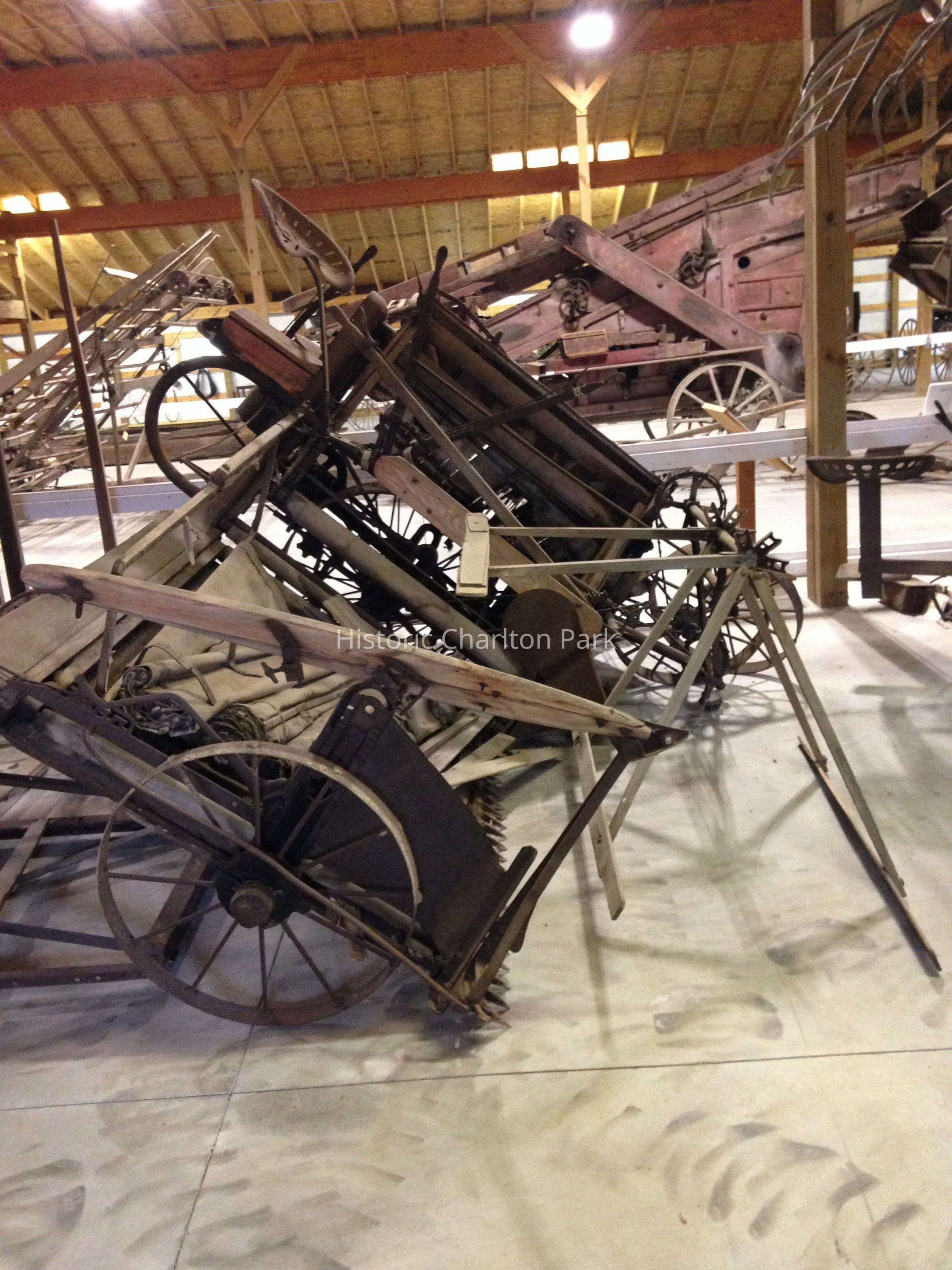 International Harvester Company Reaper/Binder, used for harvesting crops. Blade would cut down stalks, rotating wooden blades would align and collect the stalks, and machine would leave bundled stalks in rounded rows along each aisle. "Leon" written on the wagon in metal tacks.Acquisition