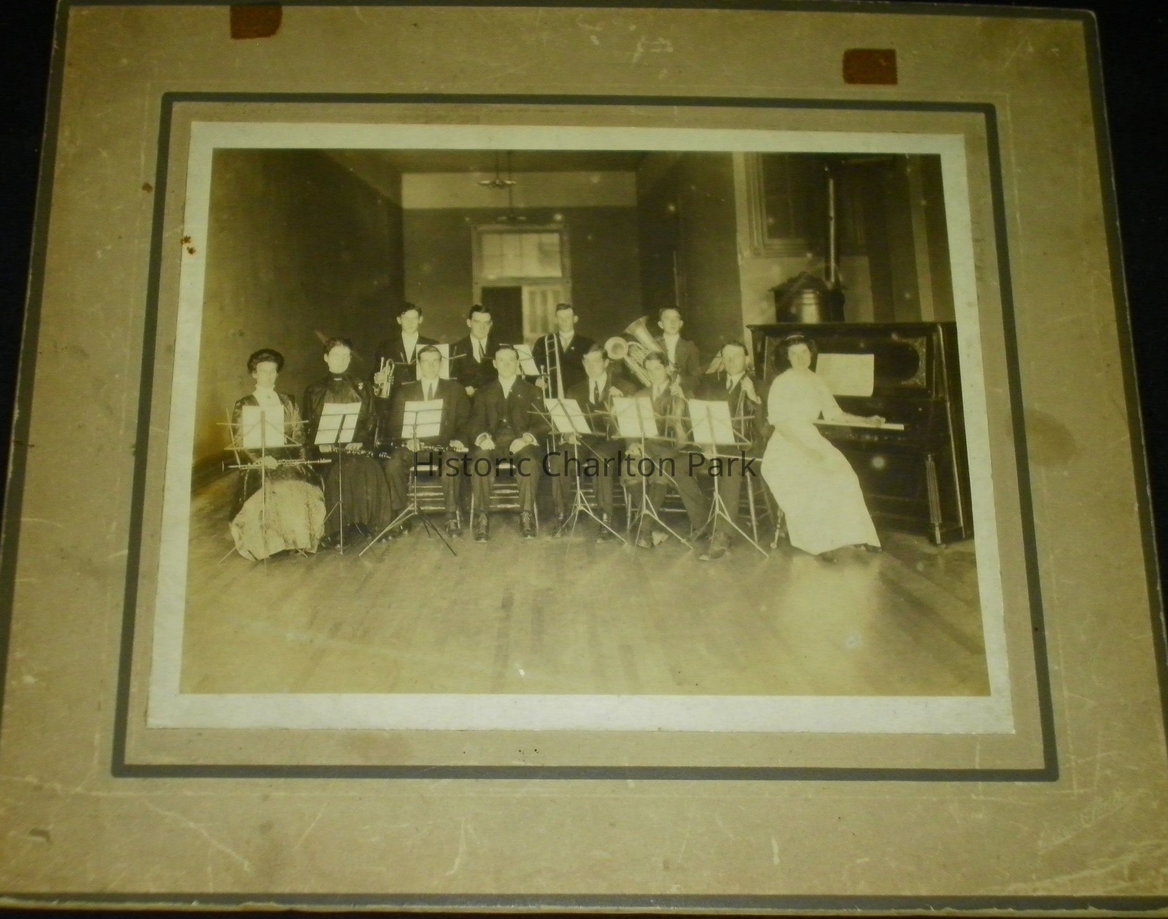 Kuenzel Orchestra, 1911. Black and white print mounted on gray card stock. Card has black lines to frame the picture. Scene shows band members that include three women and nine men. One of the women is sitting at a piano. Handwritten note on back: "This picture was taken on Sept. 10th the evening before "#1 & #10 were Married by #6's father. People are identified on the back: