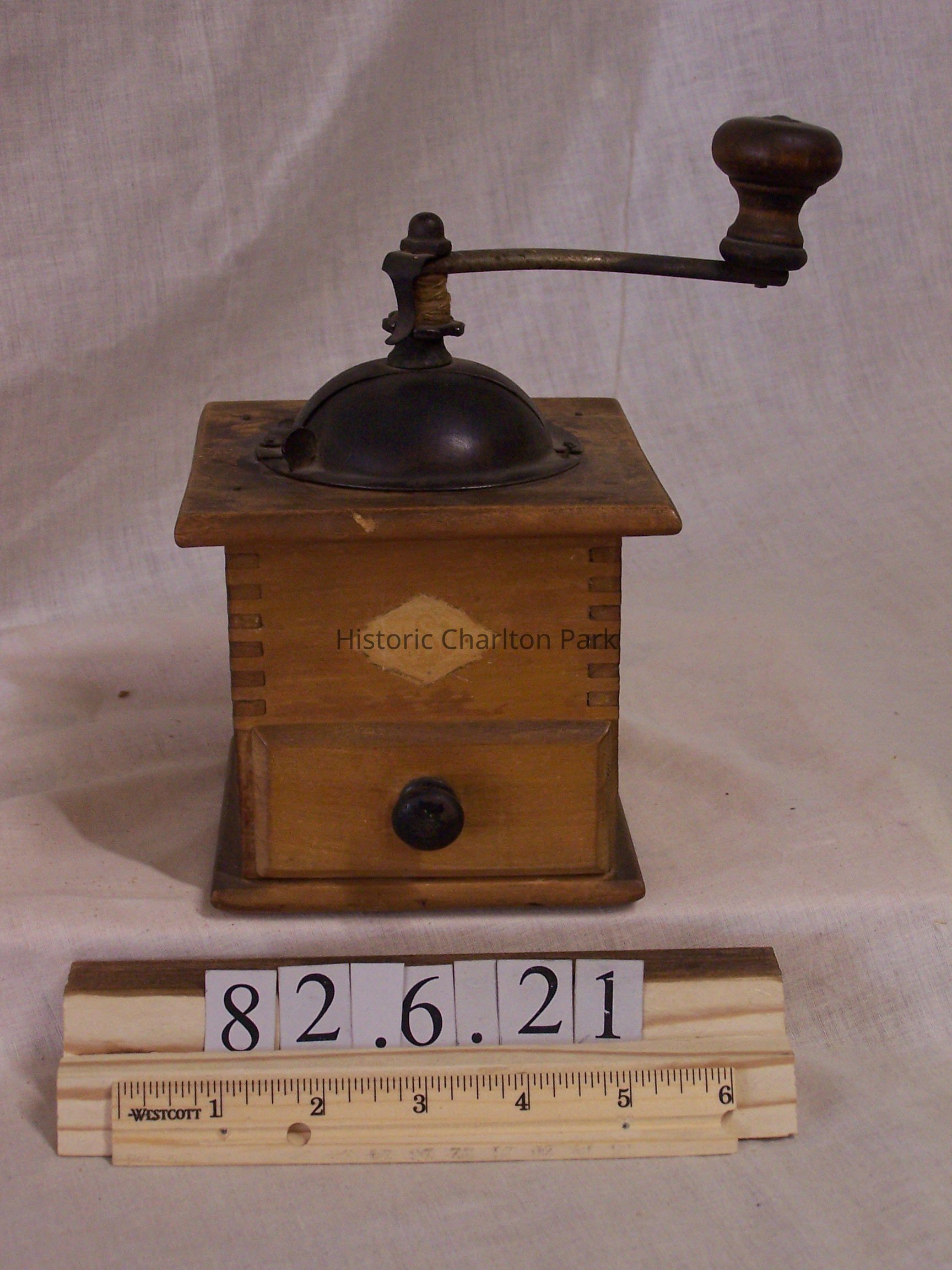 Coffee mill with a wooden body, the box has dovetail joints. The hopper is made out of cast Iron and has a dome, the crank has a wooden handle. On the front is a diamond-shaped logo above a small wooden drawer with a metal knob. The name of the manufacturer is not legible.Acquisition
