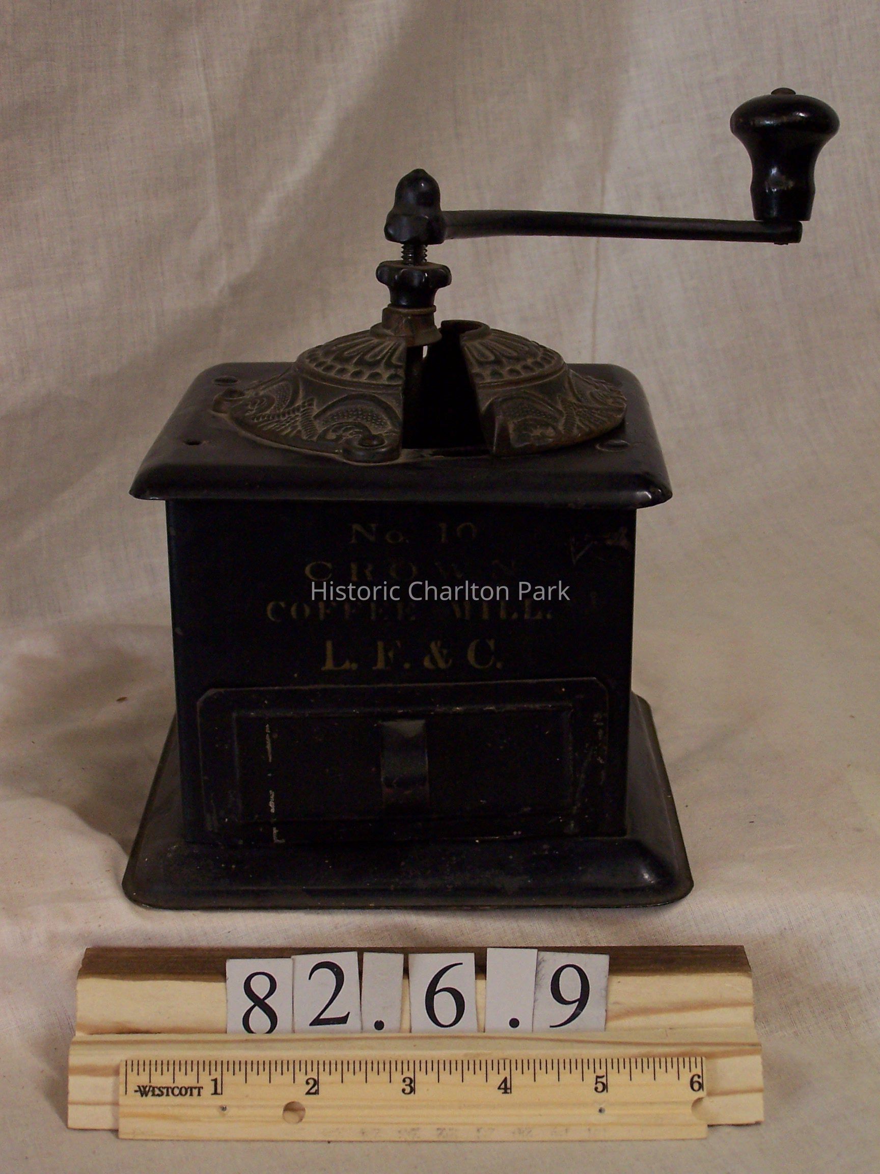 A No.10 Crown Coffee Mill with a metal box and embossed brass top with floral pattern. "No. 10 CROWN COFFEE MILL L.F. & C" printed on the side.