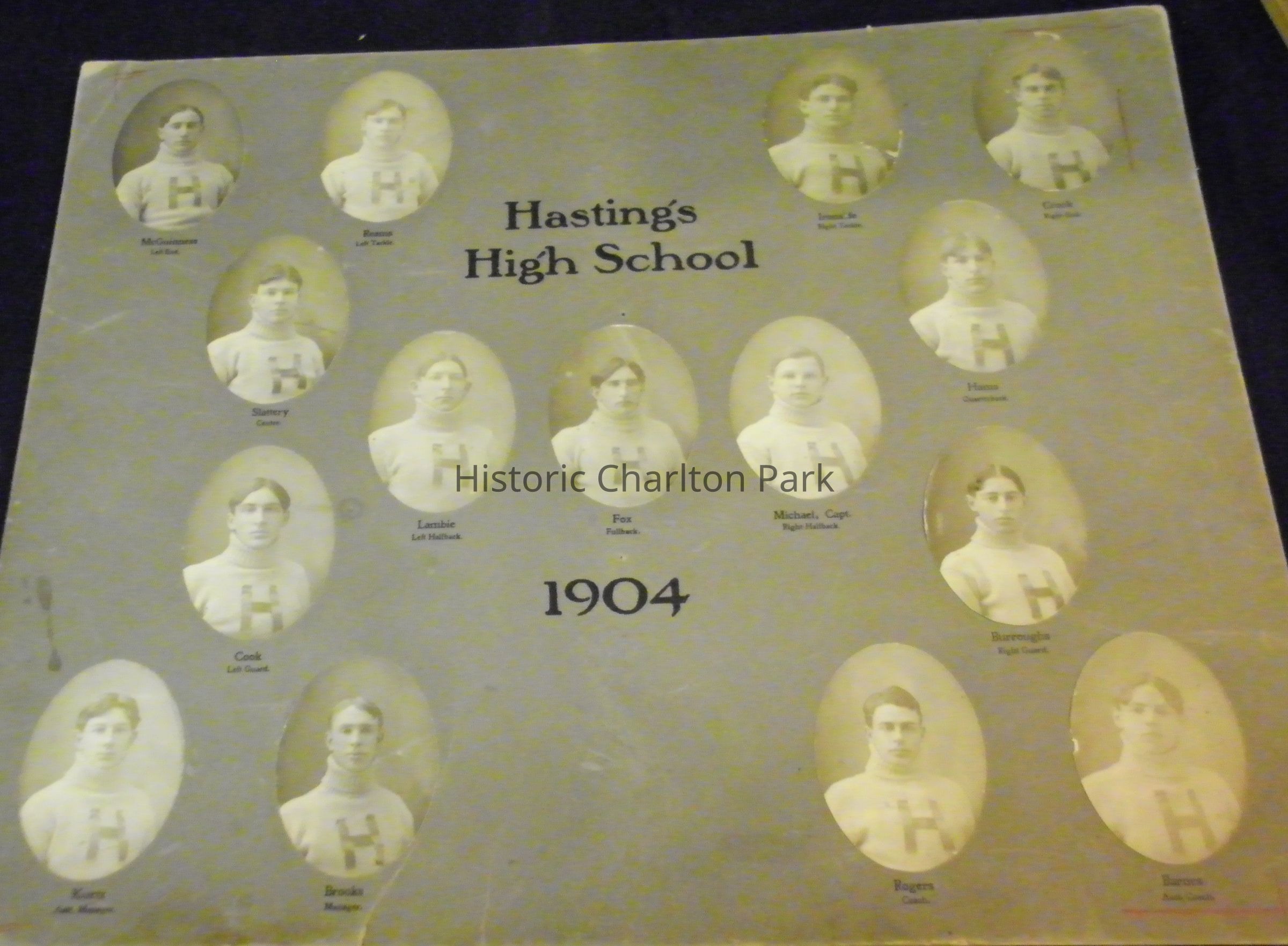 Hastings High School Football Team, 1904. Individual photogaphs (head shots) of boys in turtleneck sweaters. "Hastings High School" and "1904" printed in the center. Each boy is identified by last name and position.