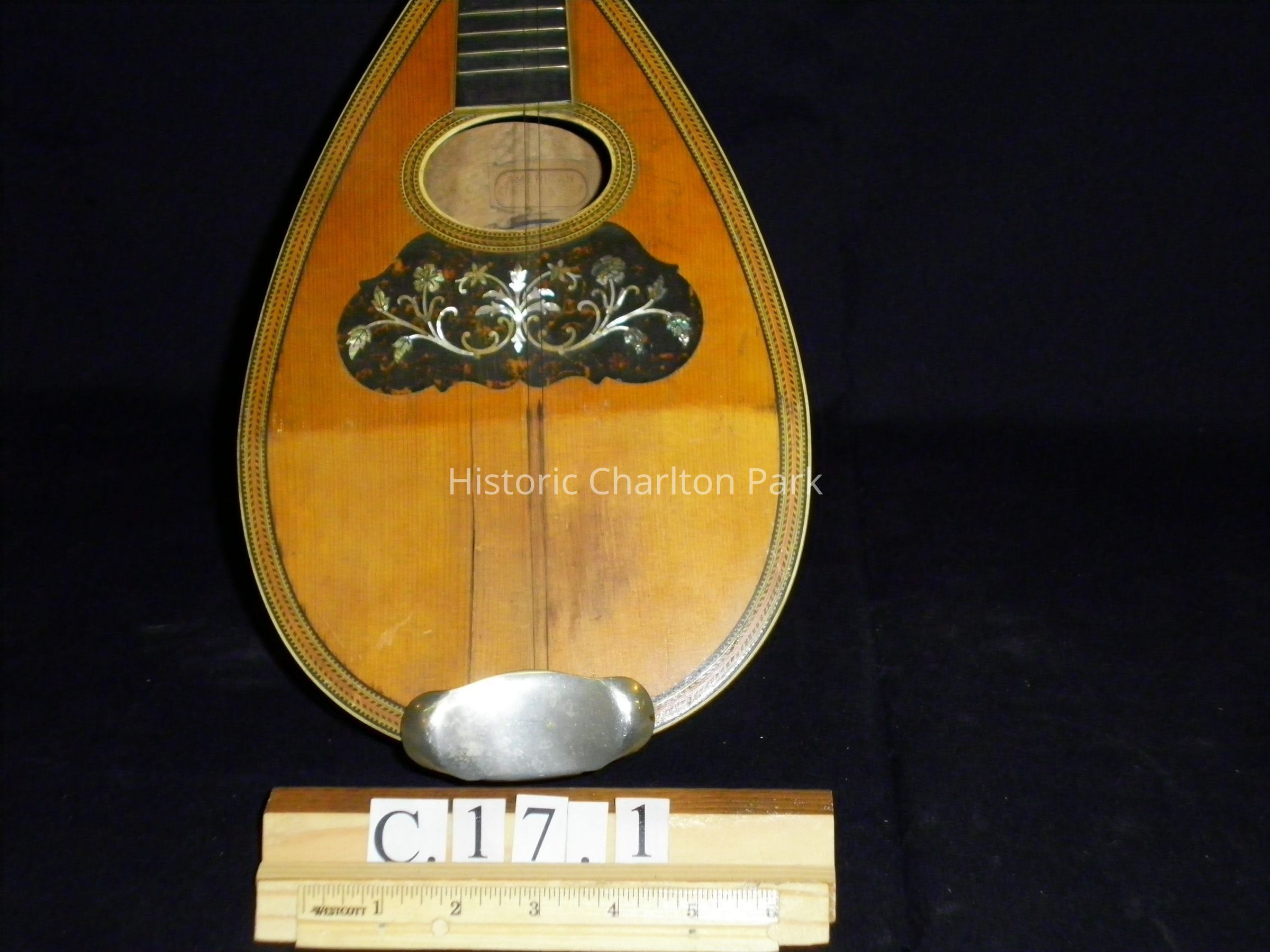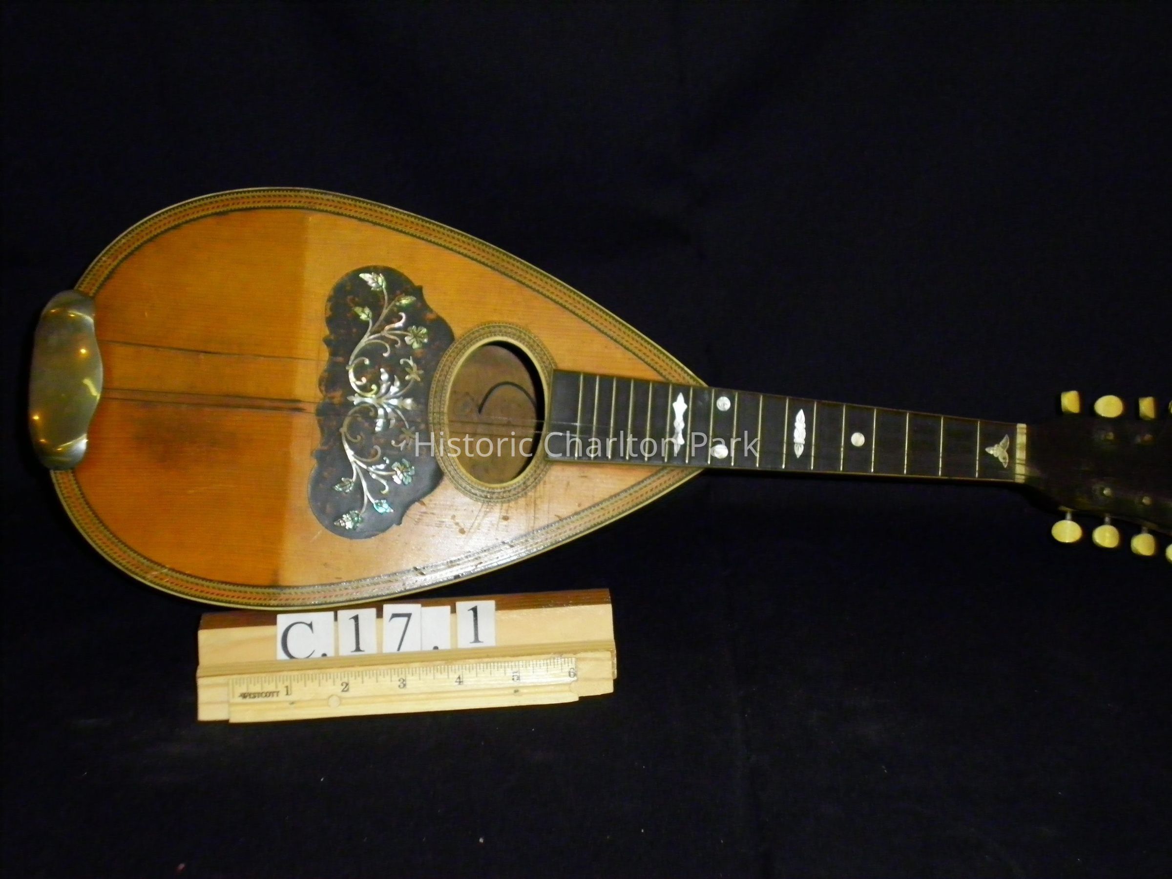 An 8 string mandolin has 3 finger spats. It is shaped like a gourd, 23 inches long, 8 inches wide. It has a pearl inlay design on the body and pearl inlays on the neck, 25 stripes on the back and 8 ivory-colored handle string tighteners. It was made in Detroit, Michigan and has a trademark of American Conservatory. It has a crack in the front.Acquisition