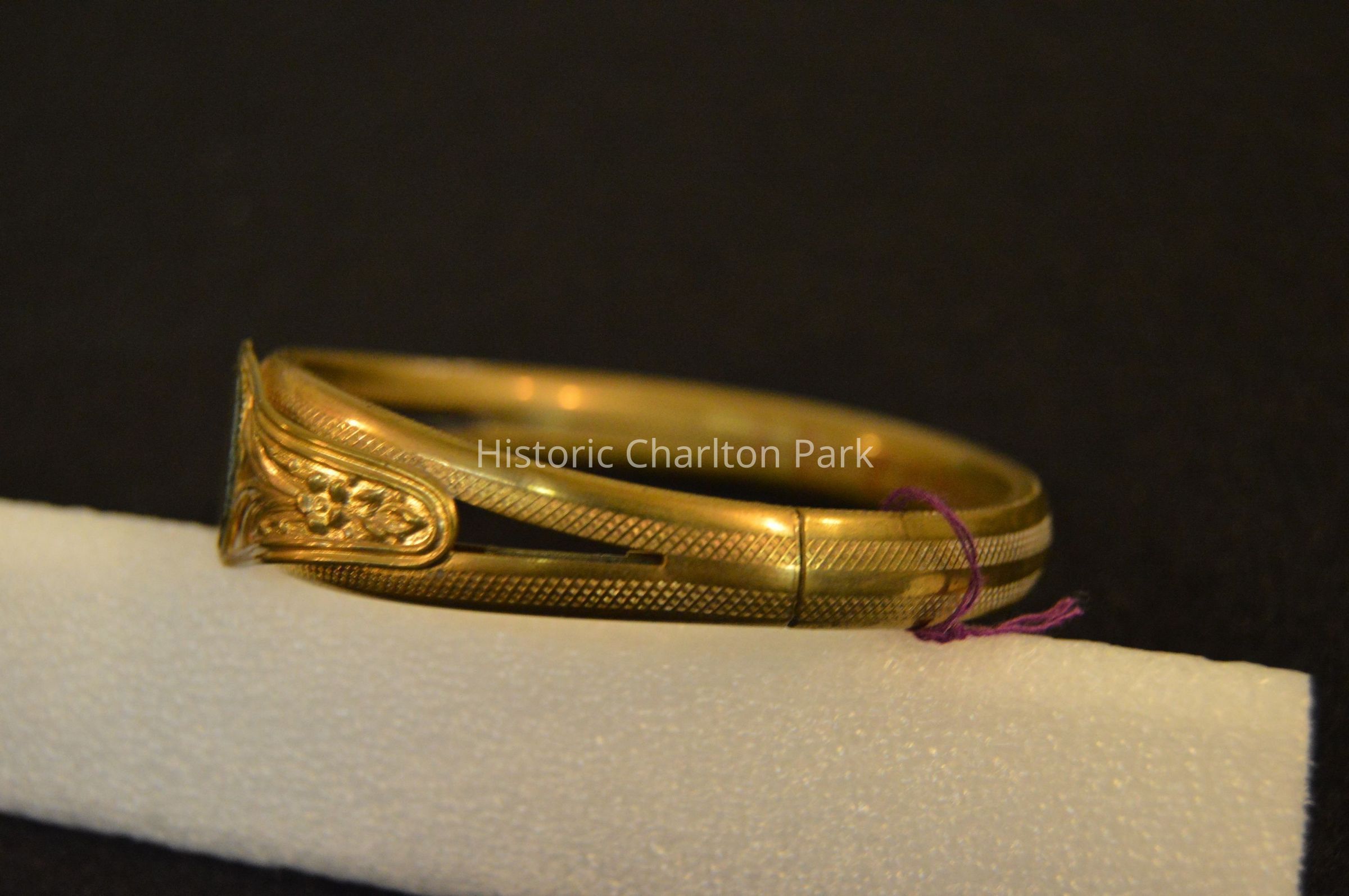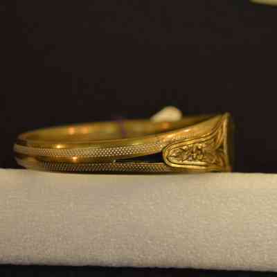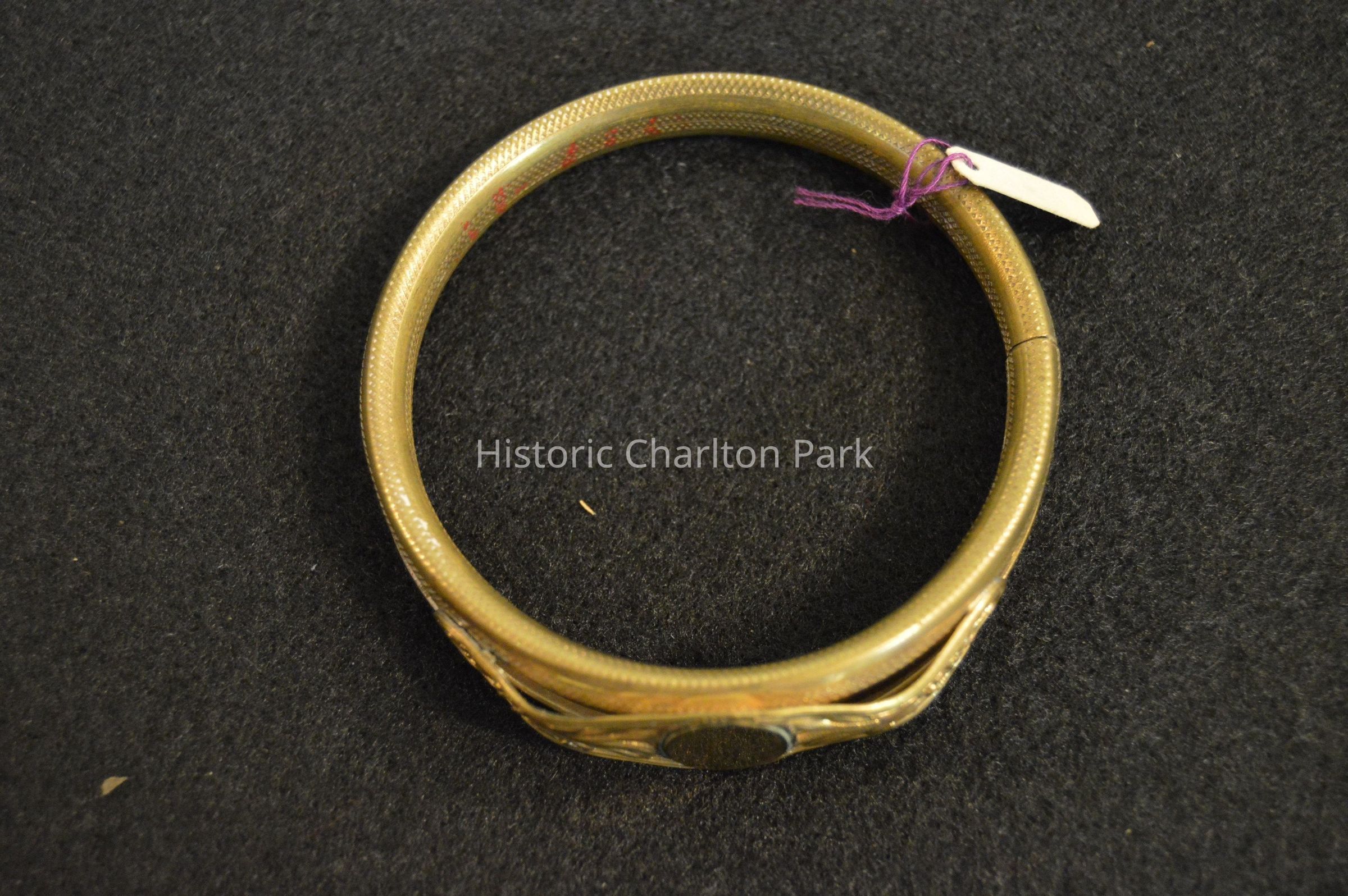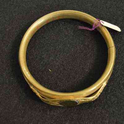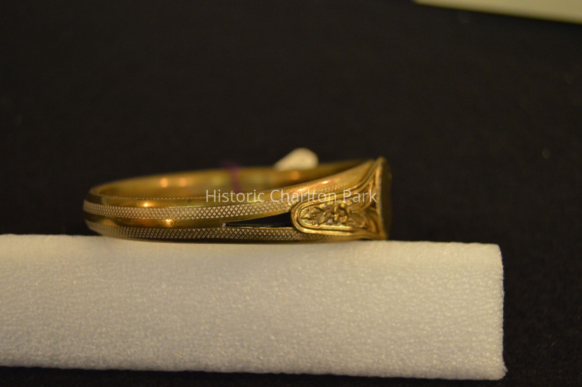 Gold signet bracelet. Lock on side, filigree details around signet space.