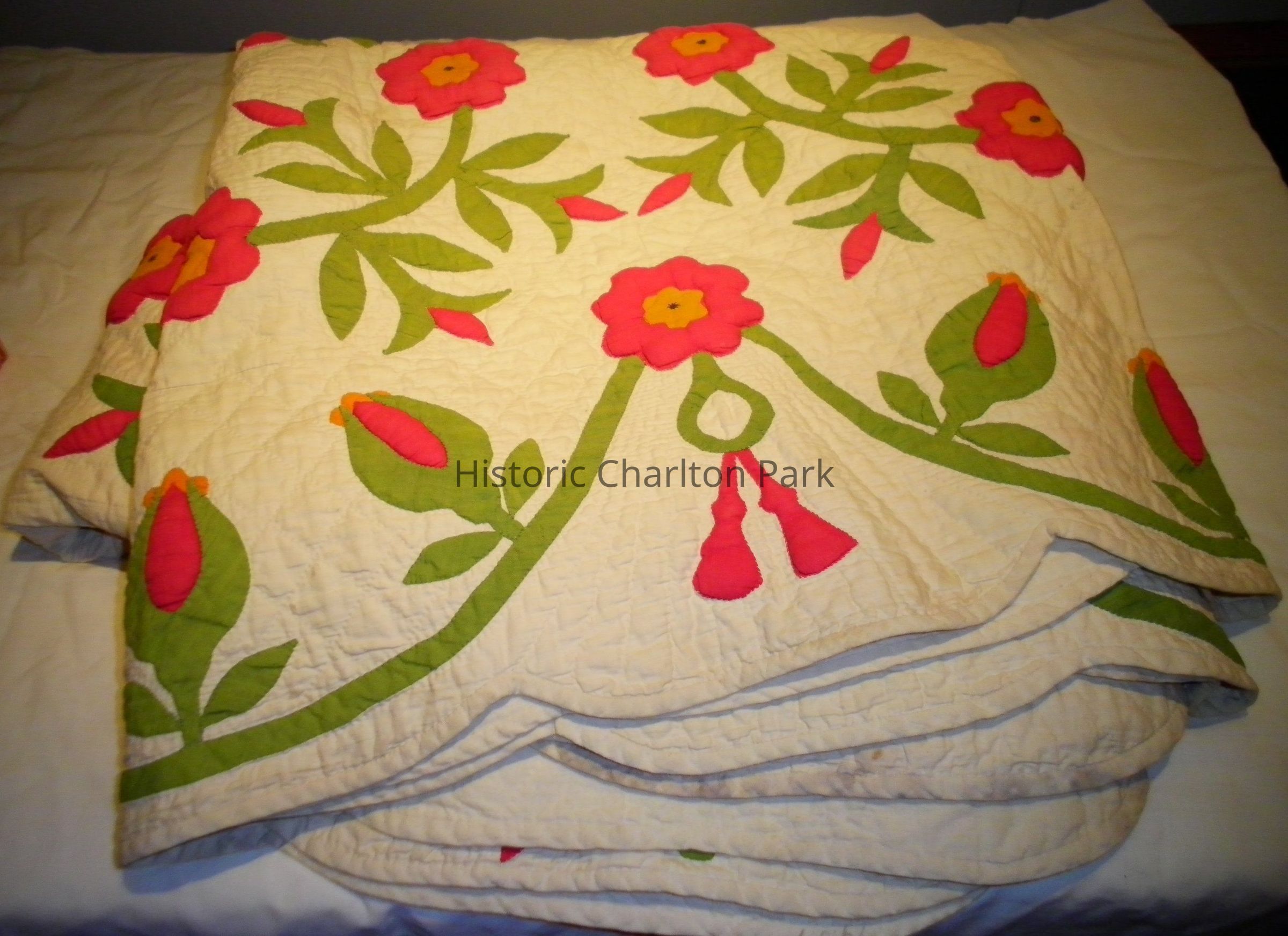 Large appliqued quilt, wreath of roses pattern, with trailing green vines, red flowers and buds and yellow stamen details. Scalloped edge. Given to donor by her grandmother, Mrs. John Wetherell - it was over 100 years old at the time of donation, so likely made 1850-1880.Acquisition