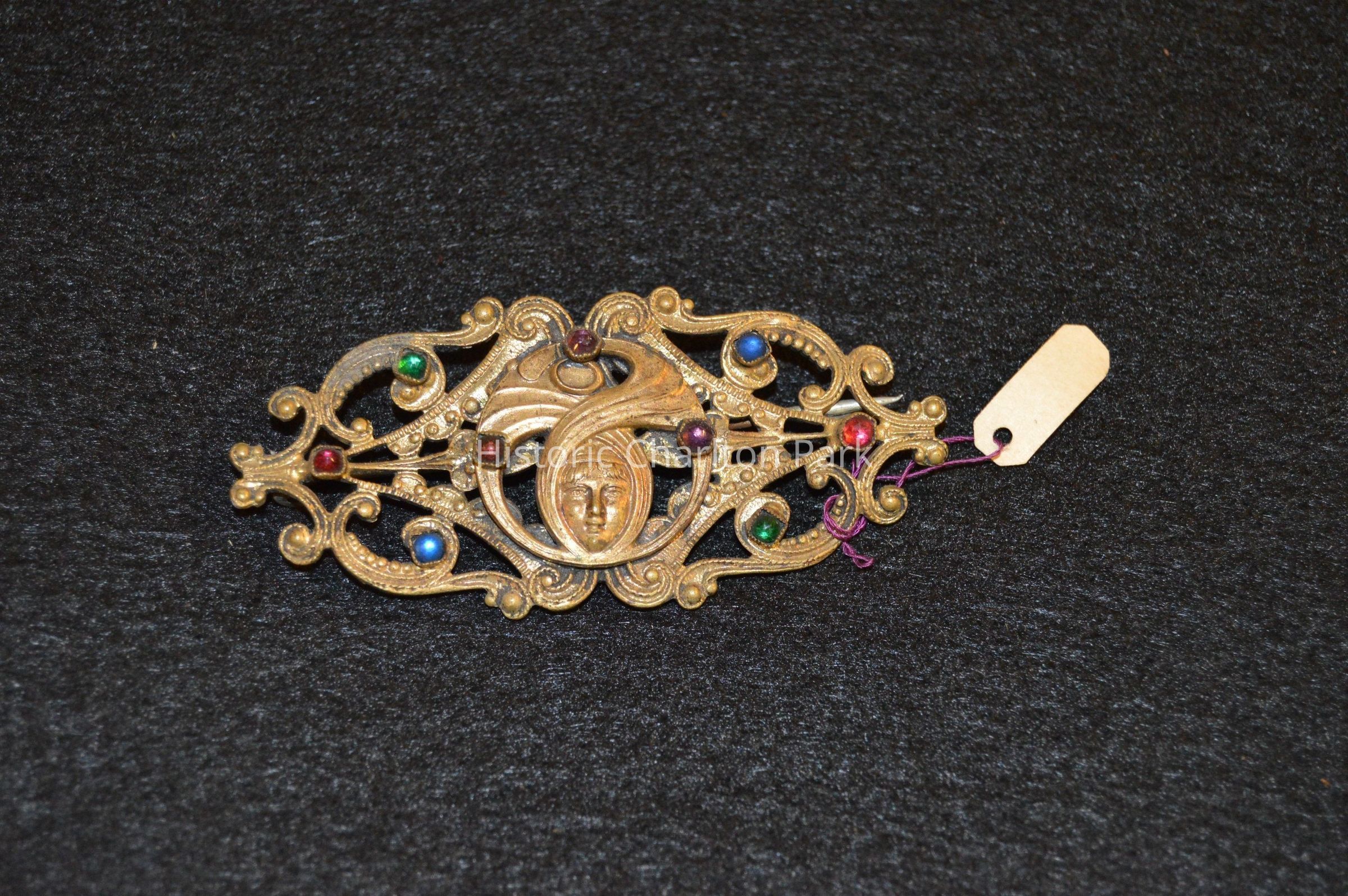 Ornate gold brooch with multiple-colored stones depicting a child's face