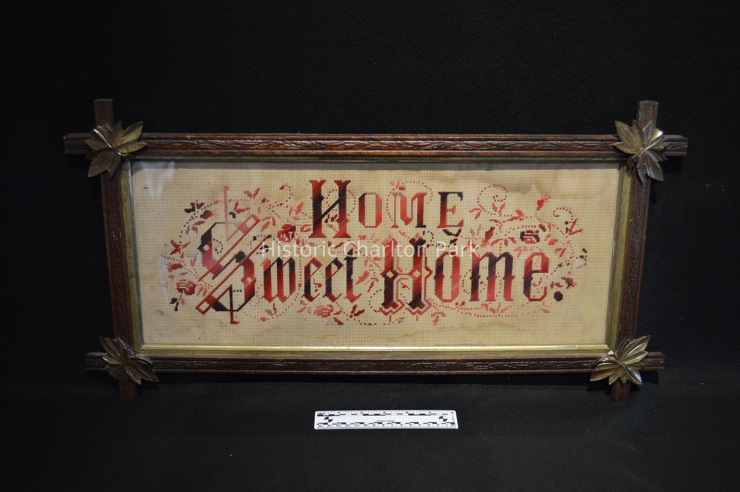 Victorian era motto sampler. "Home Sweet Home" embroidered in shades of red with vines and leaves and other things around it. Frame has a gold edge towards the middle, with 4 sets of leaves, which are brownish gold.