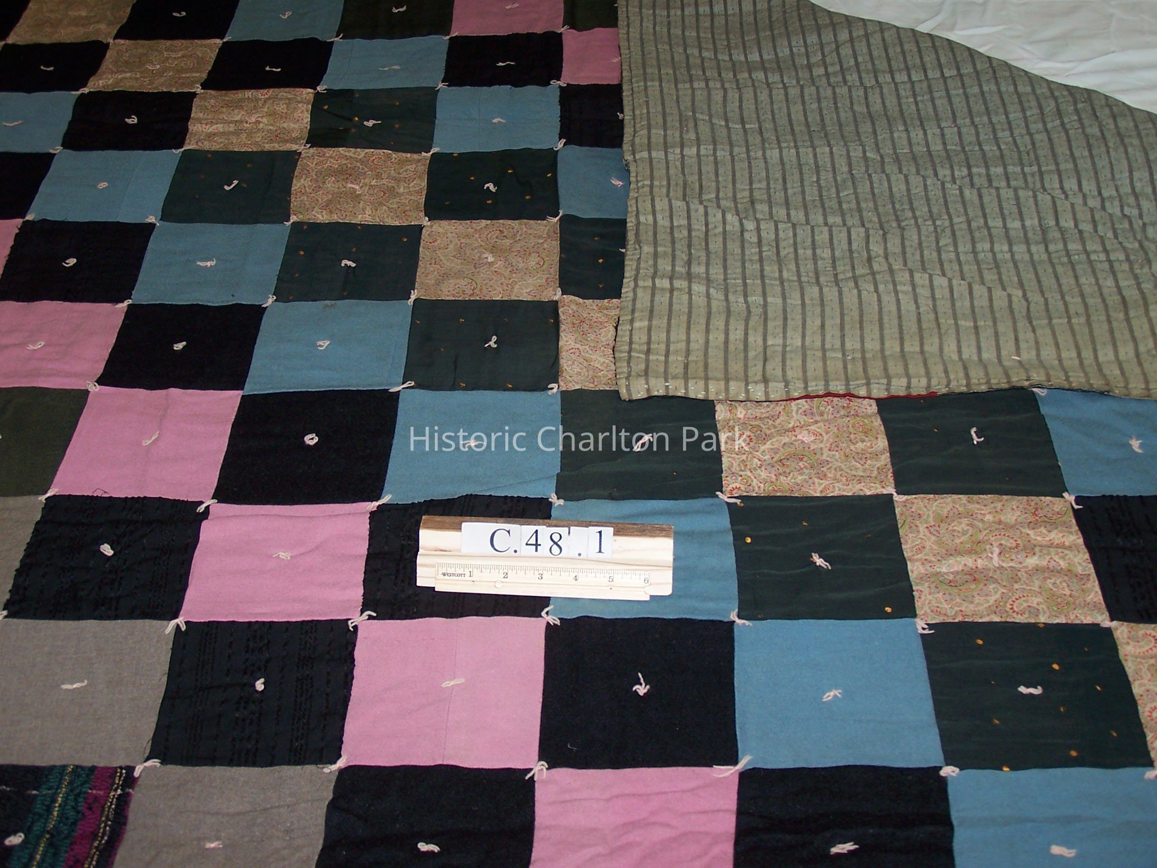 One patch quilt with tied stitch. Made with wool fabric and wool ties on the top. Backing is cotton stripe with feather stitching at the border. This was a utility quilt.Acquisition