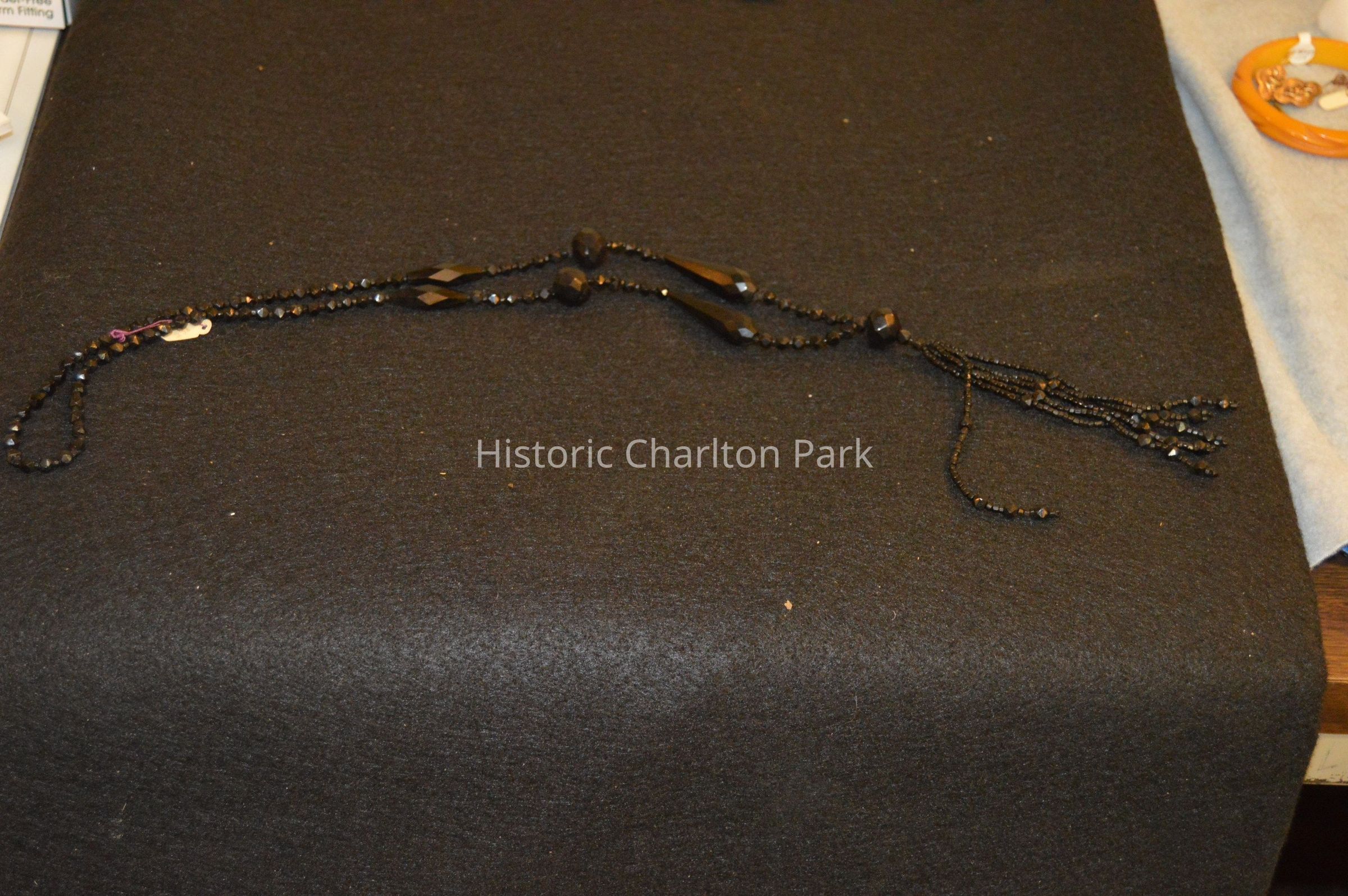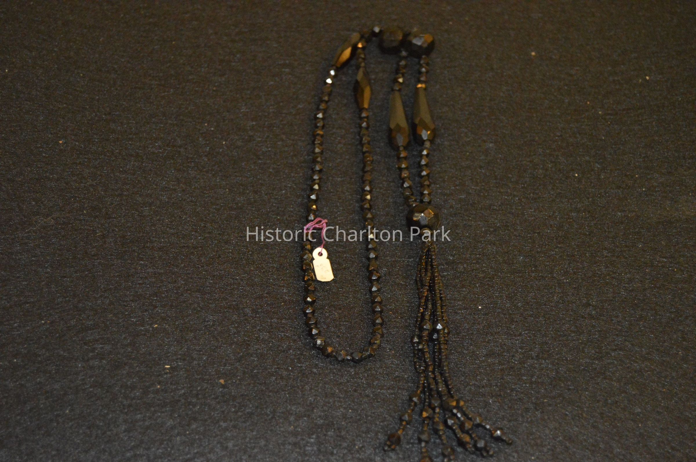 Long black beaded necklace with varying sizes of beads and long tassels of black beads of varying small sizes.