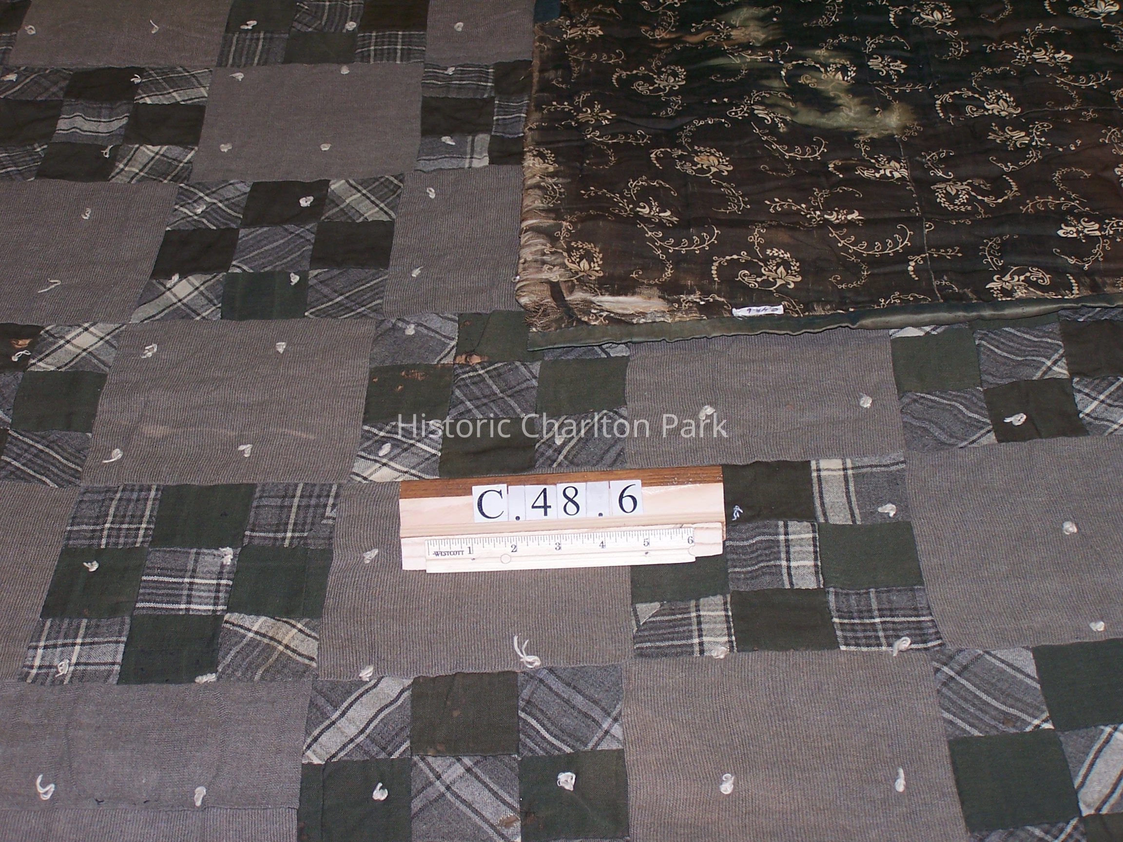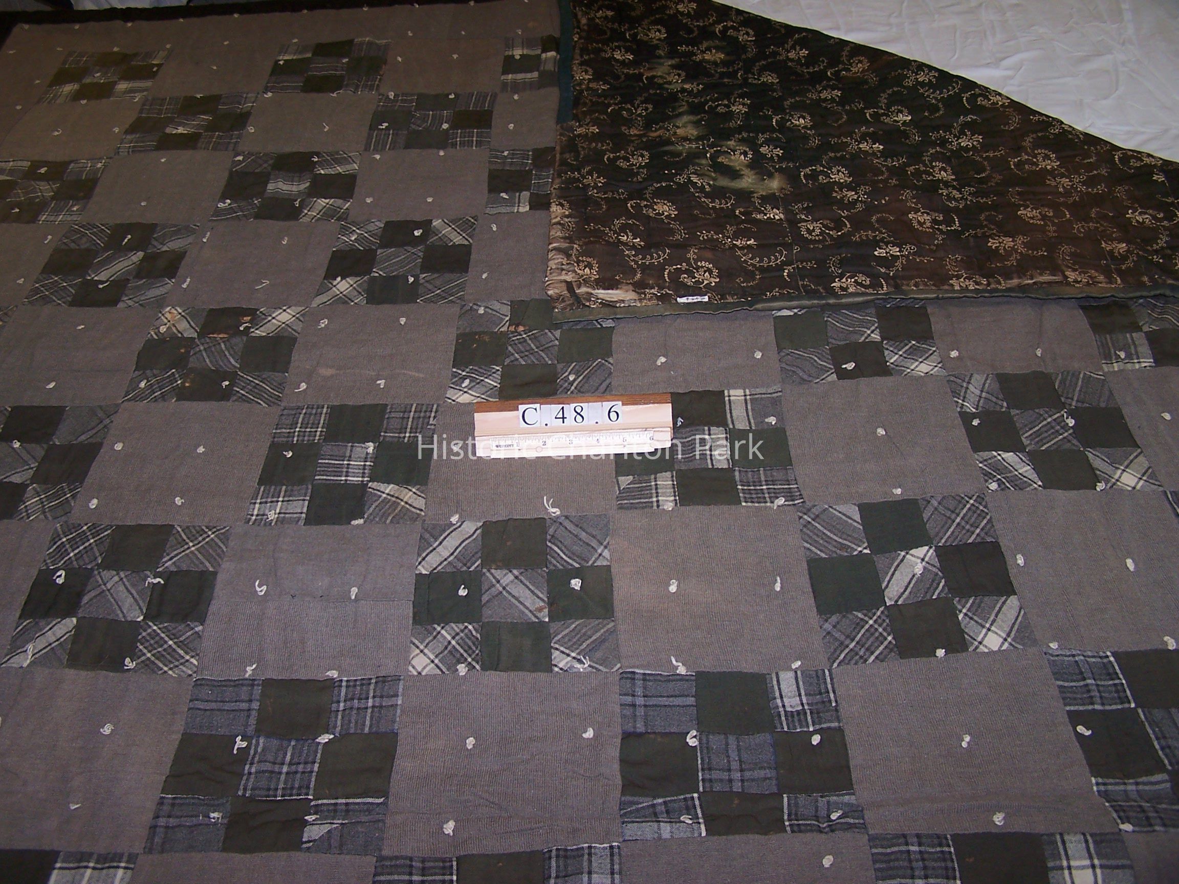 Nine Patch quilt with plain blocks, tied stitch wool, solid & plaids. Backed with a floral print.