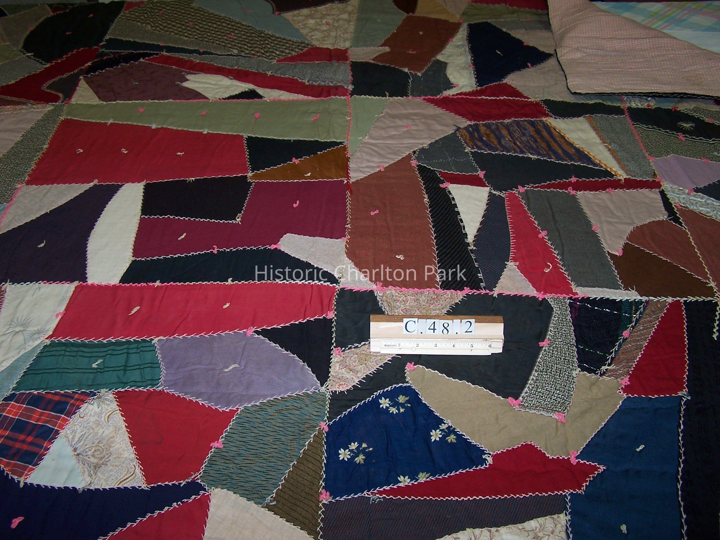 Crazy quilt pattern, made of wool, cotton and rayon. The quilt is flannel backed with pink/white squares. Filler is made of heavy cotton.