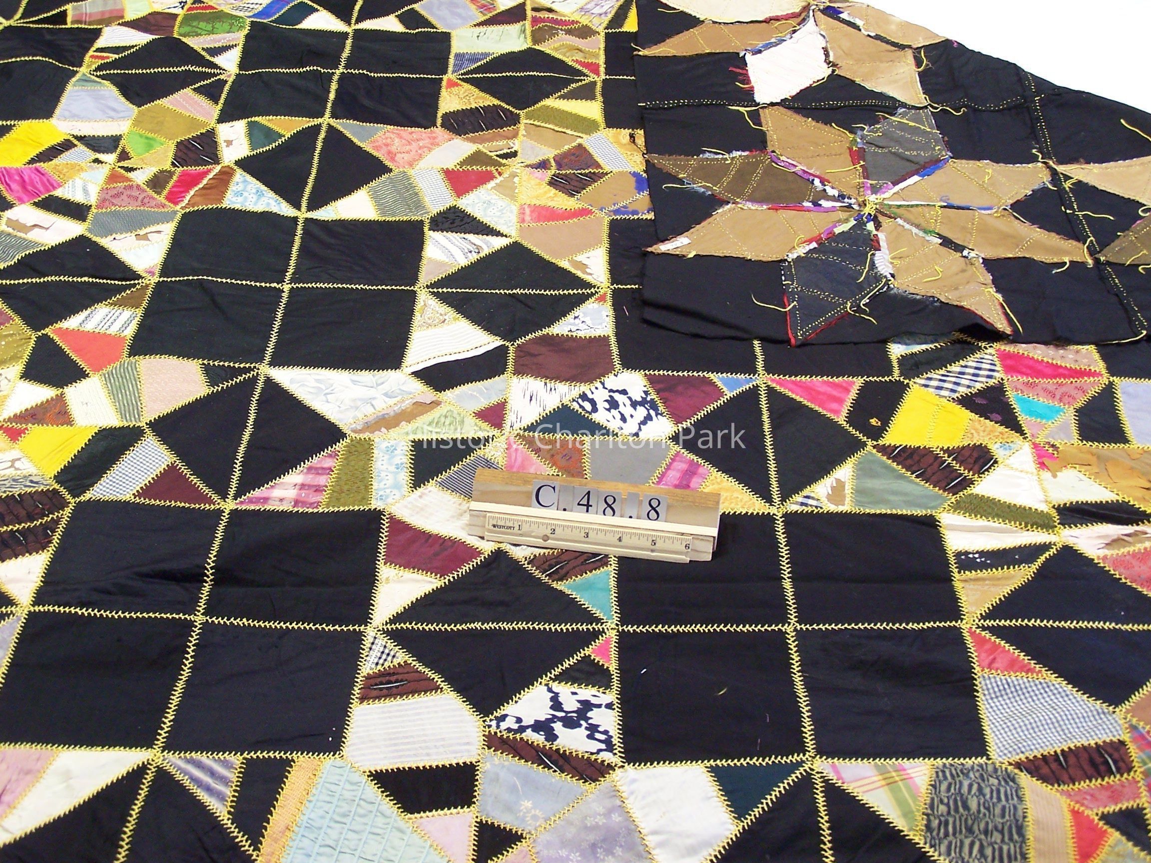 Eight Pointed Star quilt topper, not complete. Embroidery stitches join the pieces together. The top is made of satins and silks.