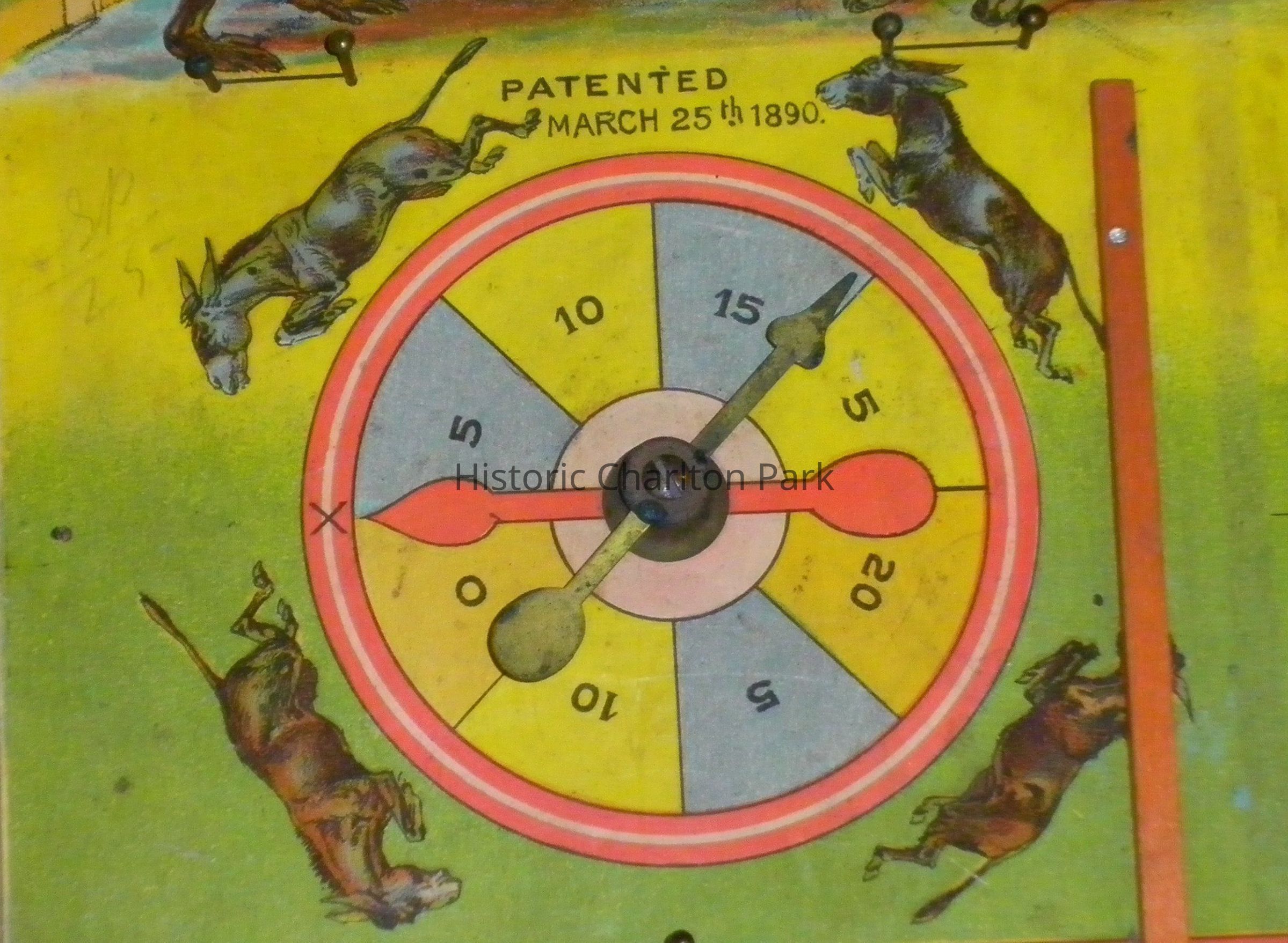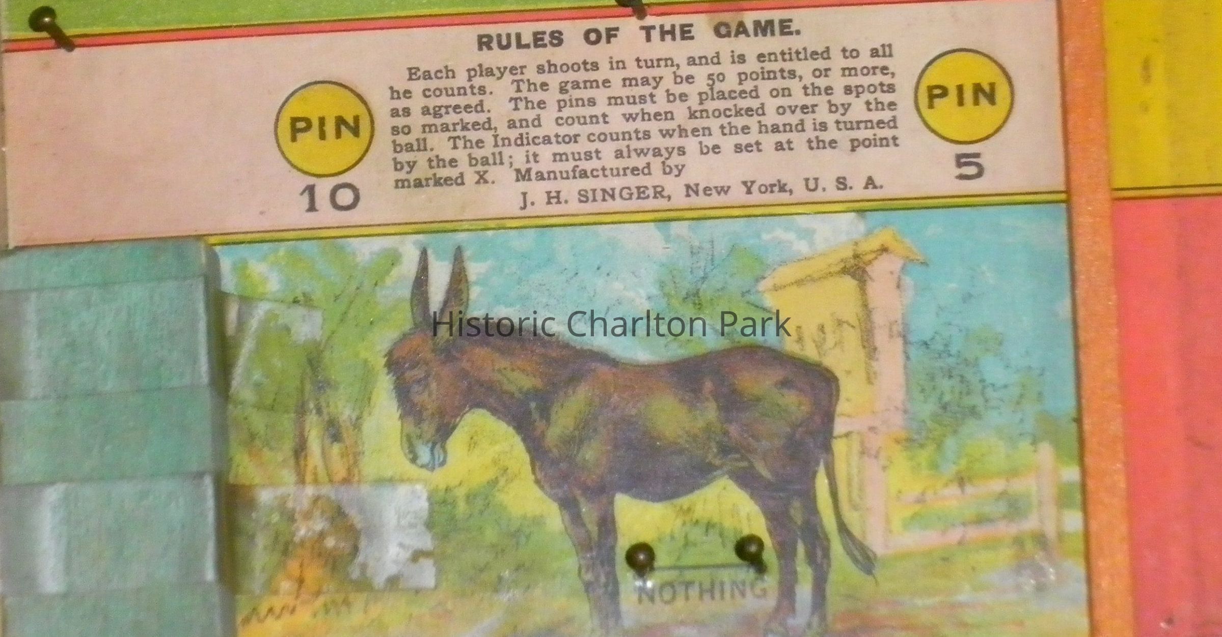 The pinball game is a rectangle shape. There are picture of mules or donkeys, a cat and a monkey on front. Dial in the center of the board with numbered points, 5, 10, 15, 20 and a hand that spins. Numbers along the bottom, 5, 0, 5, 10, 0. Plunger with pin spring loaded to punch marbles. Multiple colors including red, orange, yellow, green, blue, purple.