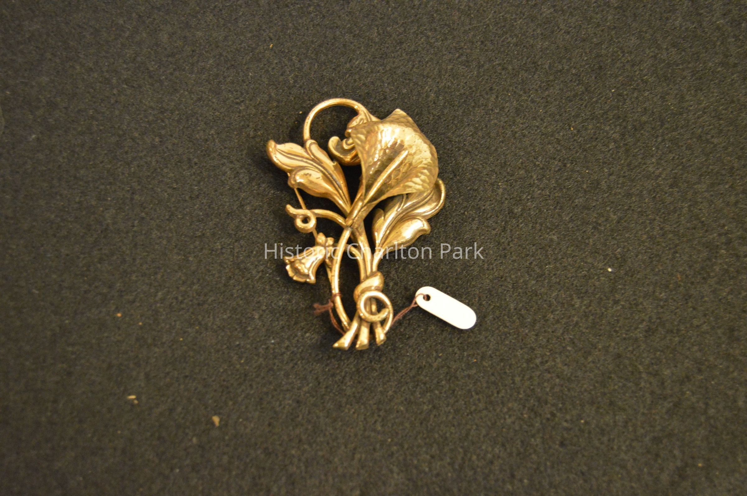 Gold calla lily brooch with leaf accents.