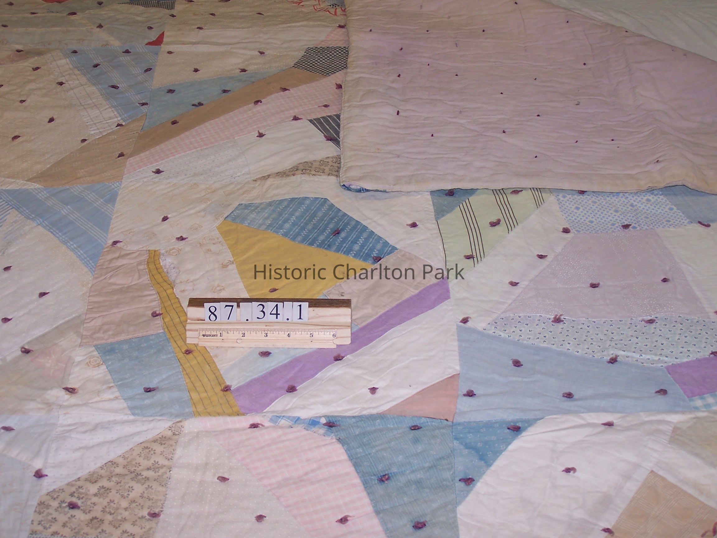 Crazy quilt with tied stitch. Fabric is cotton, with some curtain material, 30 blocks - 5 blocks long by 4 blocks wide. Possibly feed sack backing. The filler is batting in cheesecloth liner. Hard times quilt, machine stitched, little or no foundation, wool ties.