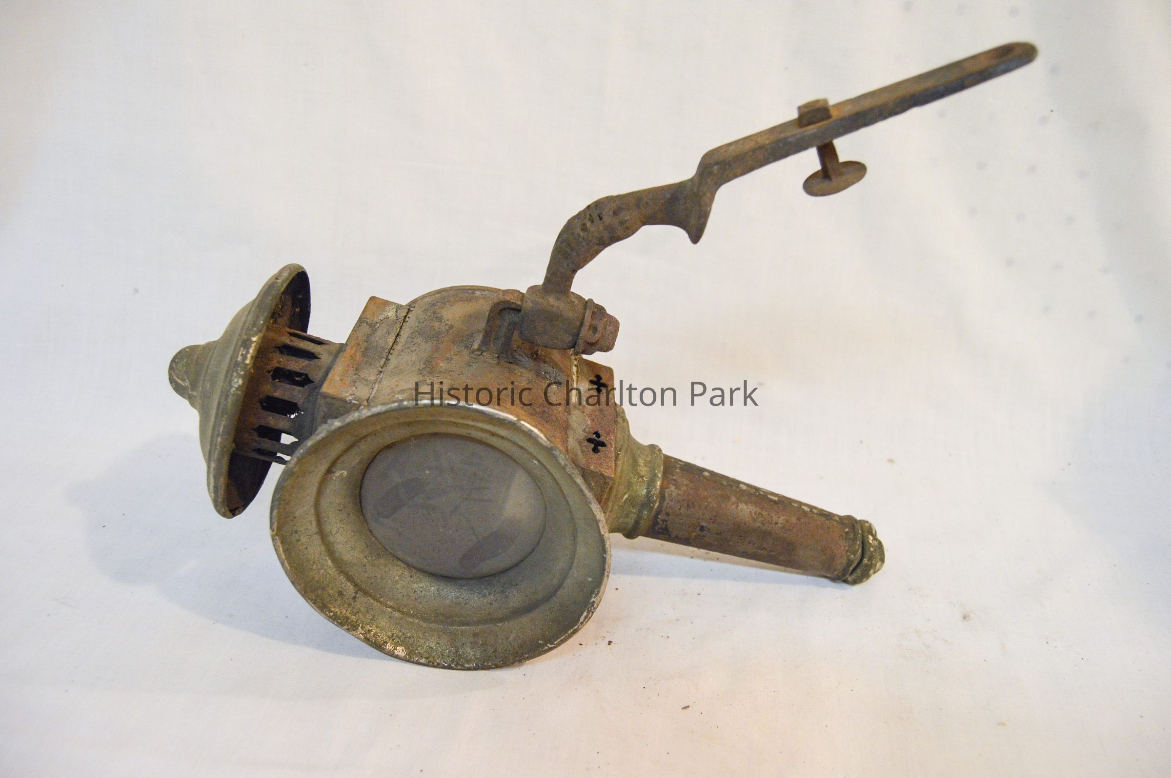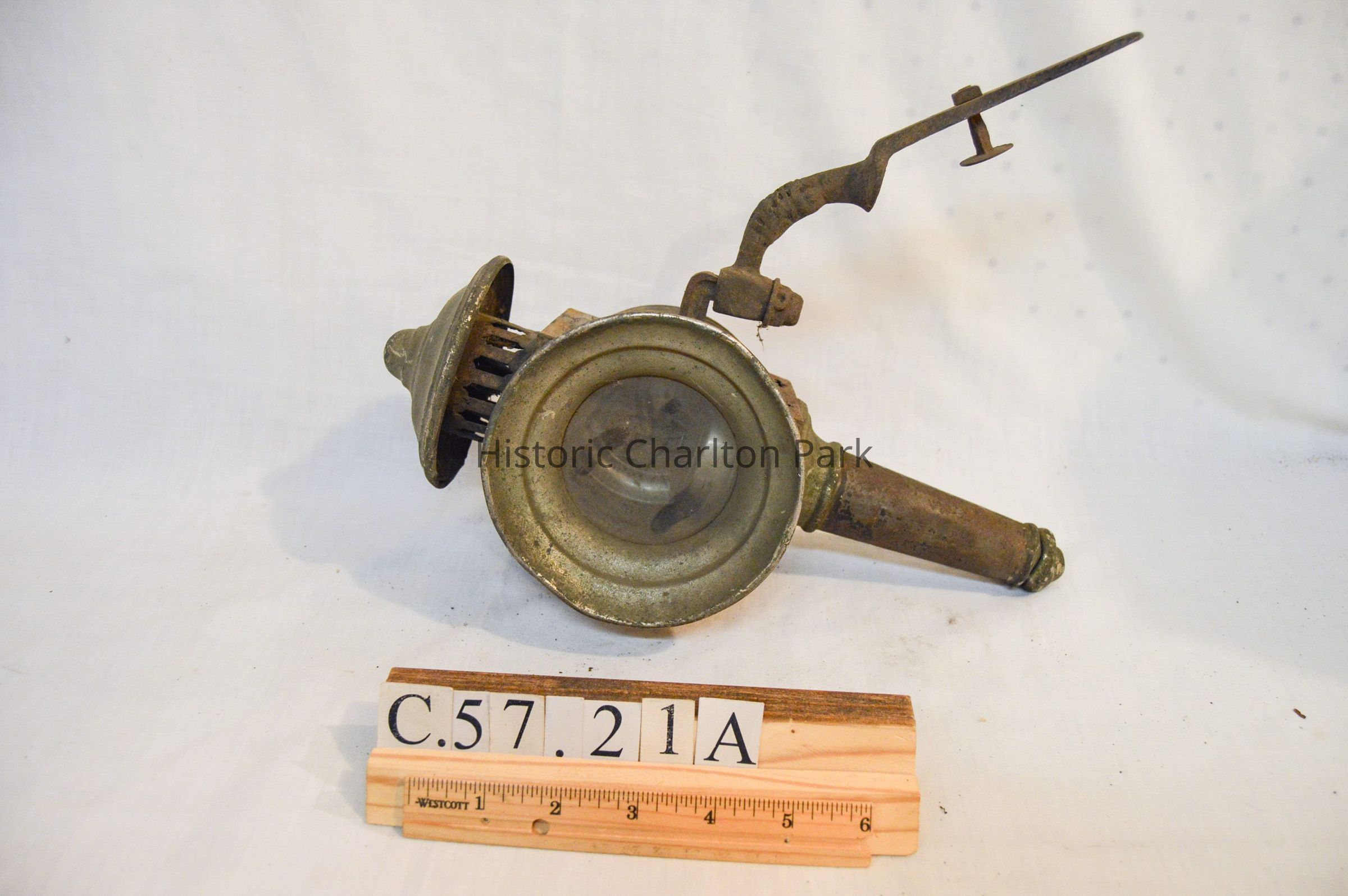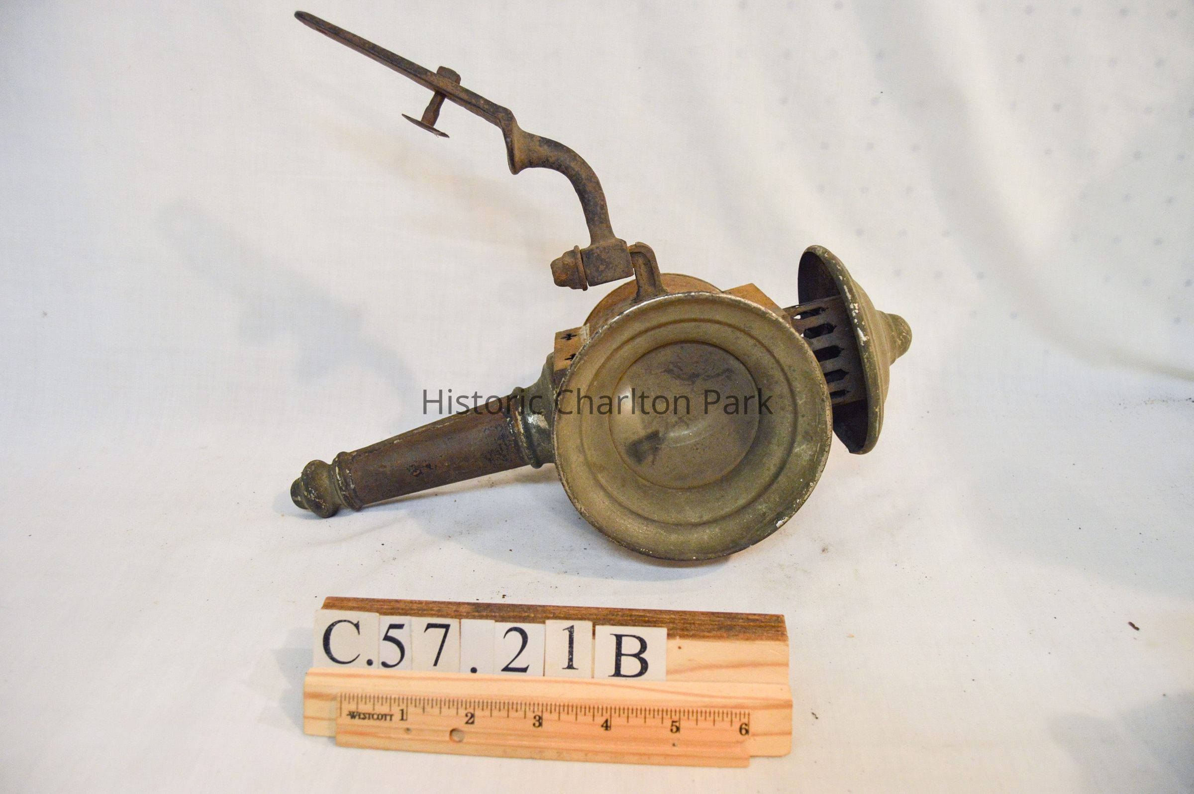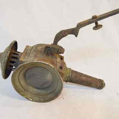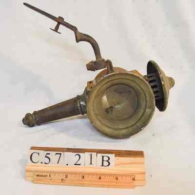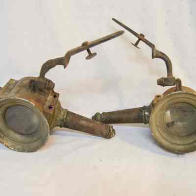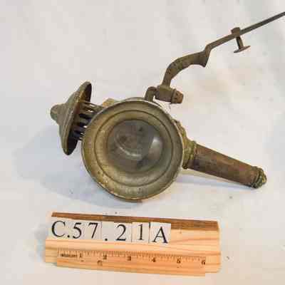 Two kerosene driving lamps made of metal and glass (A-B). A: The lamp has a thin, cylindrical base that supports the body of the lamp. The body is also cylindrical, but has a horizontal orientation. There is a cone-shaped opening at the front of the lamp with a circular glass reflector. The reflector housing swings open on a hinge at the top and clasps at the bottom. The right side of the object has a diamond-shaped, red glass reflector. The left side has a bracket with an arm attached used for mounting to a vehicle. The bracket extends downward at a 45 degree angle. The top of the lamp is cylindrical and has a bell-shaped cap at the top. The cylindrical portion has vertical vents around it. B: Object B is a mirrored version of object A.Dimensions