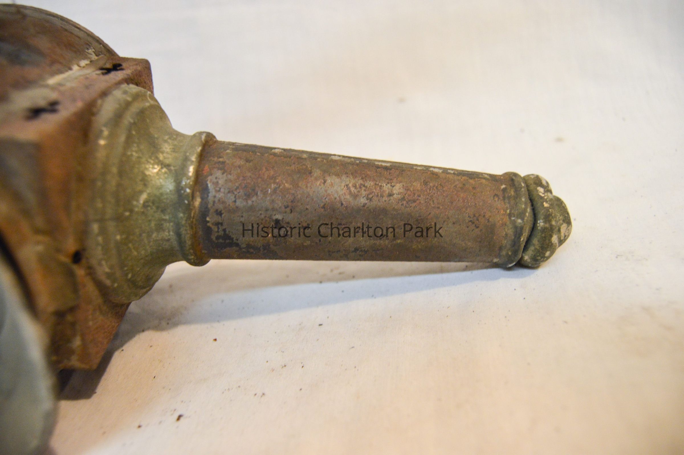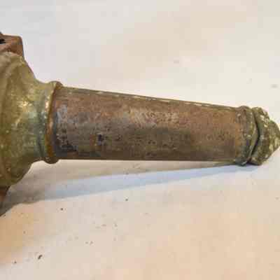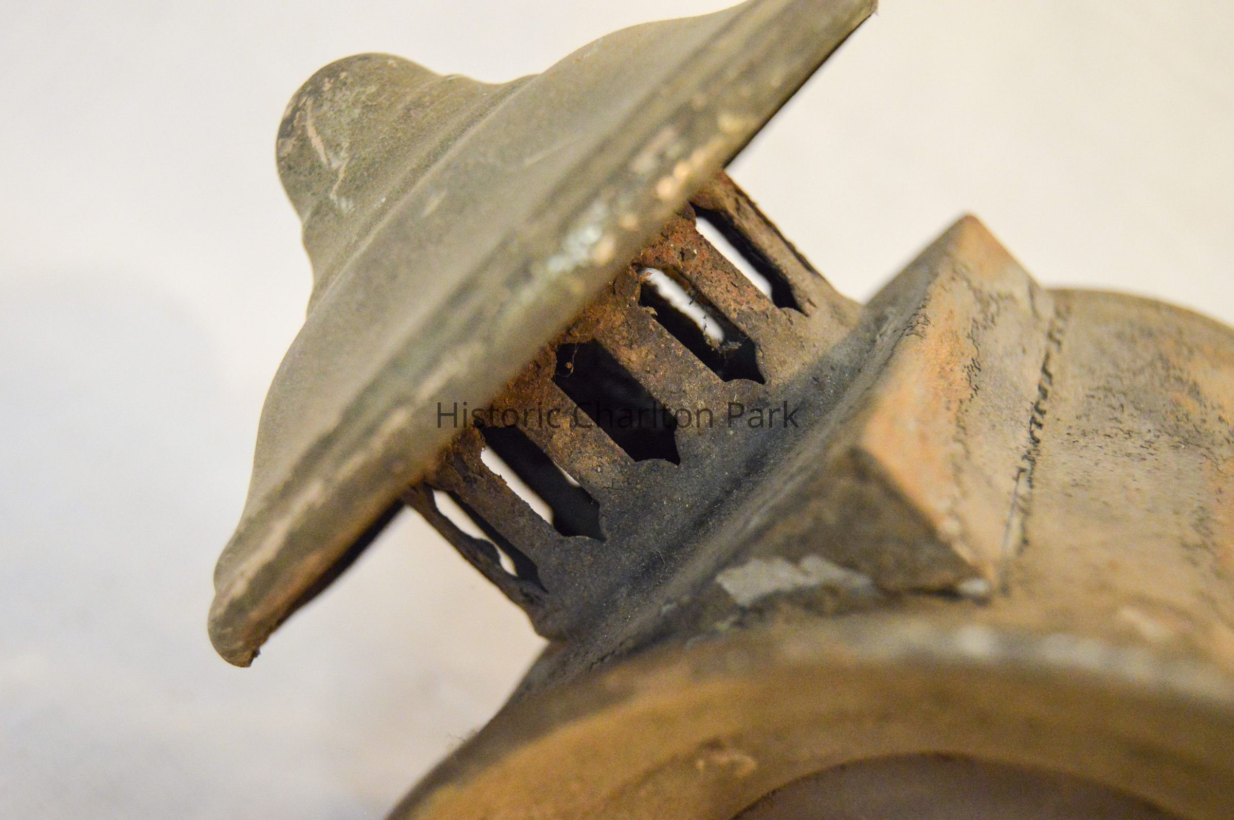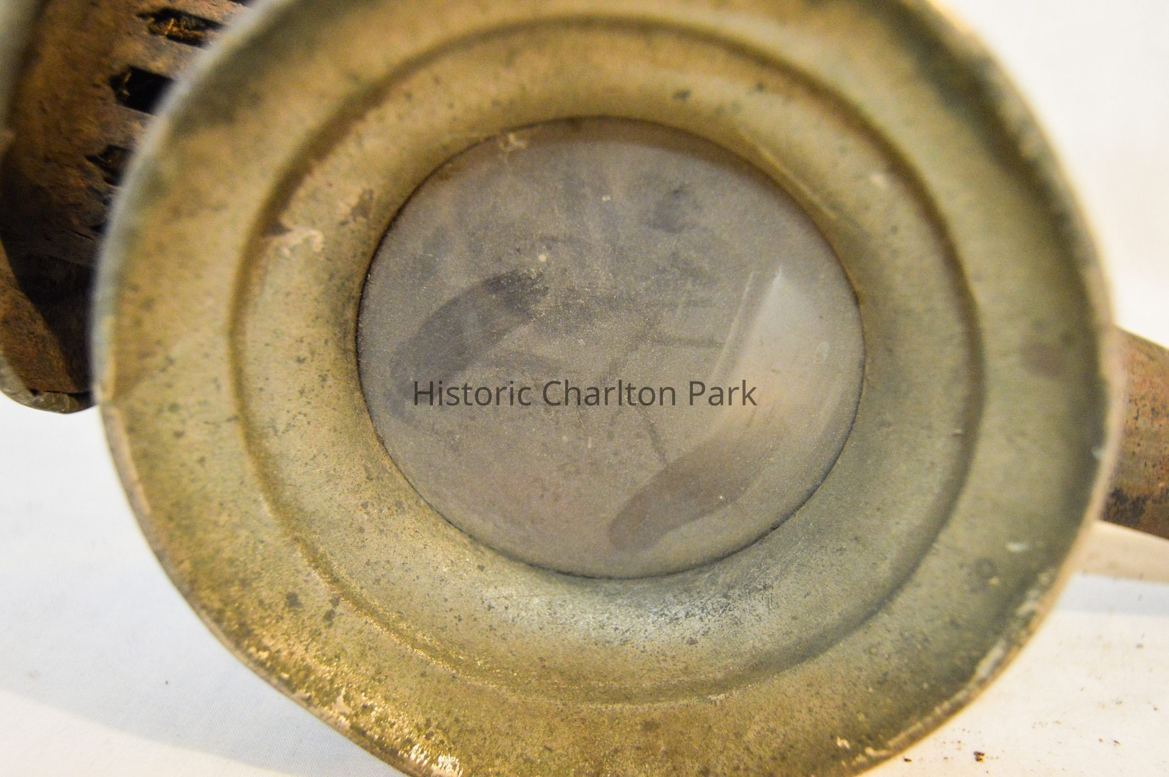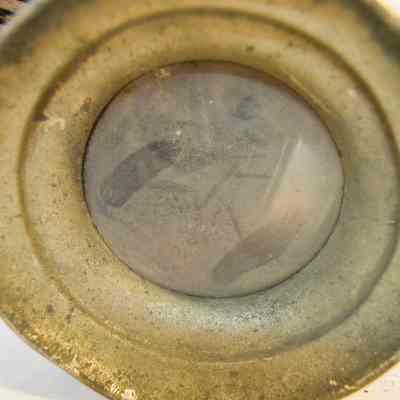 Two kerosene driving lamps made of metal and glass (A-B). A: The lamp has a thin, cylindrical base that supports the body of the lamp. The body is also cylindrical, but has a horizontal orientation. There is a cone-shaped opening at the front of the lamp with a circular glass reflector. The reflector housing swings open on a hinge at the top and clasps at the bottom. The right side of the object has a diamond-shaped, red glass reflector. The left side has a bracket with an arm attached used for mounting to a vehicle. The bracket extends downward at a 45 degree angle. The top of the lamp is cylindrical and has a bell-shaped cap at the top. The cylindrical portion has vertical vents around it. B: Object B is a mirrored version of object A.Dimensions