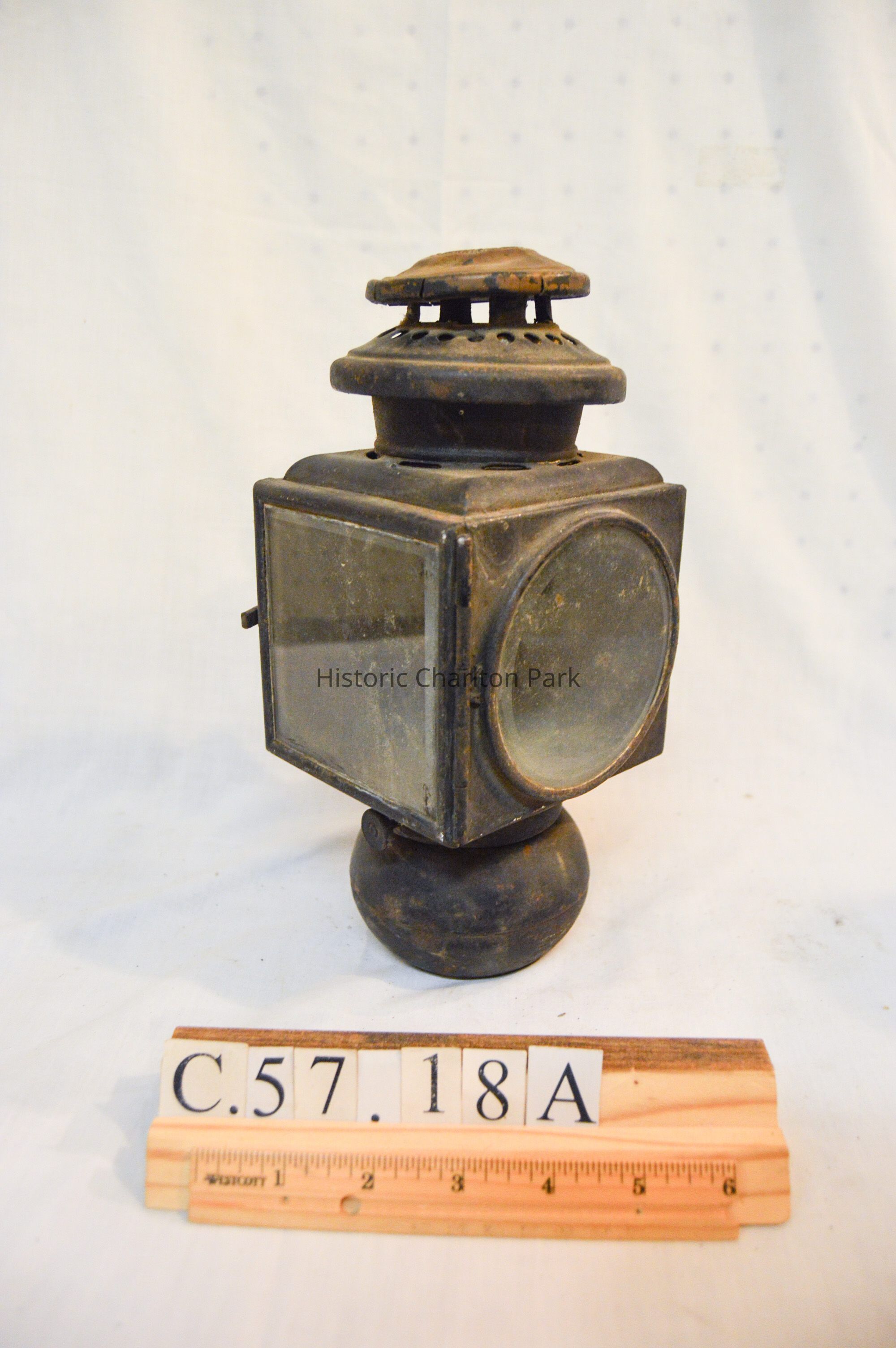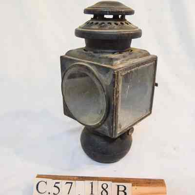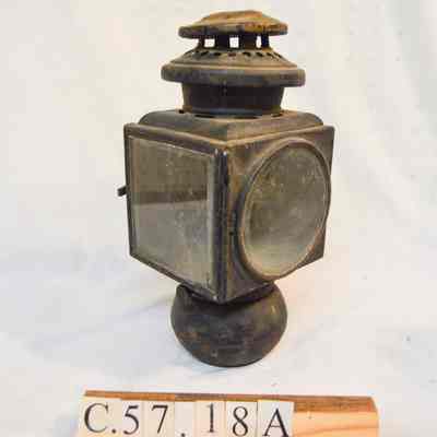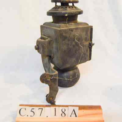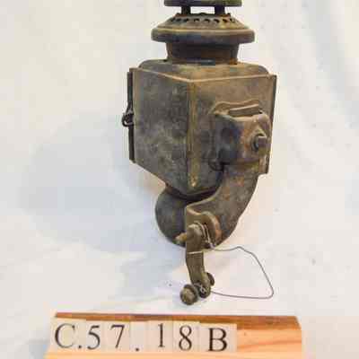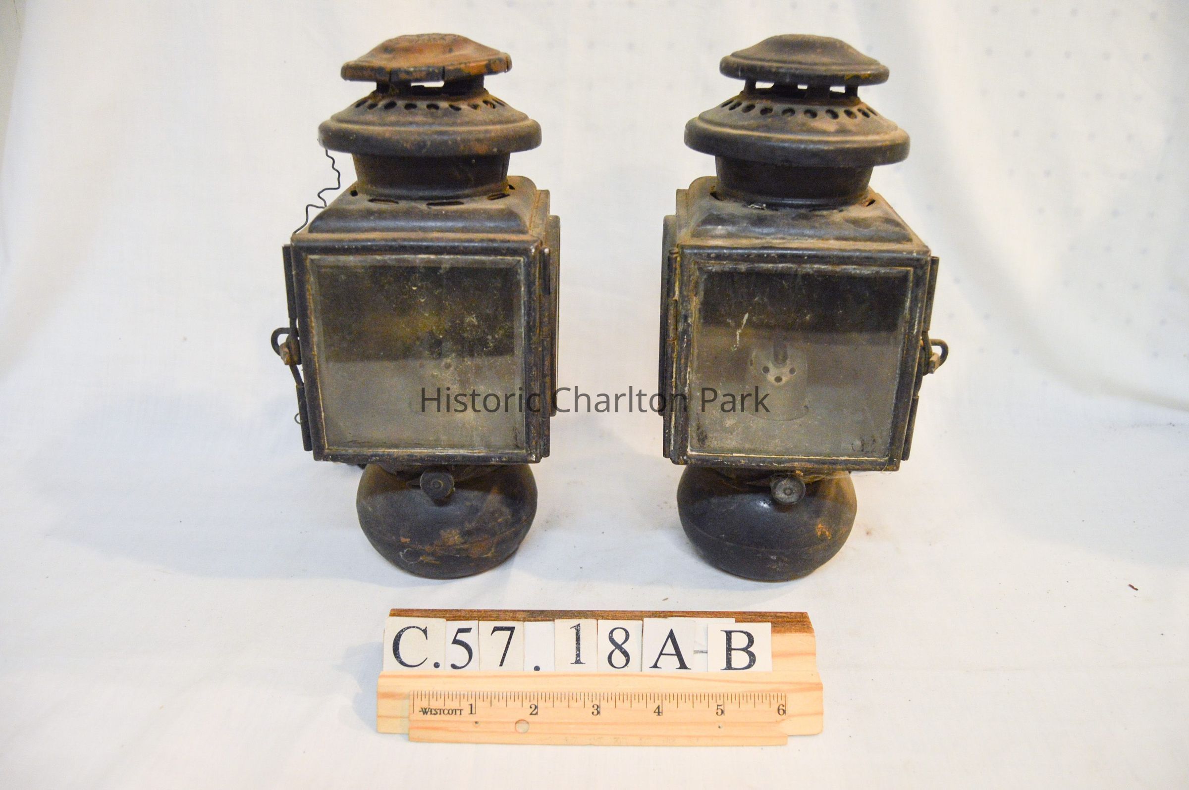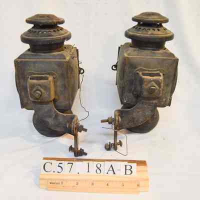 Two mounted kerosene driving lamps (A-B). A: The base of the lamp is somewhat spherical, and has a flat, circular bottom. It holds up the body, which is cube-shaped and has two metal sides and two glass sides. The one glass side is square, whereas the other is circular. The square glass side opens on a hinge and clasps closed. One of the metal sides is completely flat and the other has a bracket in the center. The brack has an arm attached to it, which extends downards and to the left. The arm has two bolts on it, and a twisted metal wire attached. The top of the lamp is dome-shaped and has two layered discs. The bottom disc has circular vents around the top and the top disc has an inscription. B: Object B is identical to object A, just mirrored.Inscription/Signature/Marks