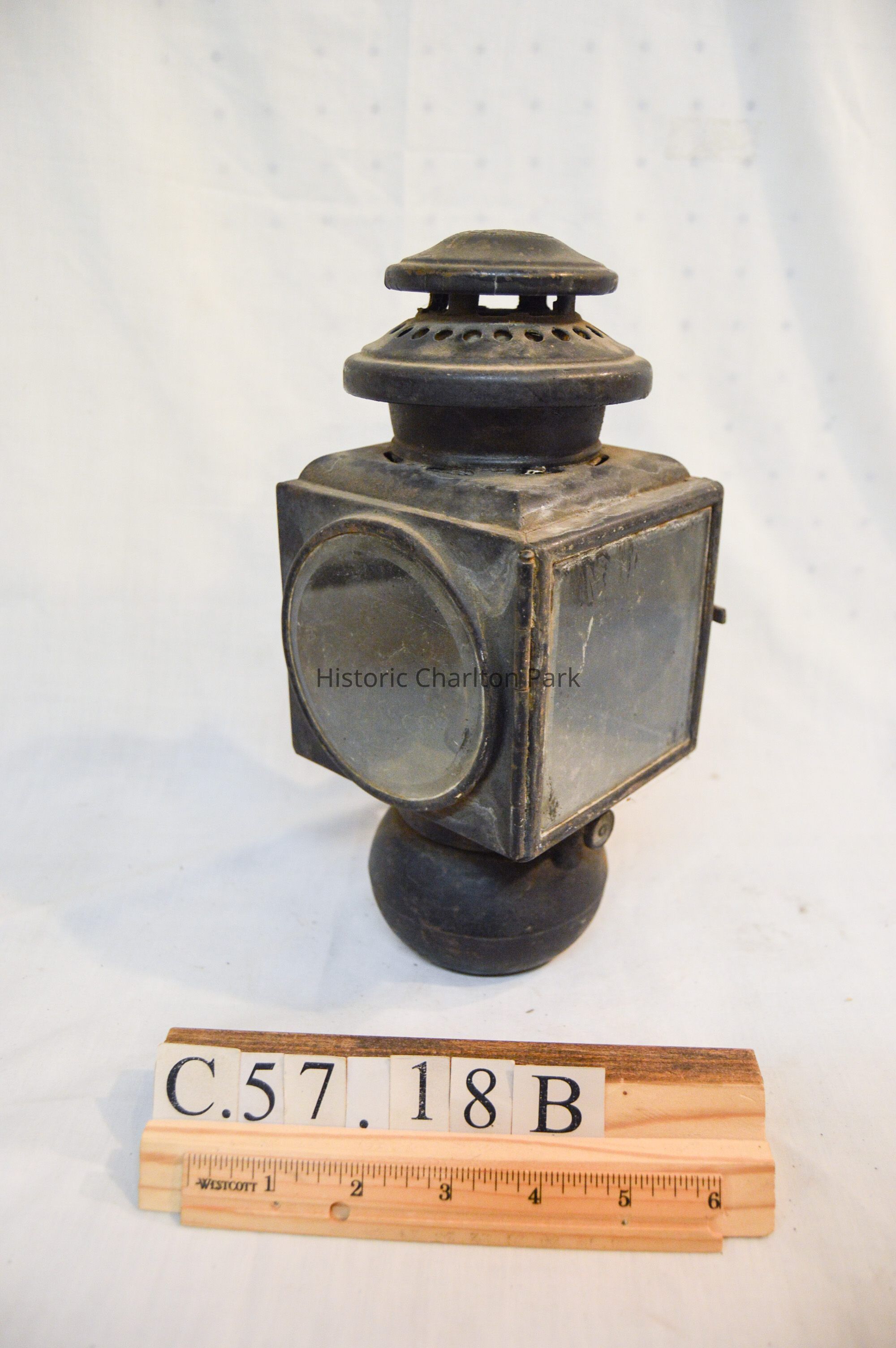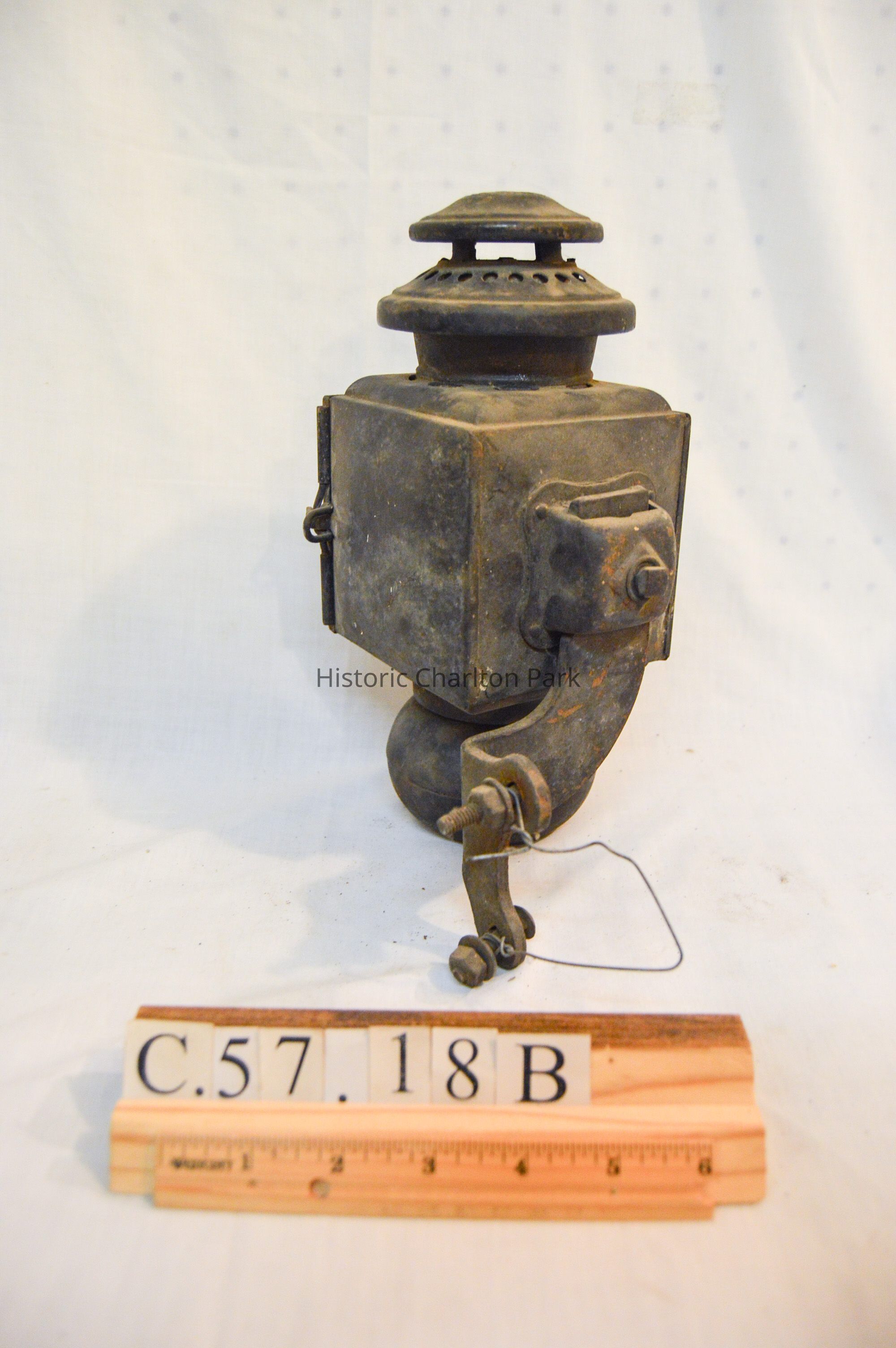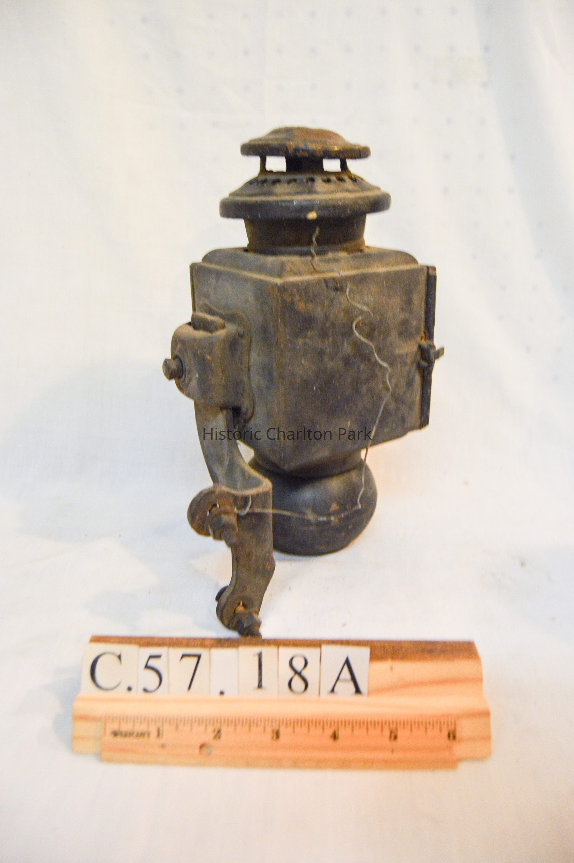 Two mounted kerosene driving lamps (A-B). A: The base of the lamp is somewhat spherical, and has a flat, circular bottom. It holds up the body, which is cube-shaped and has two metal sides and two glass sides. The one glass side is square, whereas the other is circular. The square glass side opens on a hinge and clasps closed. One of the metal sides is completely flat and the other has a bracket in the center. The brack has an arm attached to it, which extends downards and to the left. The arm has two bolts on it, and a twisted metal wire attached. The top of the lamp is dome-shaped and has two layered discs. The bottom disc has circular vents around the top and the top disc has an inscription. B: Object B is identical to object A, just mirrored.Inscription/Signature/Marks