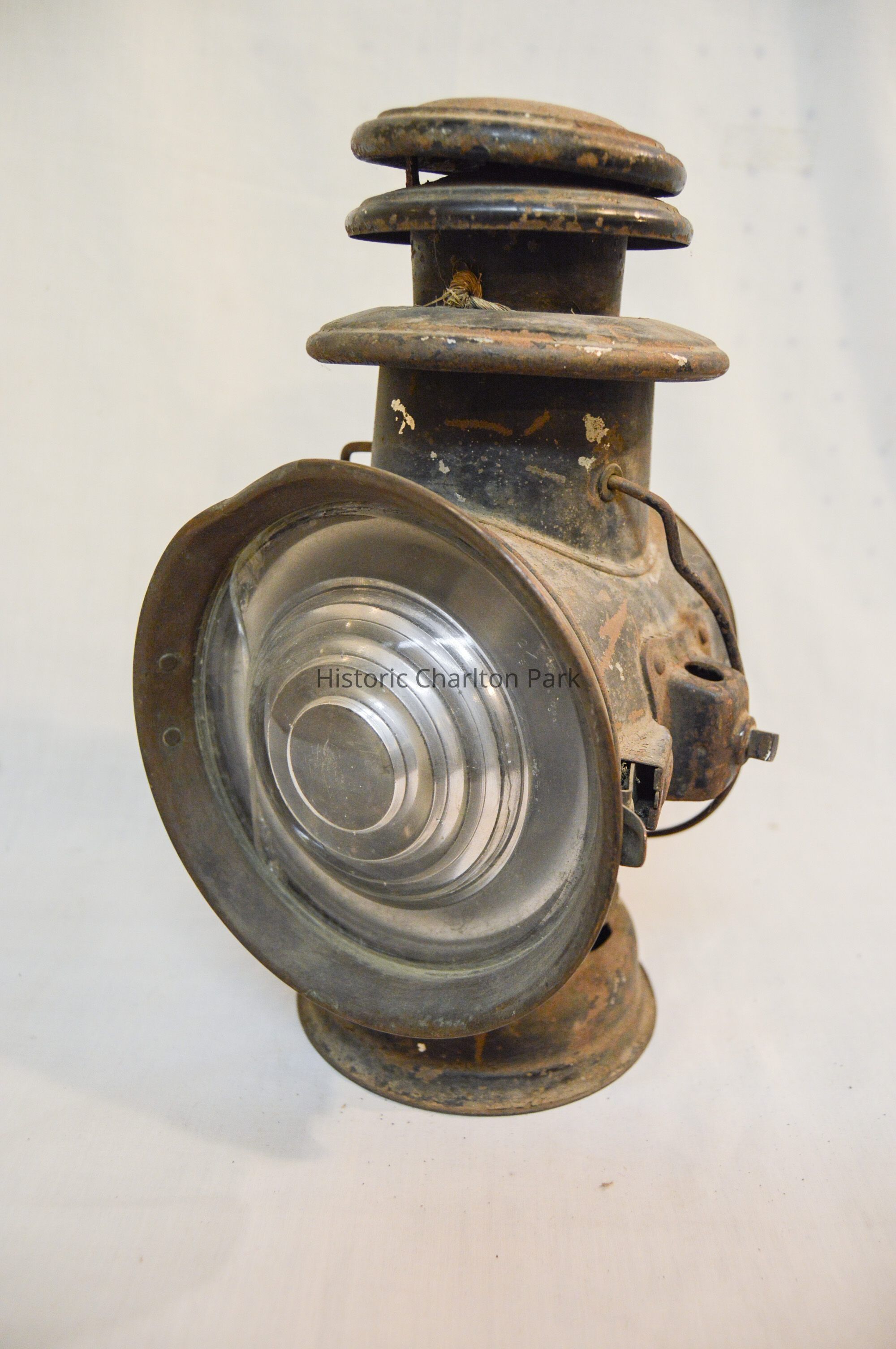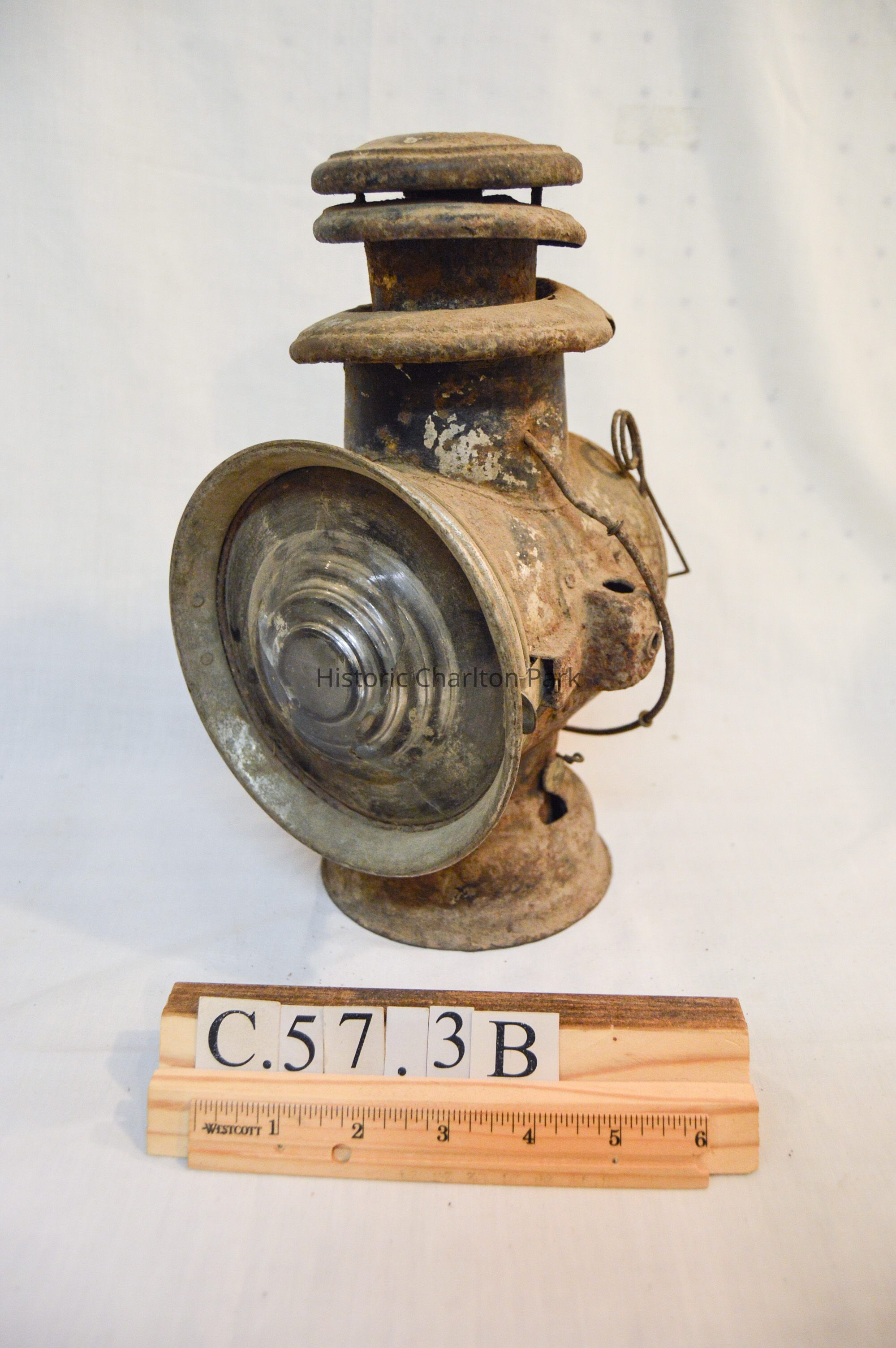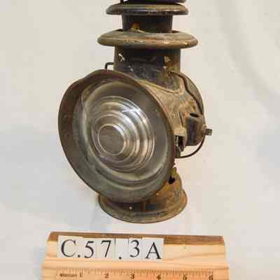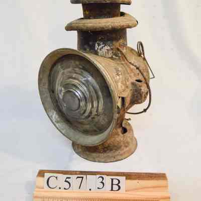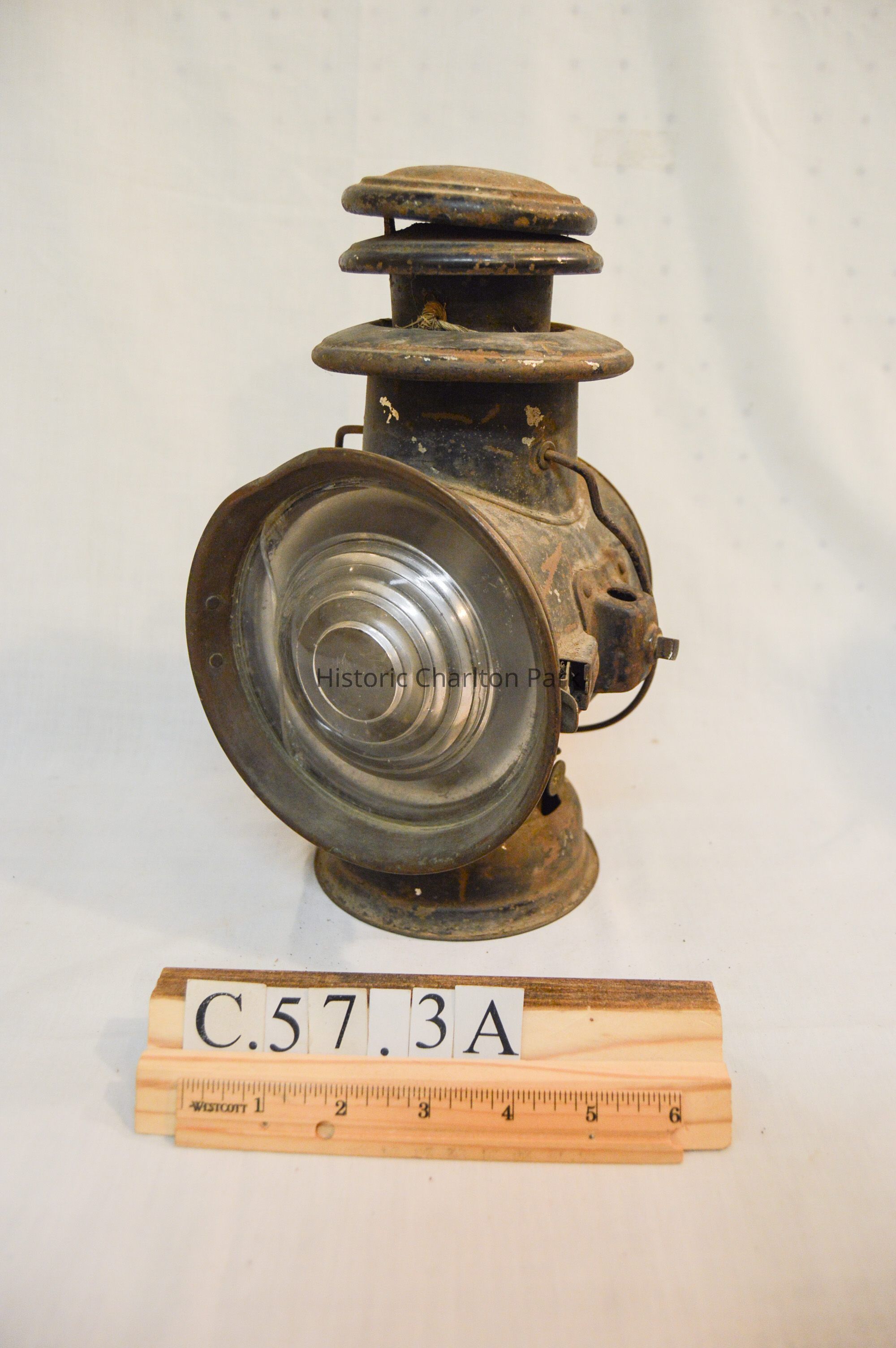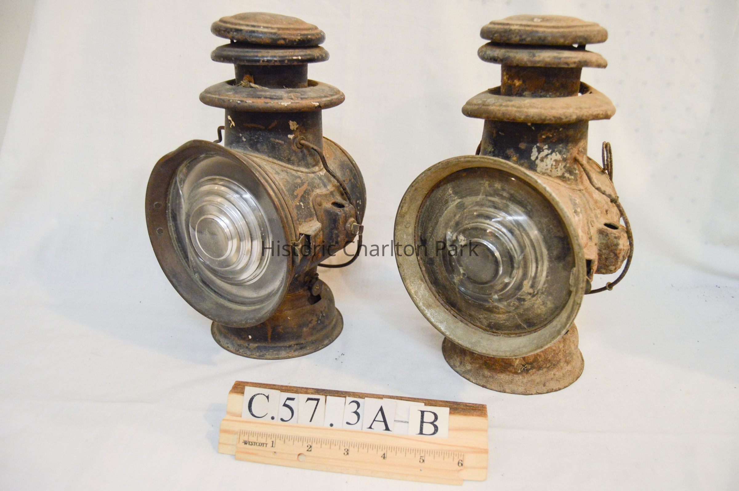 Two kerosene driving lamps (A-B). Both lamps have circular bottoms and cylindrical bodies with a horizontal orientation. The front of each lamp has a circular glass reflector housed in a metal frame that swings open on a hinge and clasps shut. The sides of the lamps have brackets consisting of a rectangular box with holes on the top and bottom. Object A's brackets have square-shaped screws in the sides. The backs of the lamps are different from eachother. Object A has a rounded back with a circular hole where the rear reflector is missing. Object B has a flat back with a red glass reflector in the center, and two circular coils connected together by a wire.. Both lamps have cylindrical tops with three stacked discs around them. The top and middle discs are closer together than the bottom discs. On both lamps, there is a looped metal handle attached below the bottom disc.Inscription/Signature/Marks
