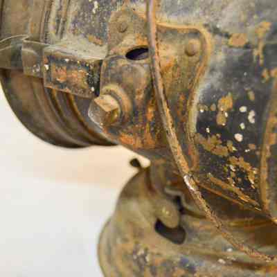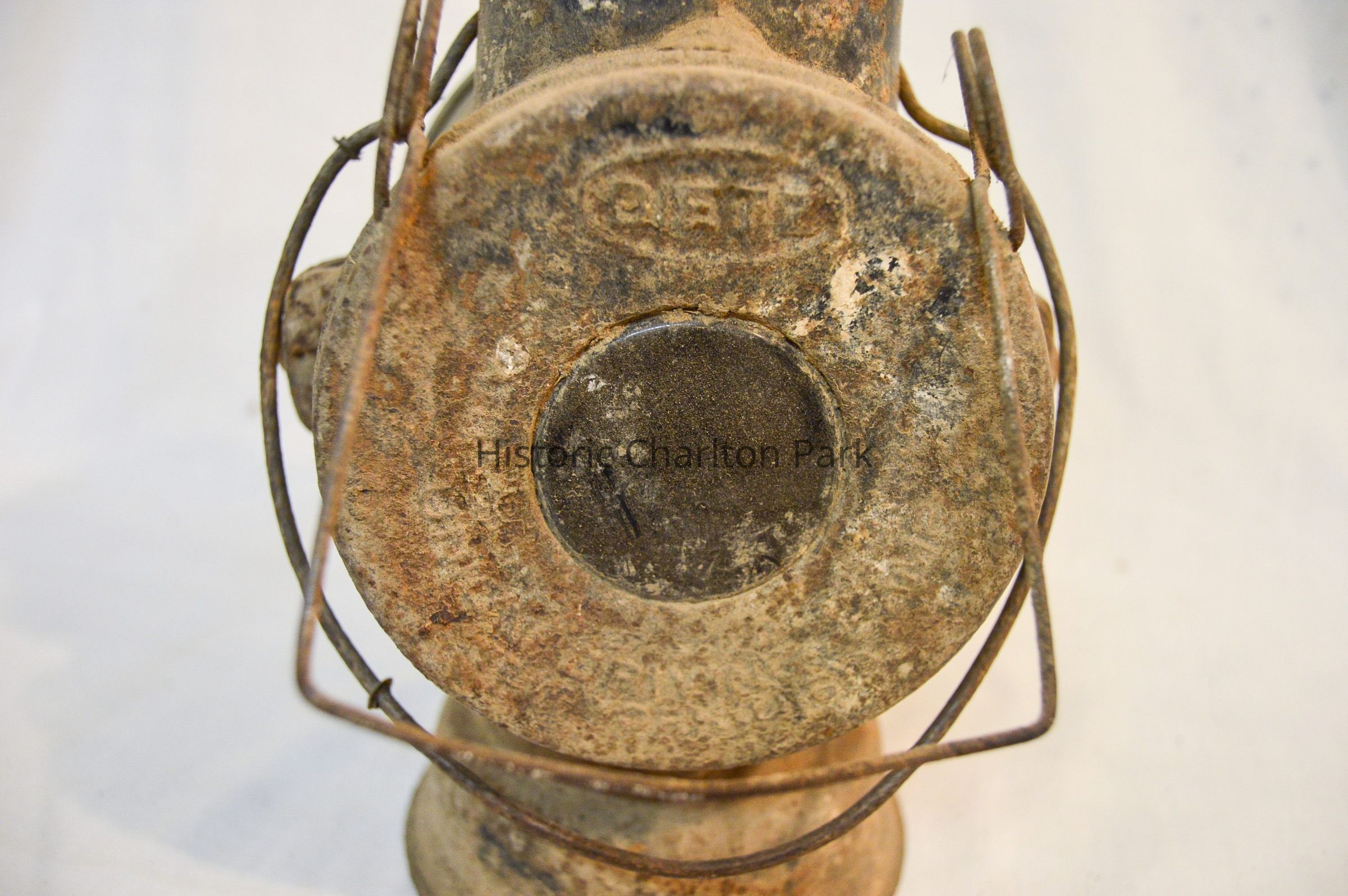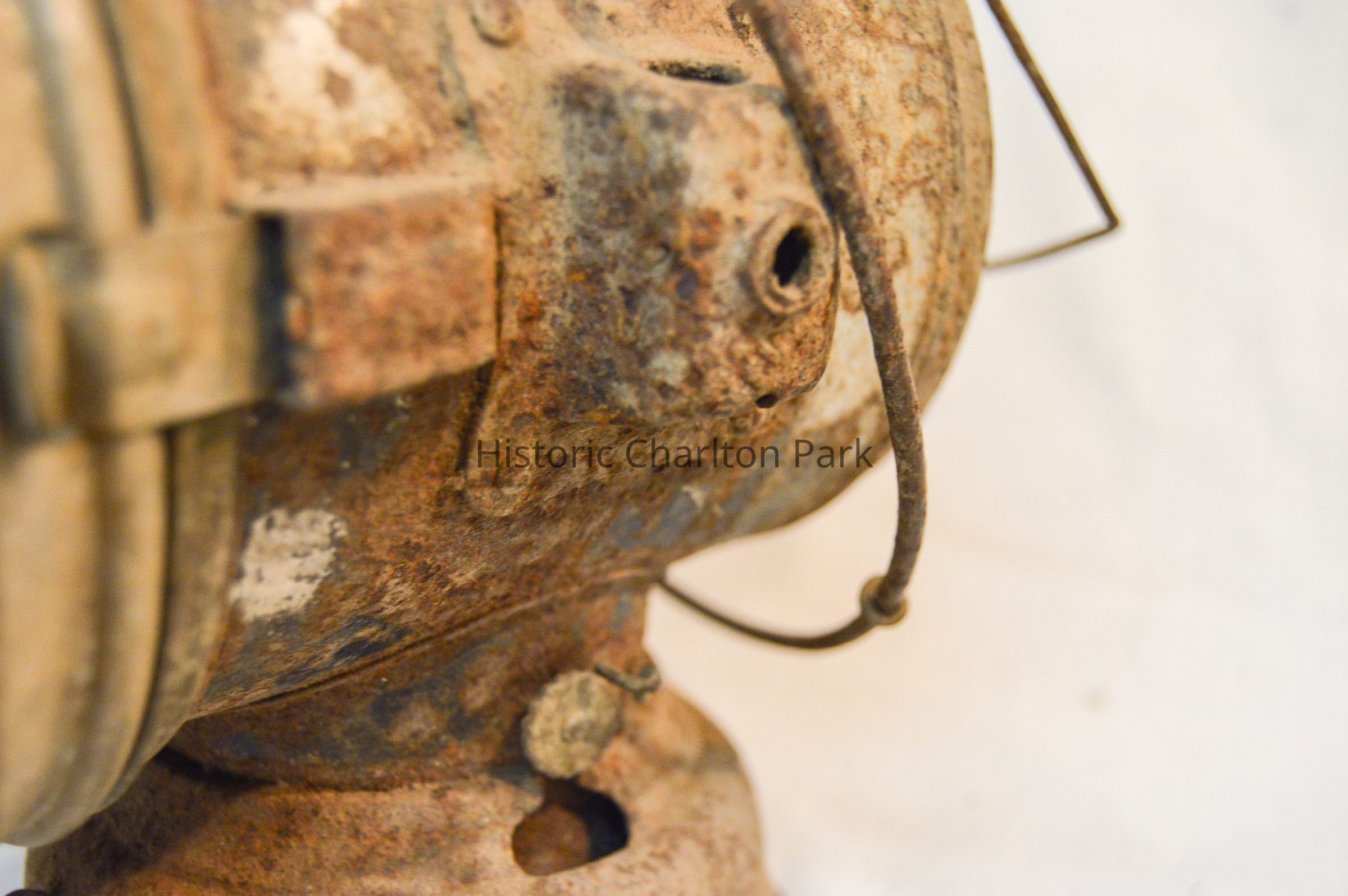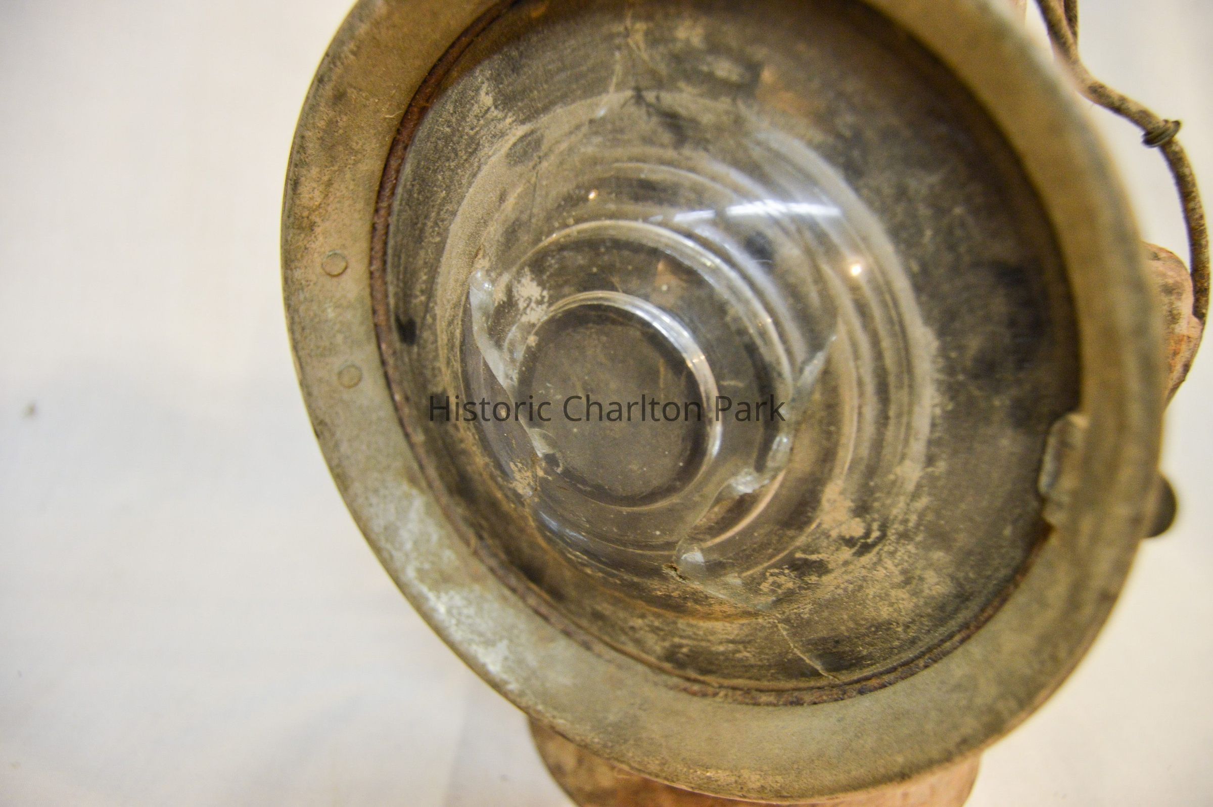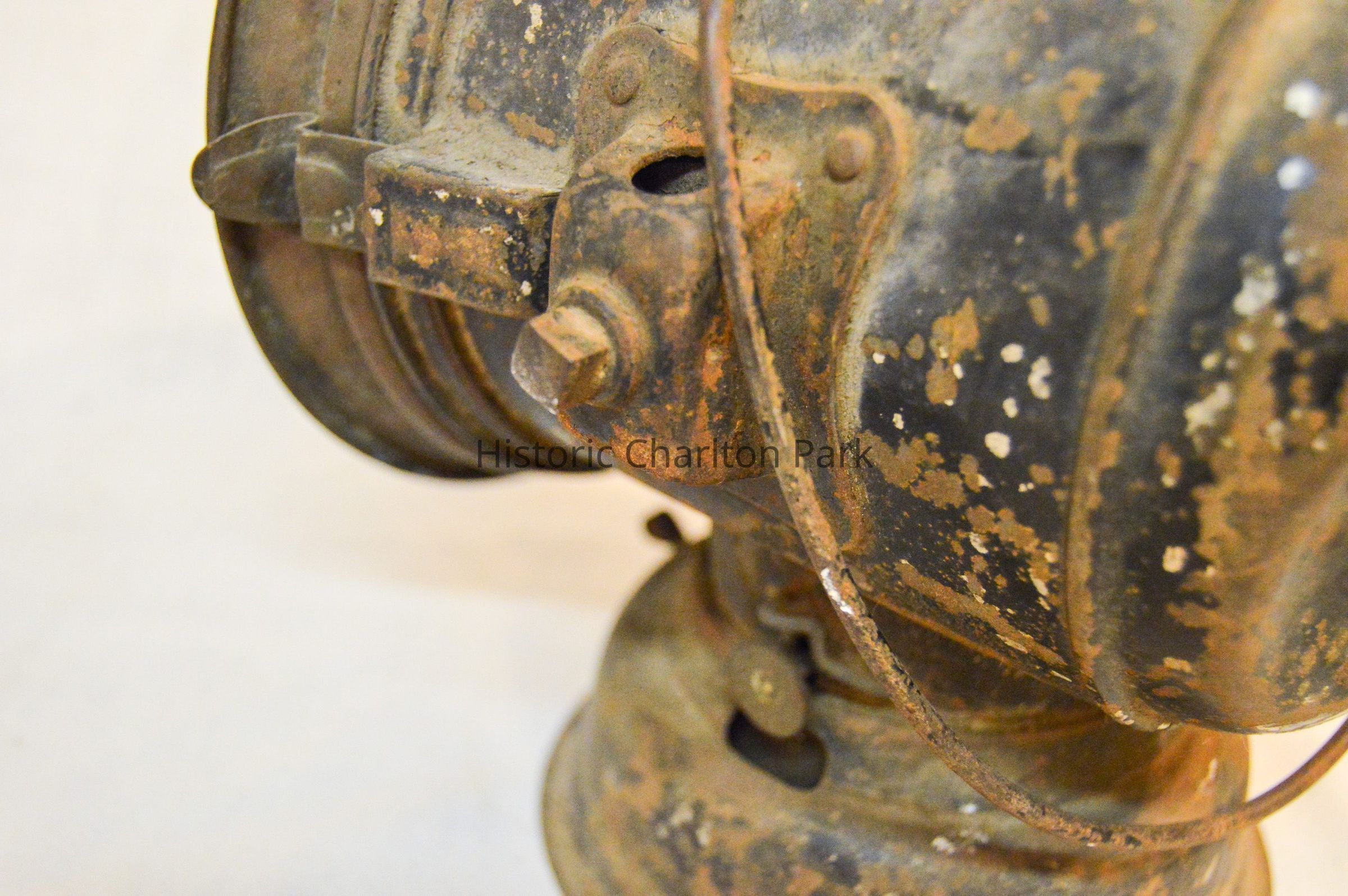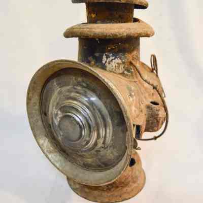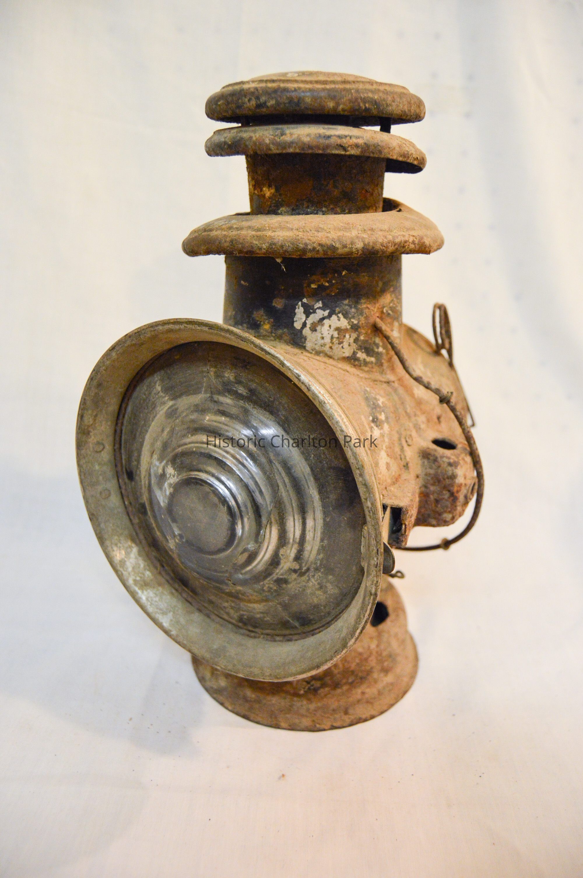 Two kerosene driving lamps (A-B). Both lamps have circular bottoms and cylindrical bodies with a horizontal orientation. The front of each lamp has a circular glass reflector housed in a metal frame that swings open on a hinge and clasps shut. The sides of the lamps have brackets consisting of a rectangular box with holes on the top and bottom. Object A's brackets have square-shaped screws in the sides. The backs of the lamps are different from eachother. Object A has a rounded back with a circular hole where the rear reflector is missing. Object B has a flat back with a red glass reflector in the center, and two circular coils connected together by a wire.. Both lamps have cylindrical tops with three stacked discs around them. The top and middle discs are closer together than the bottom discs. On both lamps, there is a looped metal handle attached below the bottom disc.Inscription/Signature/Marks