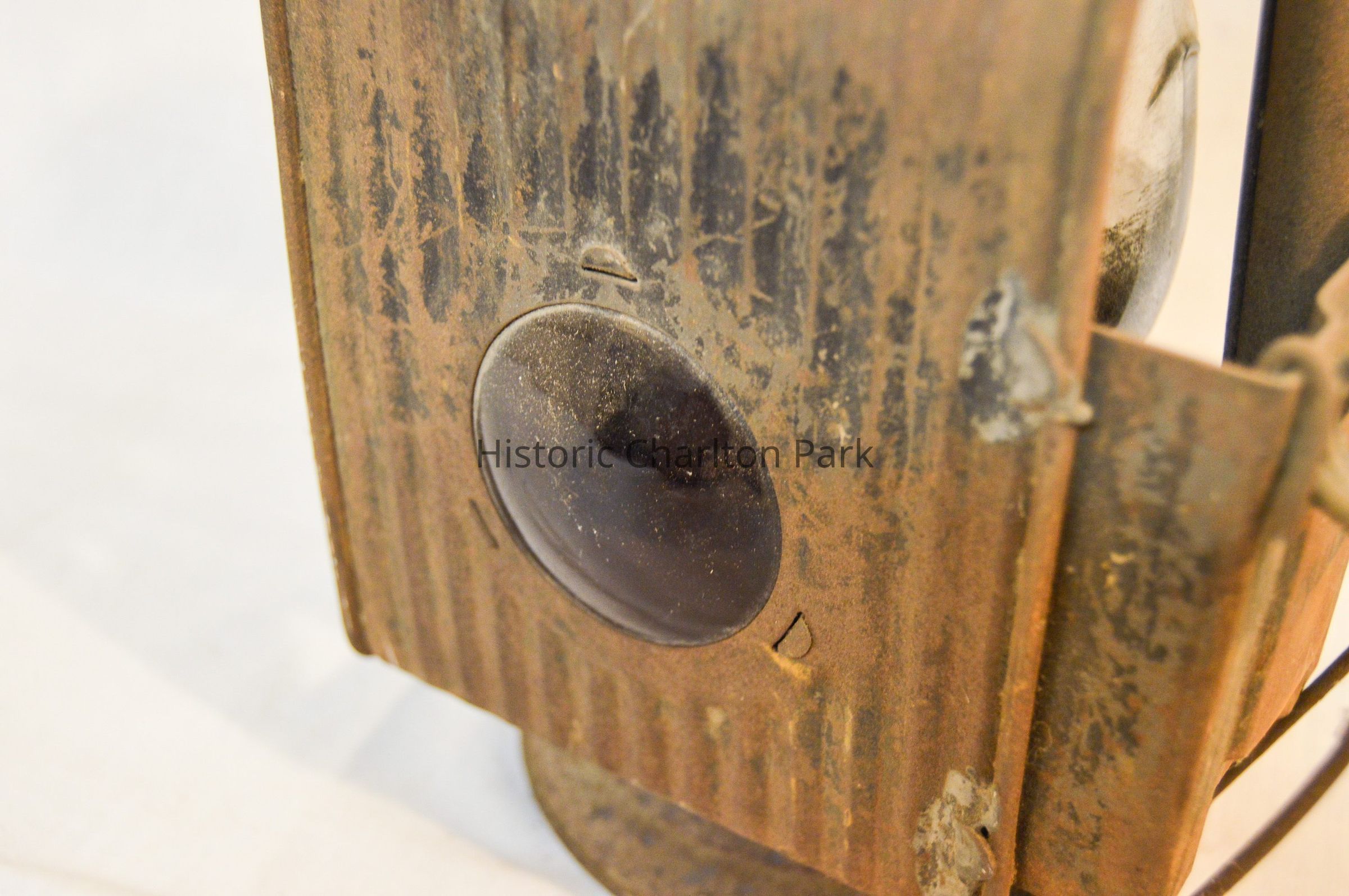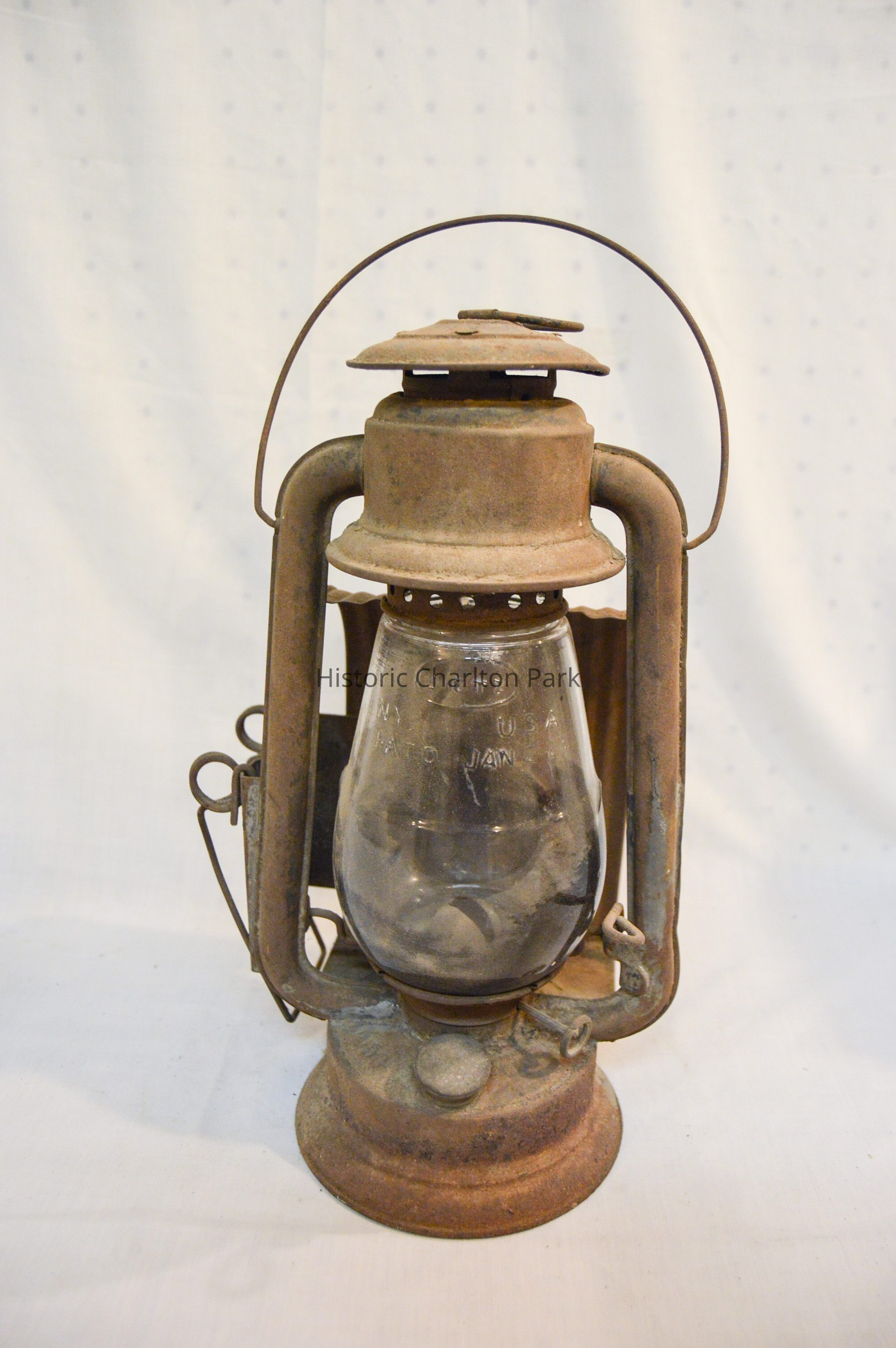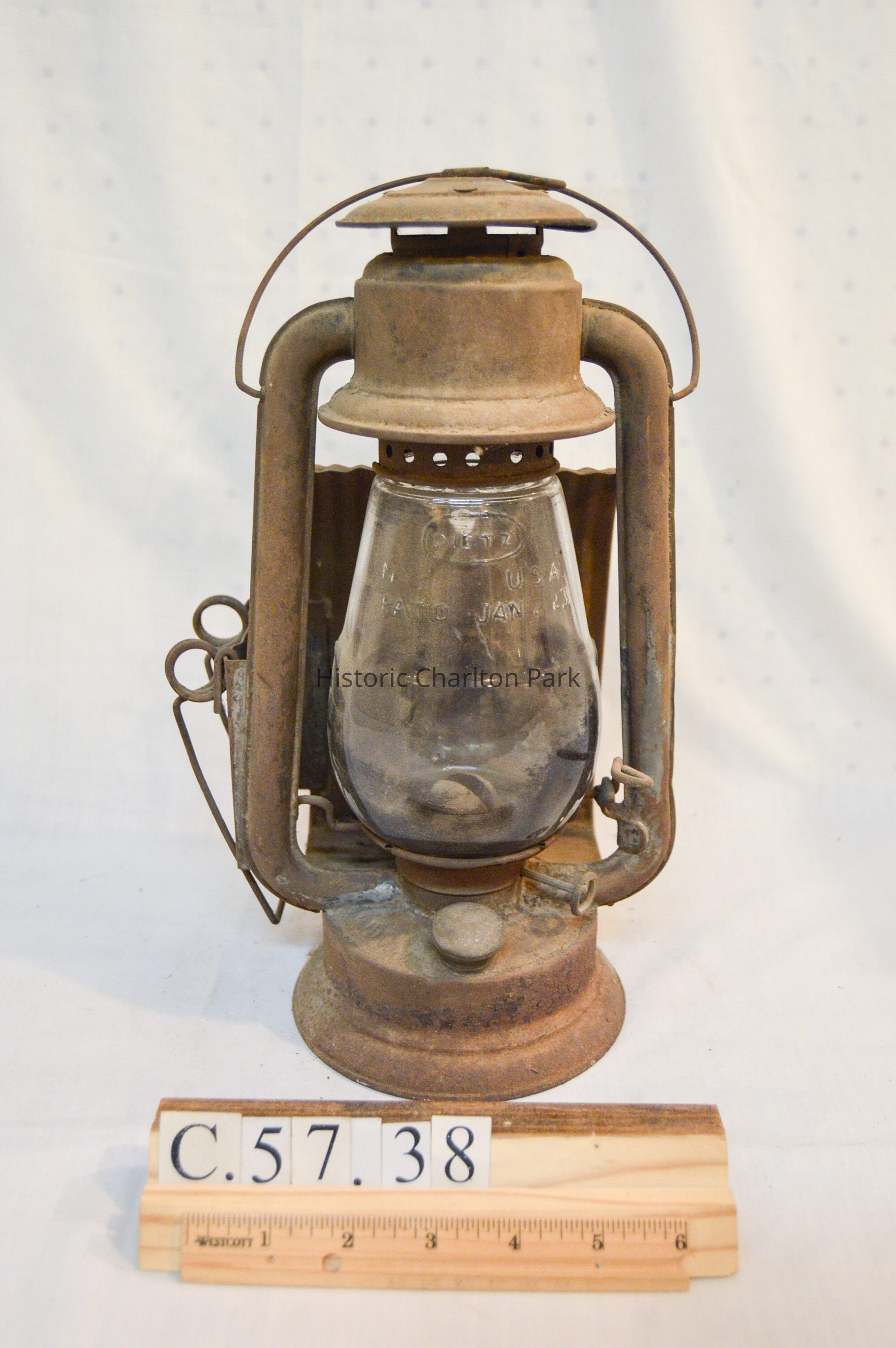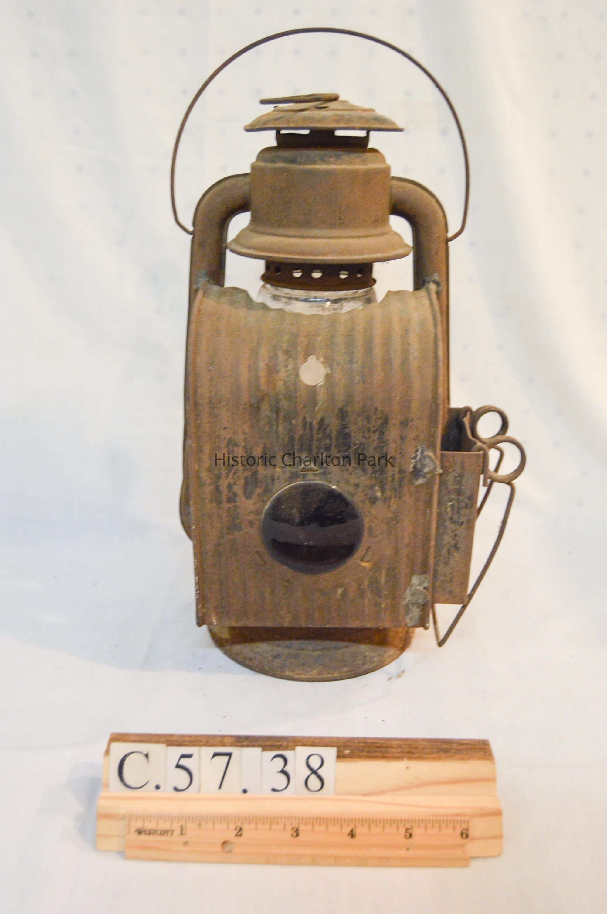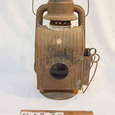 Kerosene driving lantern made of metal and has a circular base. At the center of the base, there is an oil burner and a glass chimney. The burner is circular and consists of a ring with circular vents, a dome-shaped emitter in the center, and a knob on the lower right. The chimney is made of clear glass and tapers inwards slightly towards the top. There is also a circular fuel cap on the front of the base. The frame of the lantern is rectangular and large, connecting at the base and supporting the cap for the chimney. The cap is cylindrical with a lip at the bottom and a flat, disc-shaped piece at the top, which has a small, round handle. There is a larger looped handle connected to the sides of the frame. The back of the lantern has a plate on the back that curves inward at the top and has a circular, red glass reflector in the center. There is a smaller plate on the left side of the lantern with a metal wire tab that moves on two coil hinges.Inscription/Signature/Marks