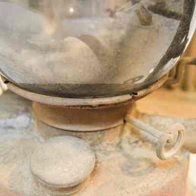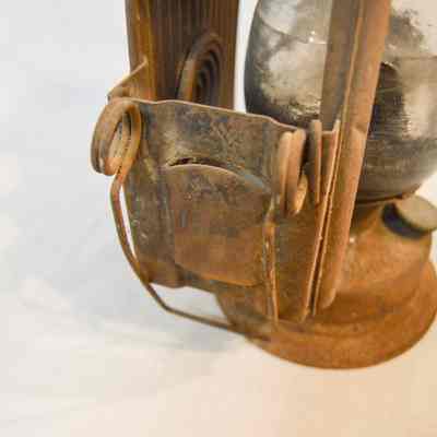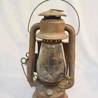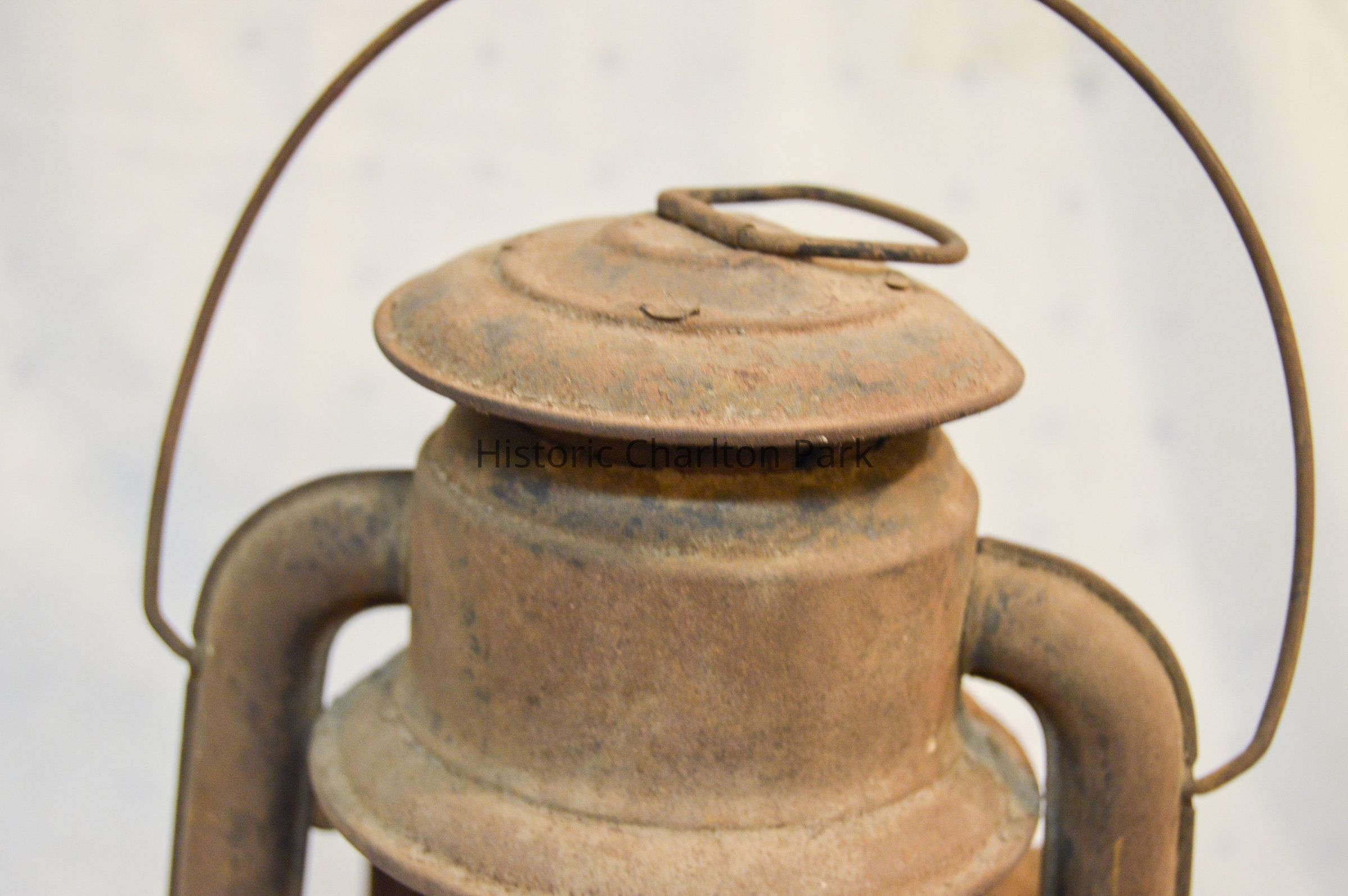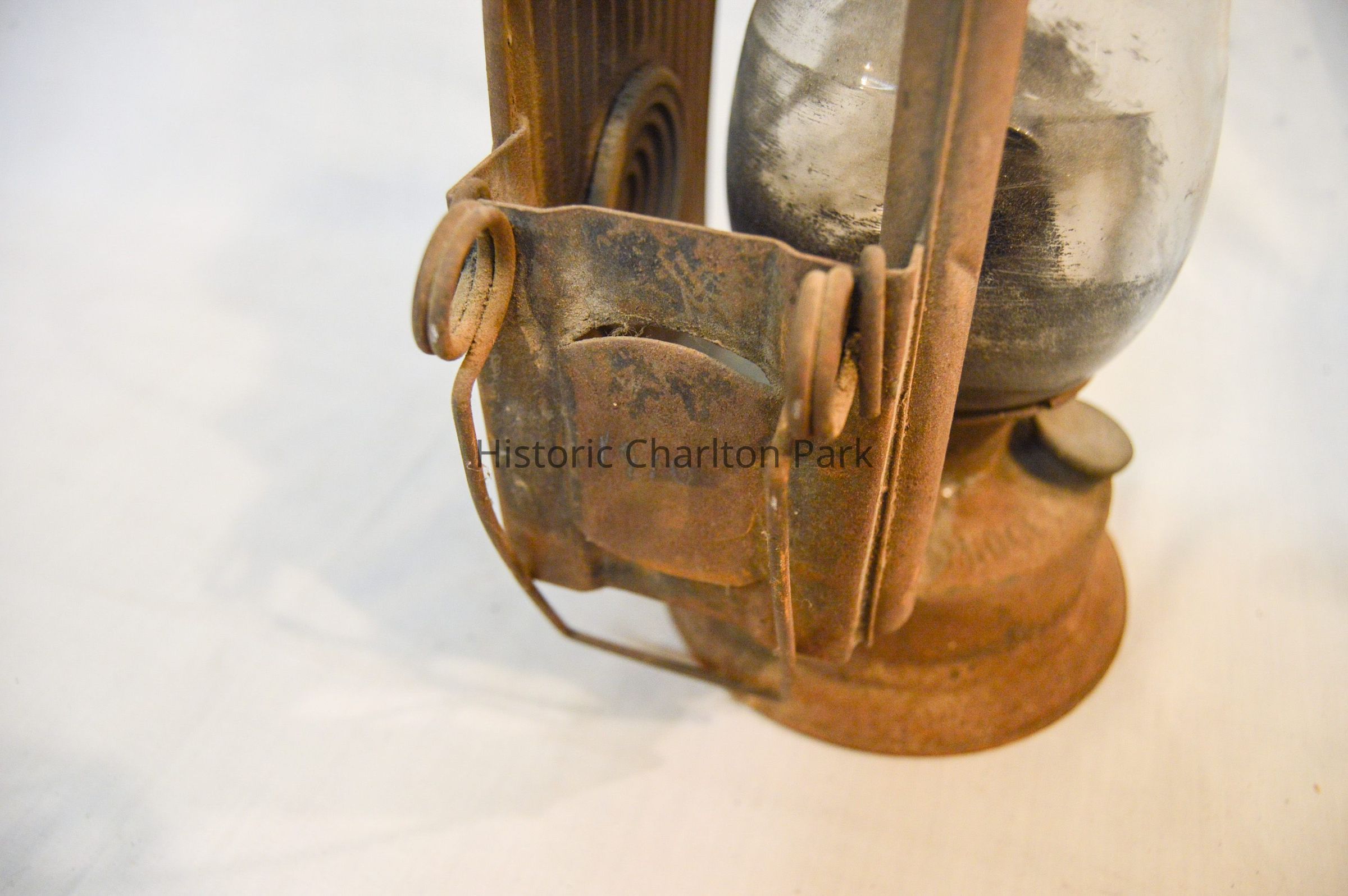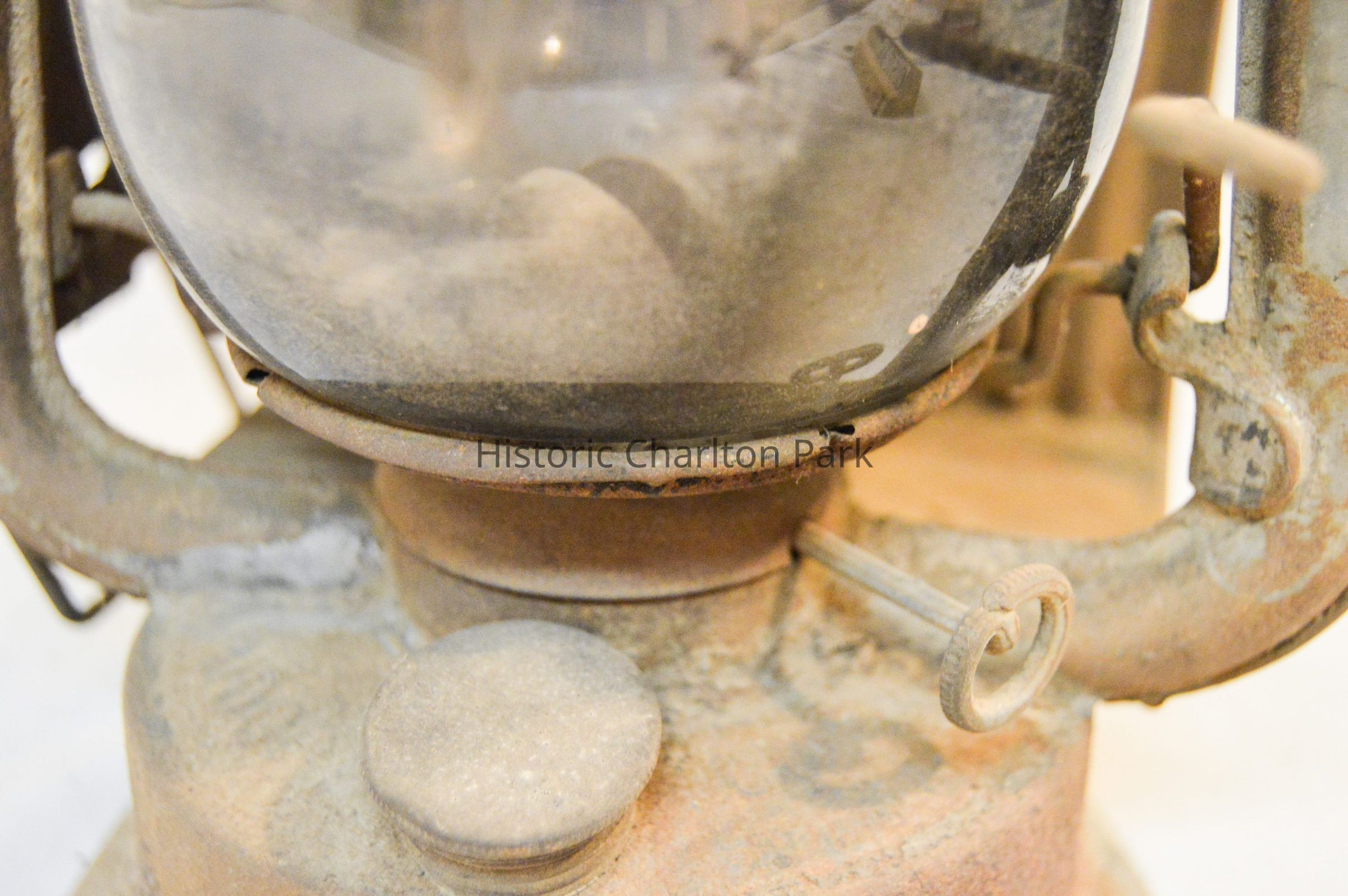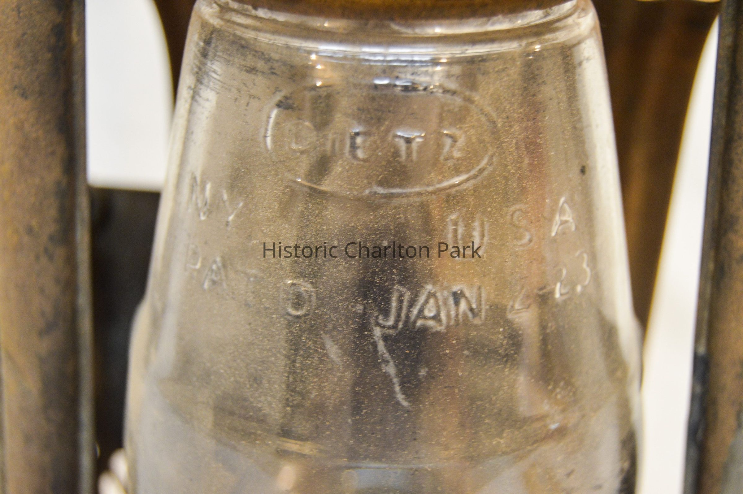 Kerosene driving lantern made of metal and has a circular base. At the center of the base, there is an oil burner and a glass chimney. The burner is circular and consists of a ring with circular vents, a dome-shaped emitter in the center, and a knob on the lower right. The chimney is made of clear glass and tapers inwards slightly towards the top. There is also a circular fuel cap on the front of the base. The frame of the lantern is rectangular and large, connecting at the base and supporting the cap for the chimney. The cap is cylindrical with a lip at the bottom and a flat, disc-shaped piece at the top, which has a small, round handle. There is a larger looped handle connected to the sides of the frame. The back of the lantern has a plate on the back that curves inward at the top and has a circular, red glass reflector in the center. There is a smaller plate on the left side of the lantern with a metal wire tab that moves on two coil hinges.Inscription/Signature/Marks