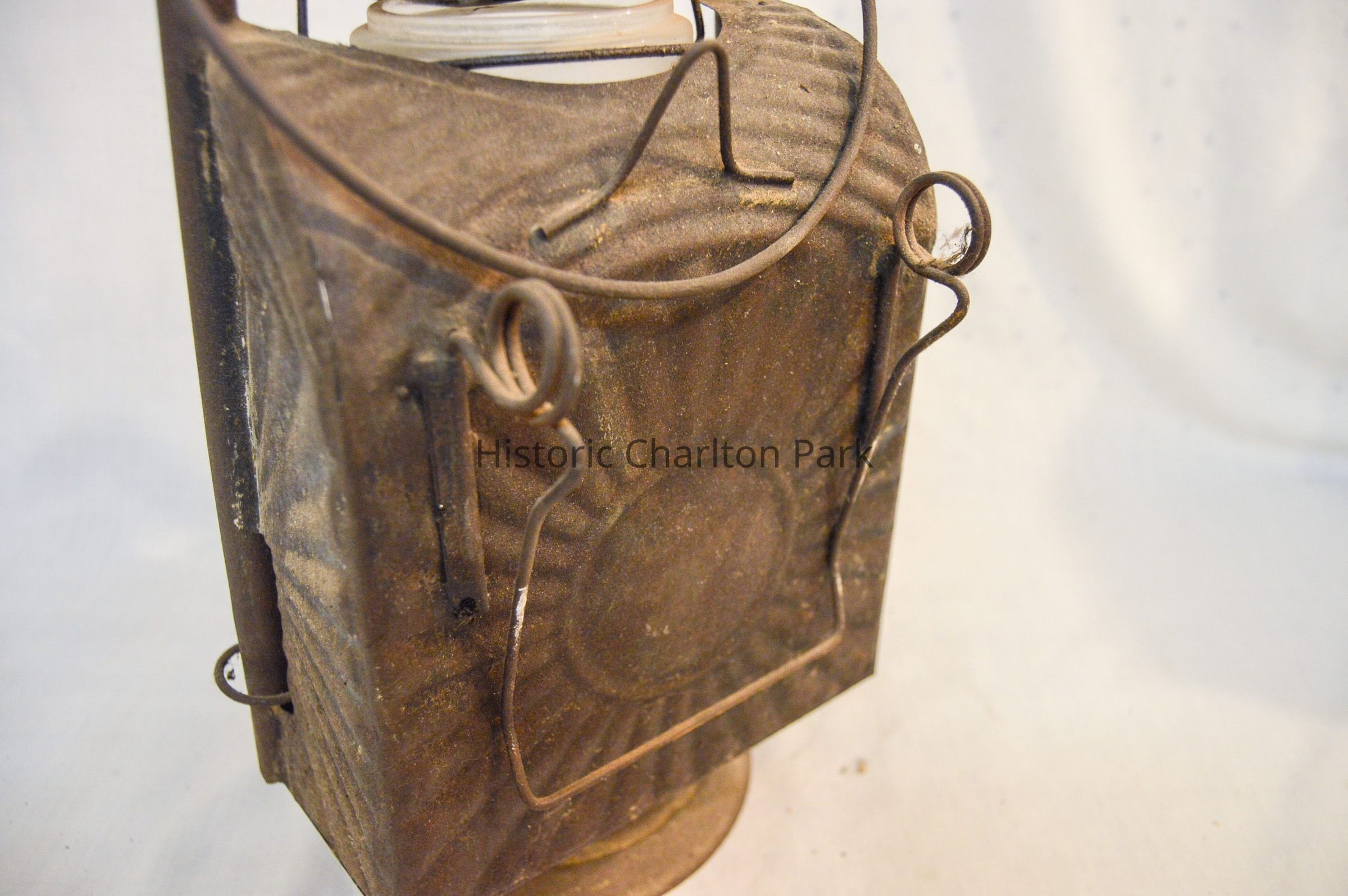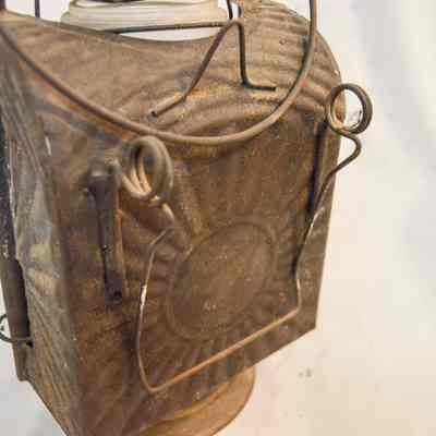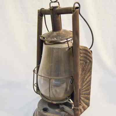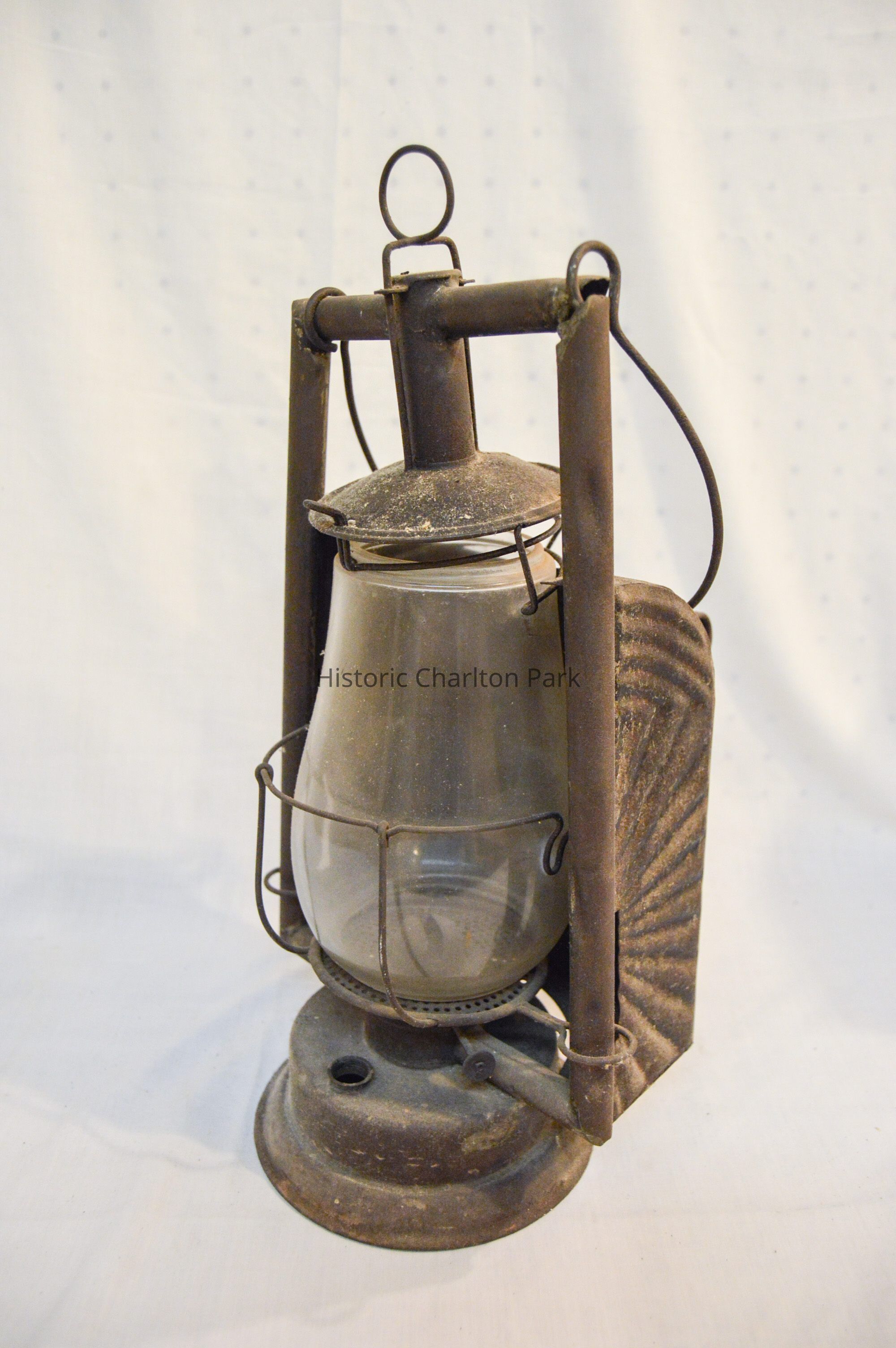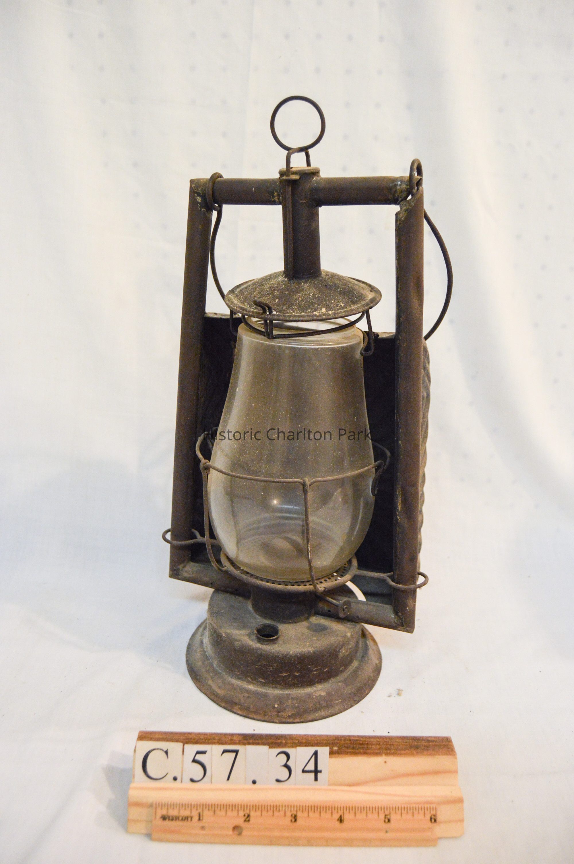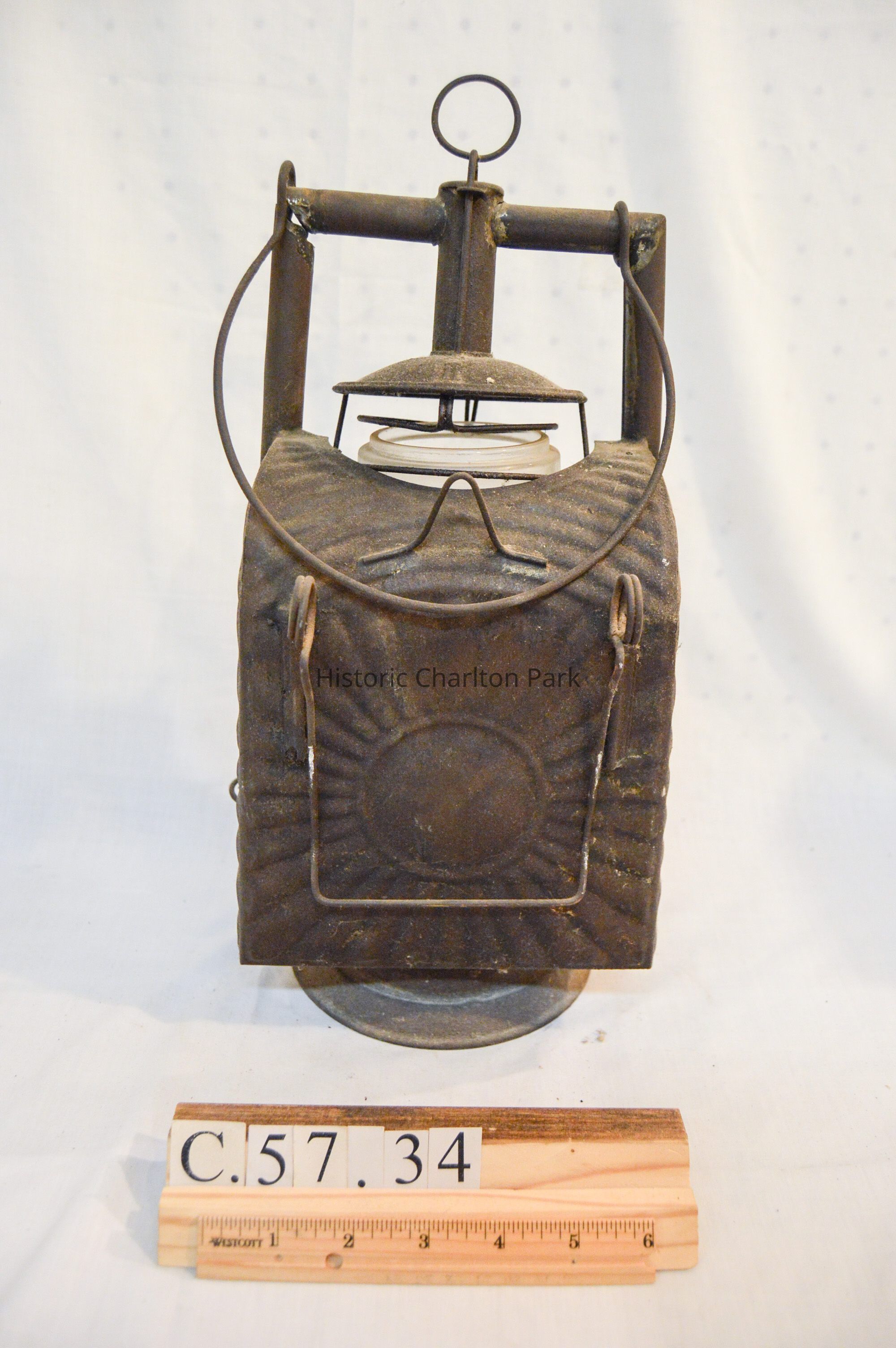 Kerosene driver's lamp made of metal and has a cylindrical base with a small circular fuel hole on the front. The burner is positioned in the center of the base and surrounded by a large, rectangular frame. The burner consists of a metal ring that hooks to the frame, four metal bars that surround the glass chimney, and a dome-shaped burner in the center surrounded by circular vents. There is a knob to the lower right of the burner for adjusting the flame level. The glass chimney sits on top of the burner and has a pear-shaped by. It is capped at the top by a flat piece of metal attached to the frame. There is a small, circular handle at the top and a larger looped handle connected to the frame. The back of the lantern has a large, rectangular plate that also somewhat covers the sides of the lantern. It has a circular design on the back with lines radiating from it. There is also a metal bar connected to the back with two circular coil hinges.Dimensions