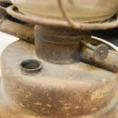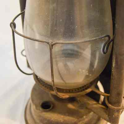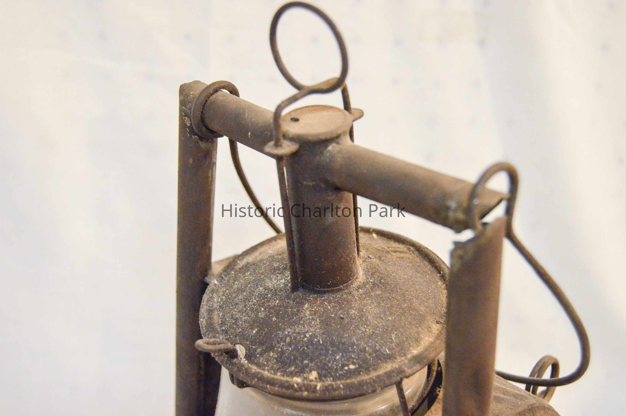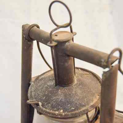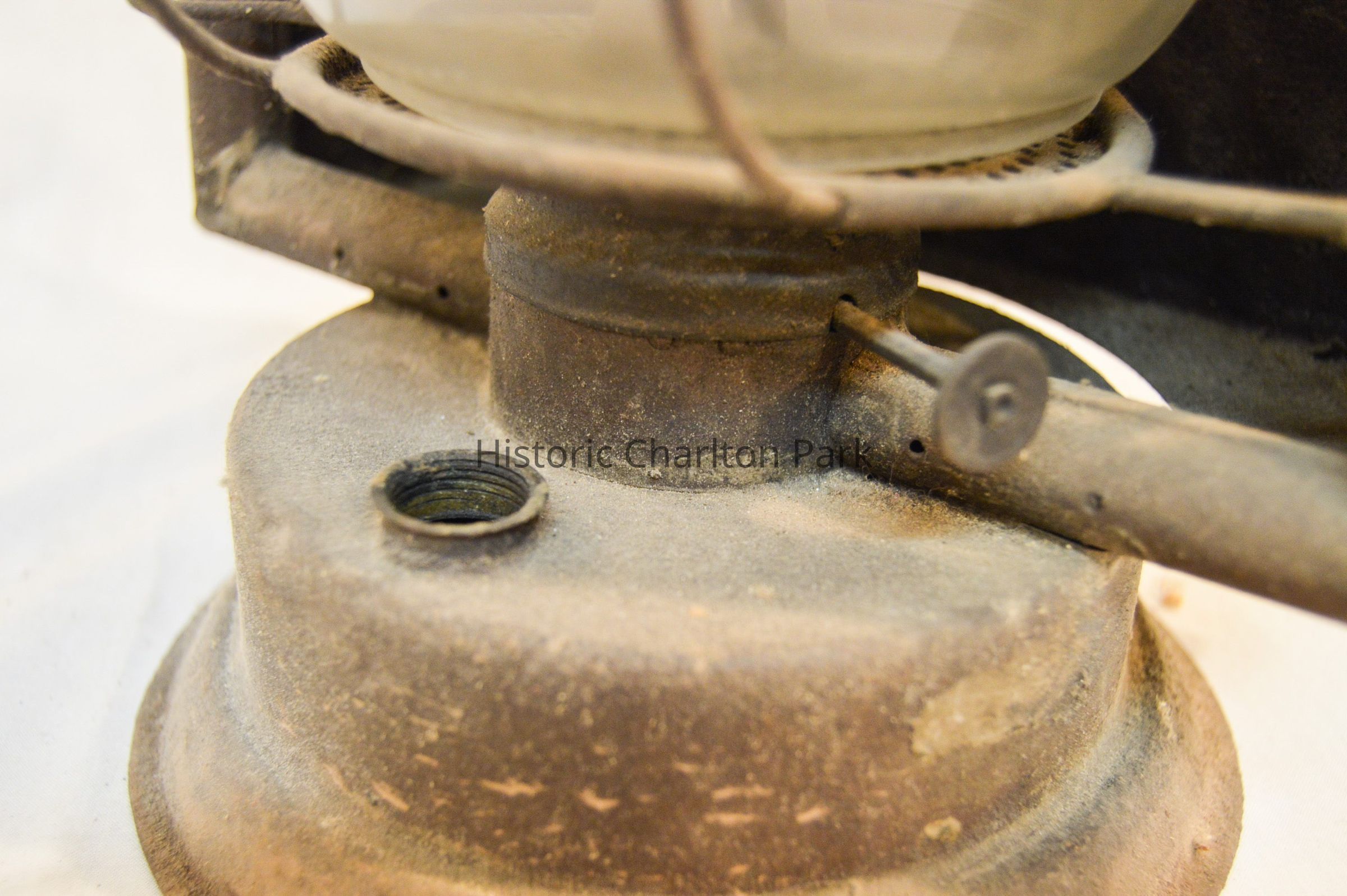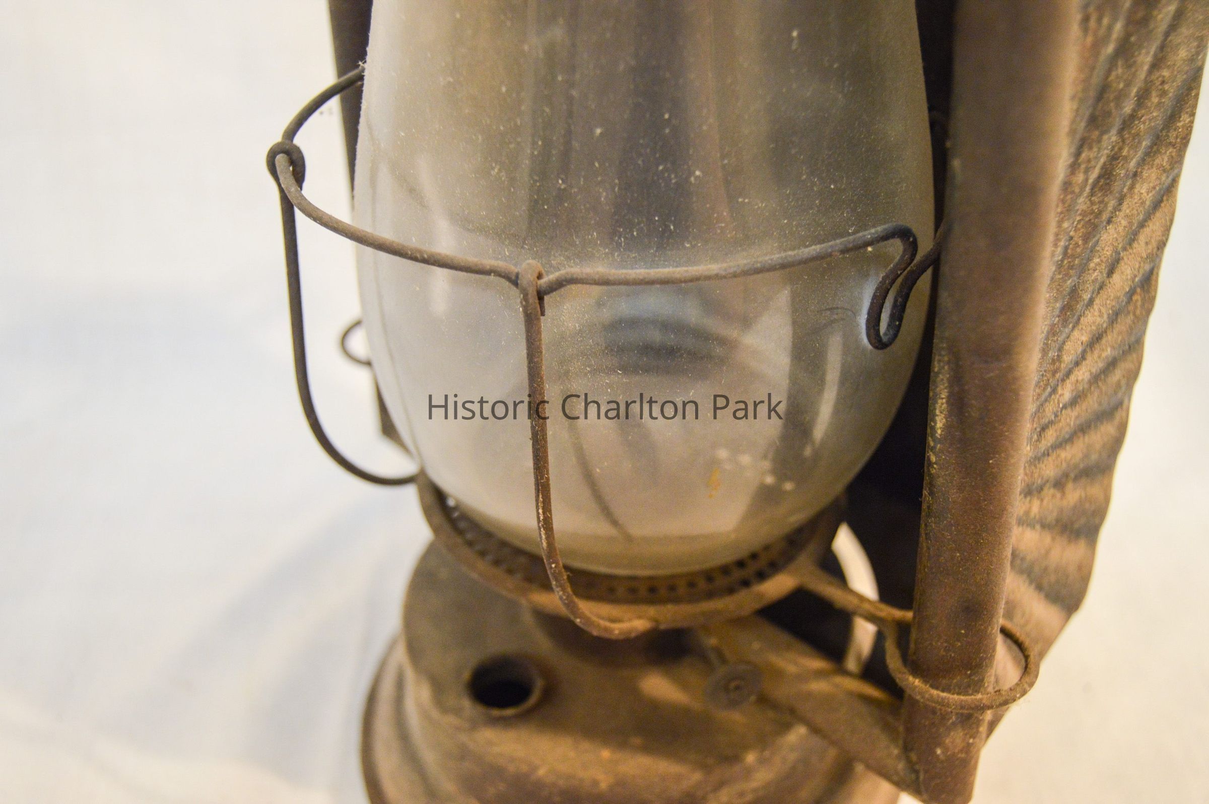 Kerosene driver's lamp made of metal and has a cylindrical base with a small circular fuel hole on the front. The burner is positioned in the center of the base and surrounded by a large, rectangular frame. The burner consists of a metal ring that hooks to the frame, four metal bars that surround the glass chimney, and a dome-shaped burner in the center surrounded by circular vents. There is a knob to the lower right of the burner for adjusting the flame level. The glass chimney sits on top of the burner and has a pear-shaped by. It is capped at the top by a flat piece of metal attached to the frame. There is a small, circular handle at the top and a larger looped handle connected to the frame. The back of the lantern has a large, rectangular plate that also somewhat covers the sides of the lantern. It has a circular design on the back with lines radiating from it. There is also a metal bar connected to the back with two circular coil hinges.Dimensions