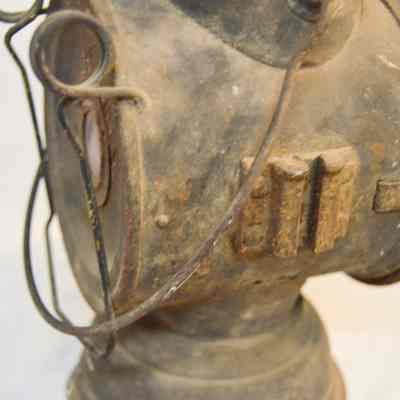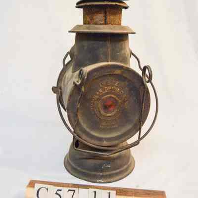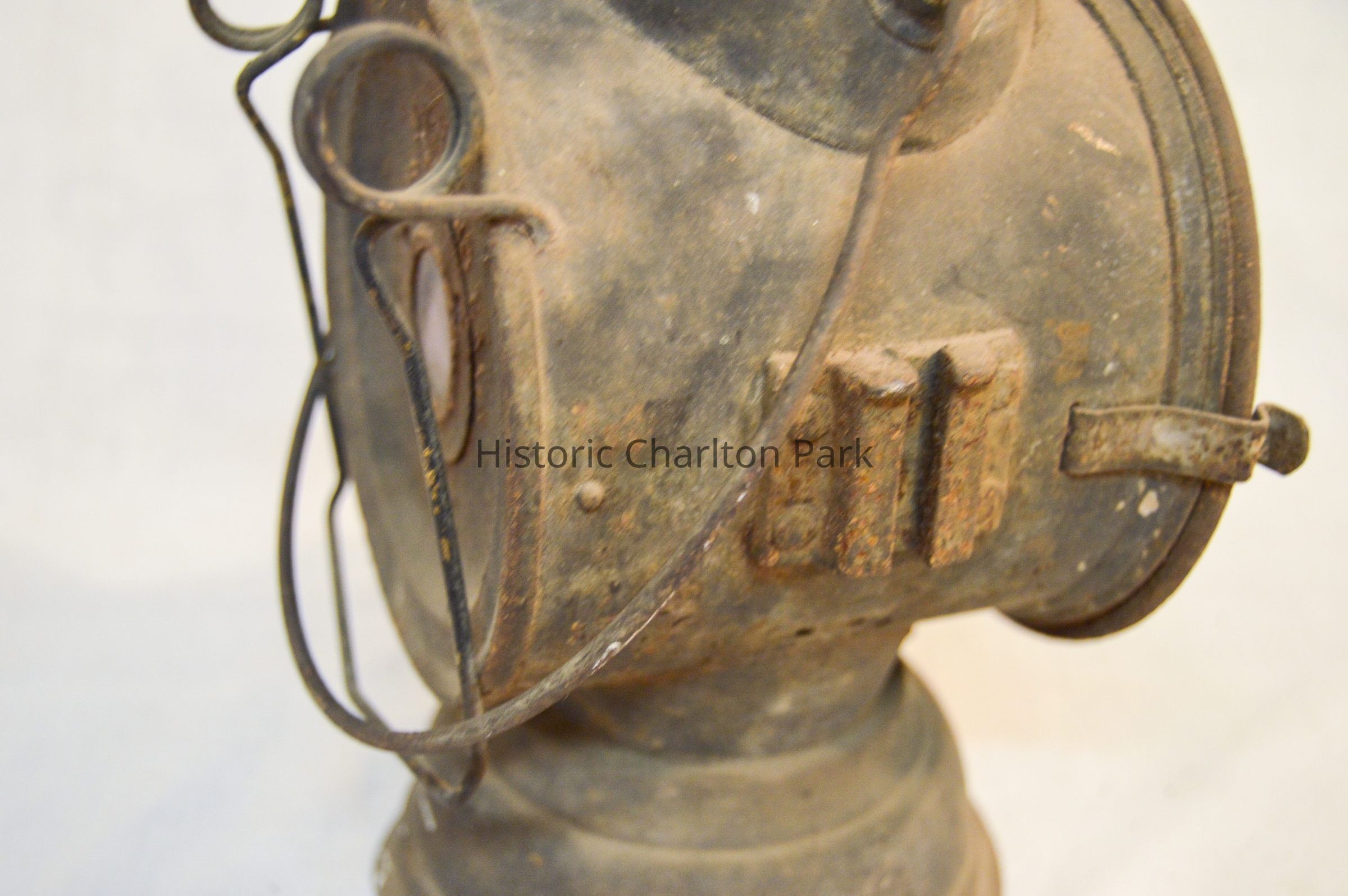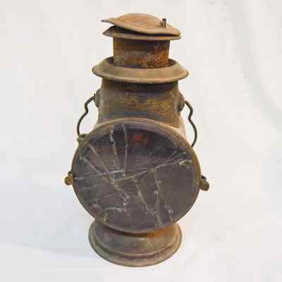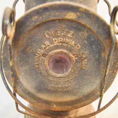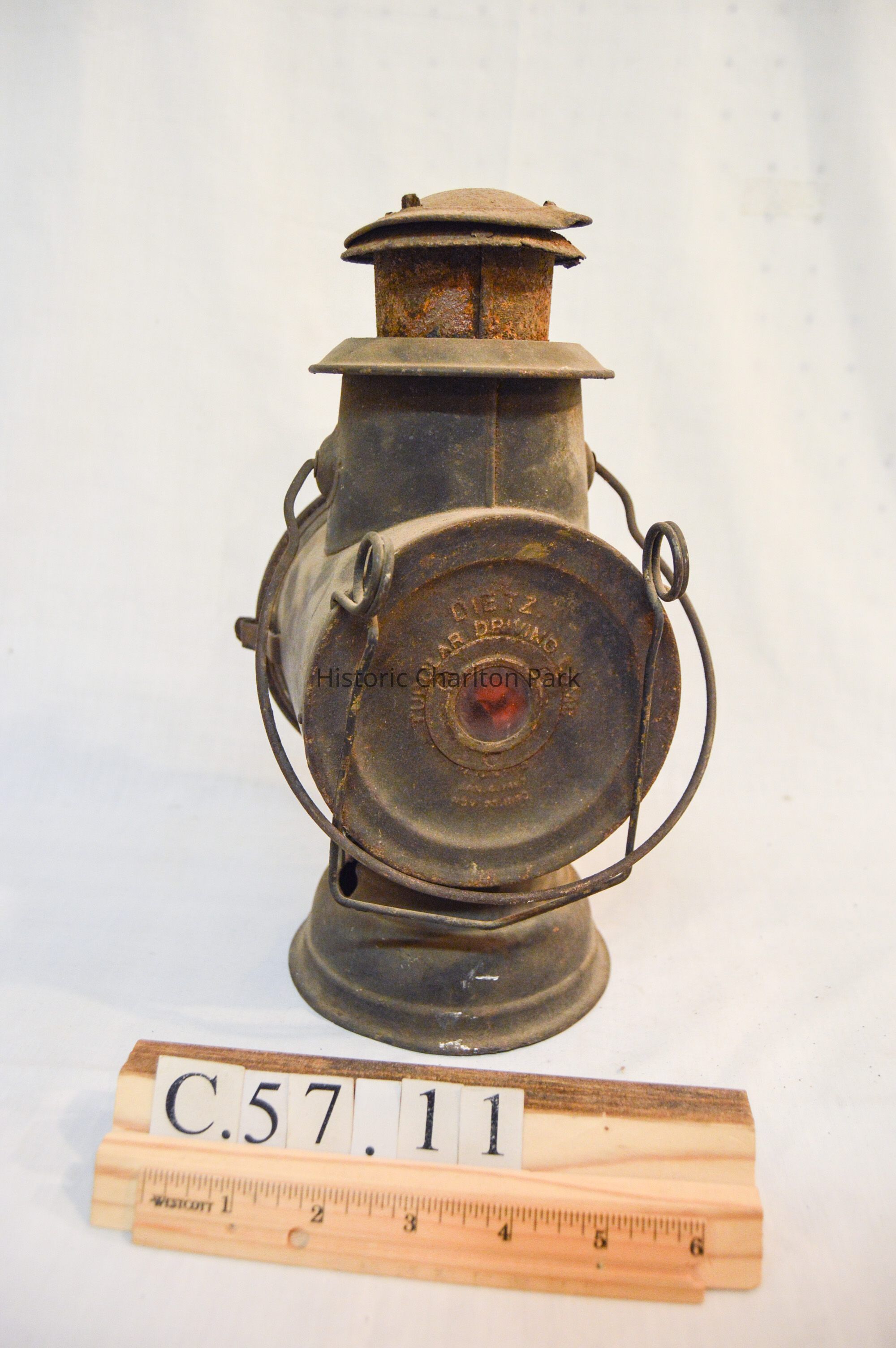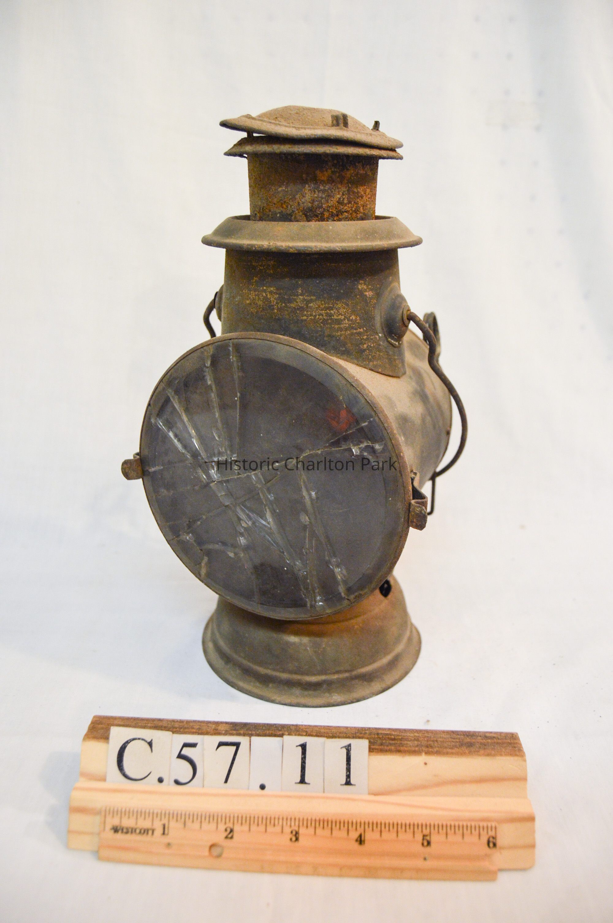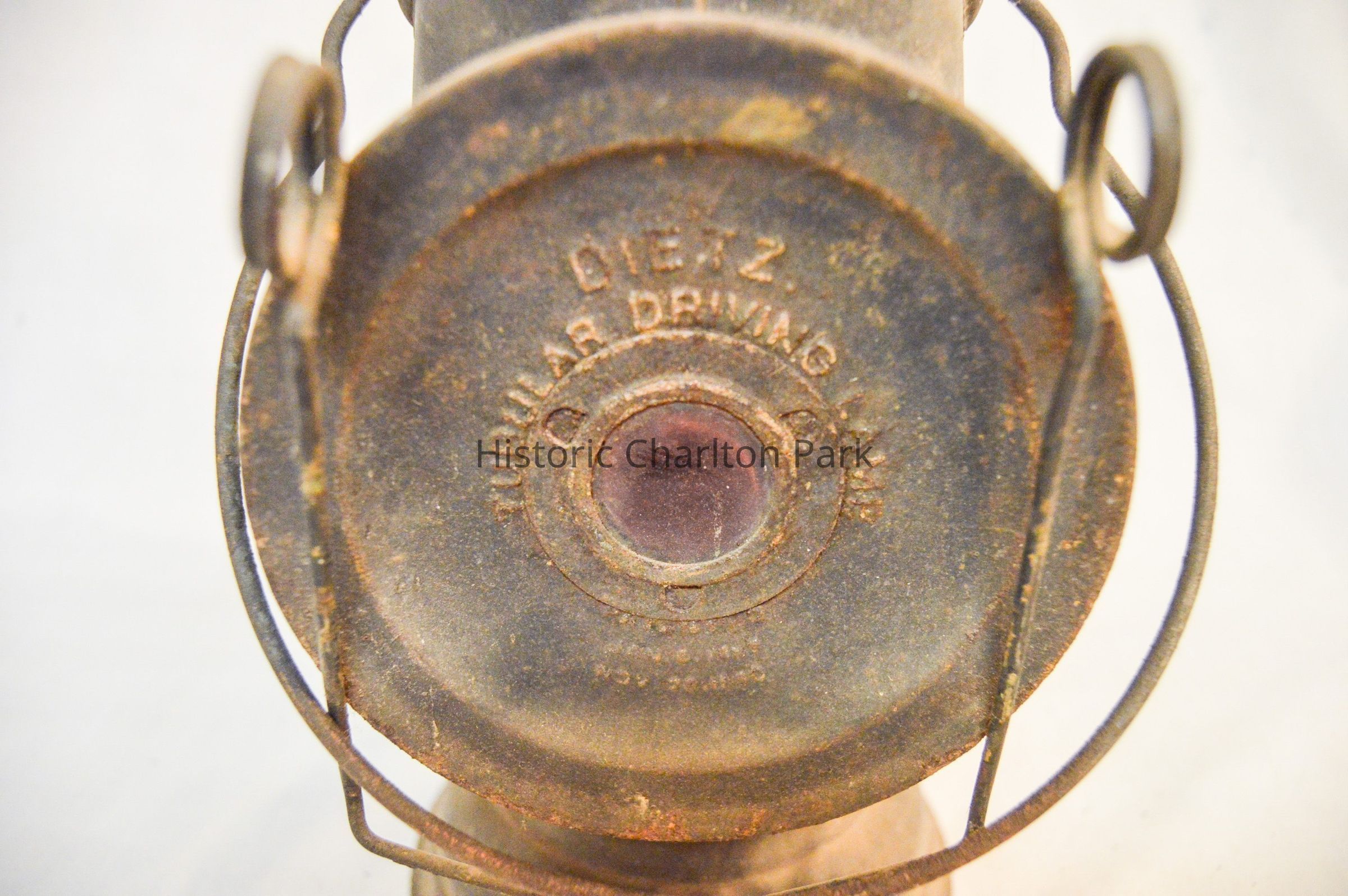 Kerosene driving lamp with a circular base that supports the body, which is cylindrical and has a horizontal orientation. The front of the lamp body has a glass reflector, which is cracked and housed in a metal frame. The metal frame is clasped to the body on the right and left sides. The back of the lamp is flat and has a small, red reflector in the center and inscriptions in the metal around it. There are also two circular coils that are attached to each other by a square-shaped wire. The top of the lamp is cylindrical and has three stacked discs around it. The top and middle discs are touching and are attached to a thinner cylinder that nests inside the bottom one. There is a looped metal handle attached below the bottom disc.