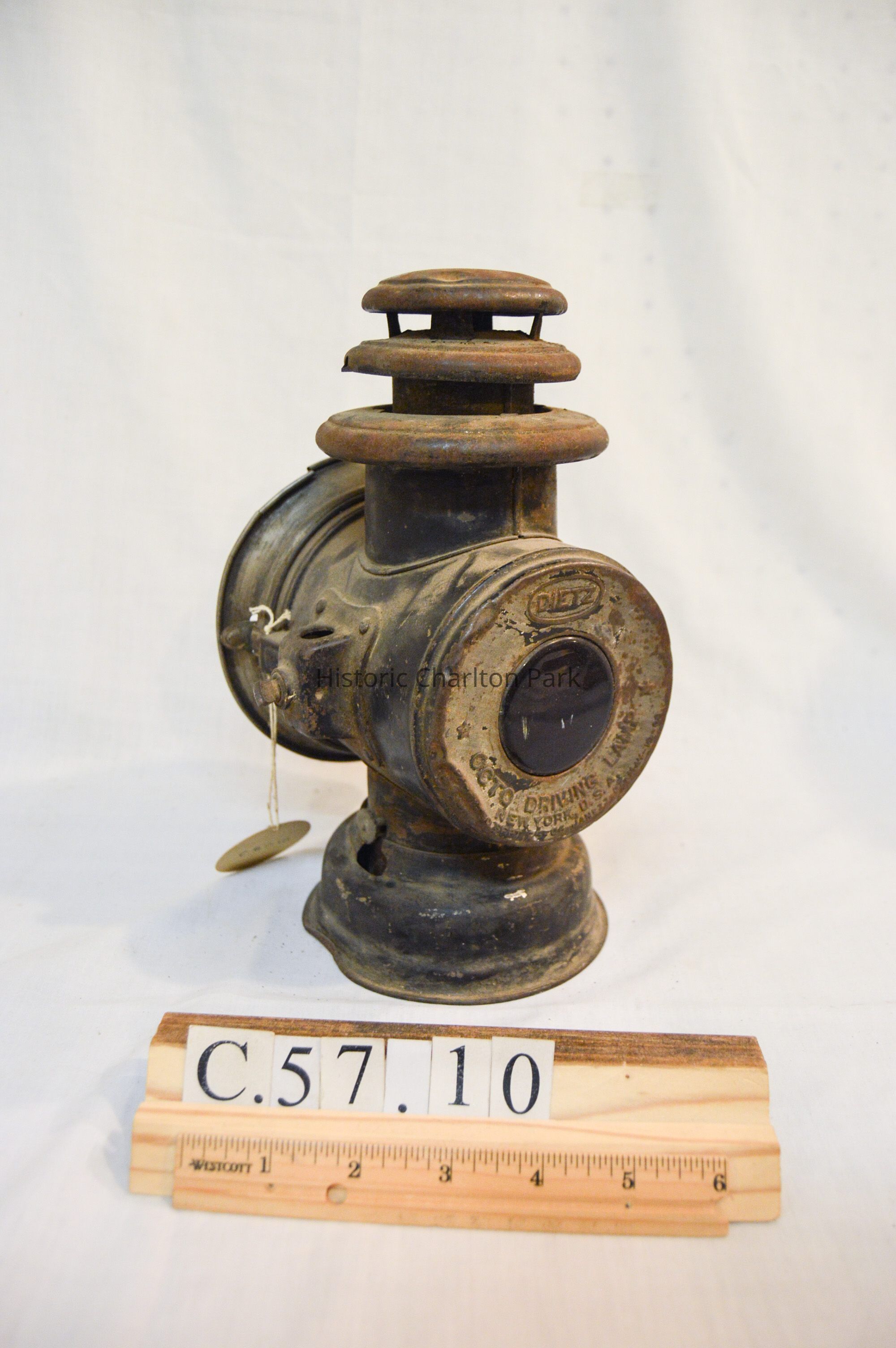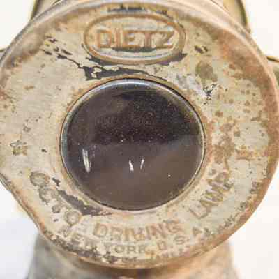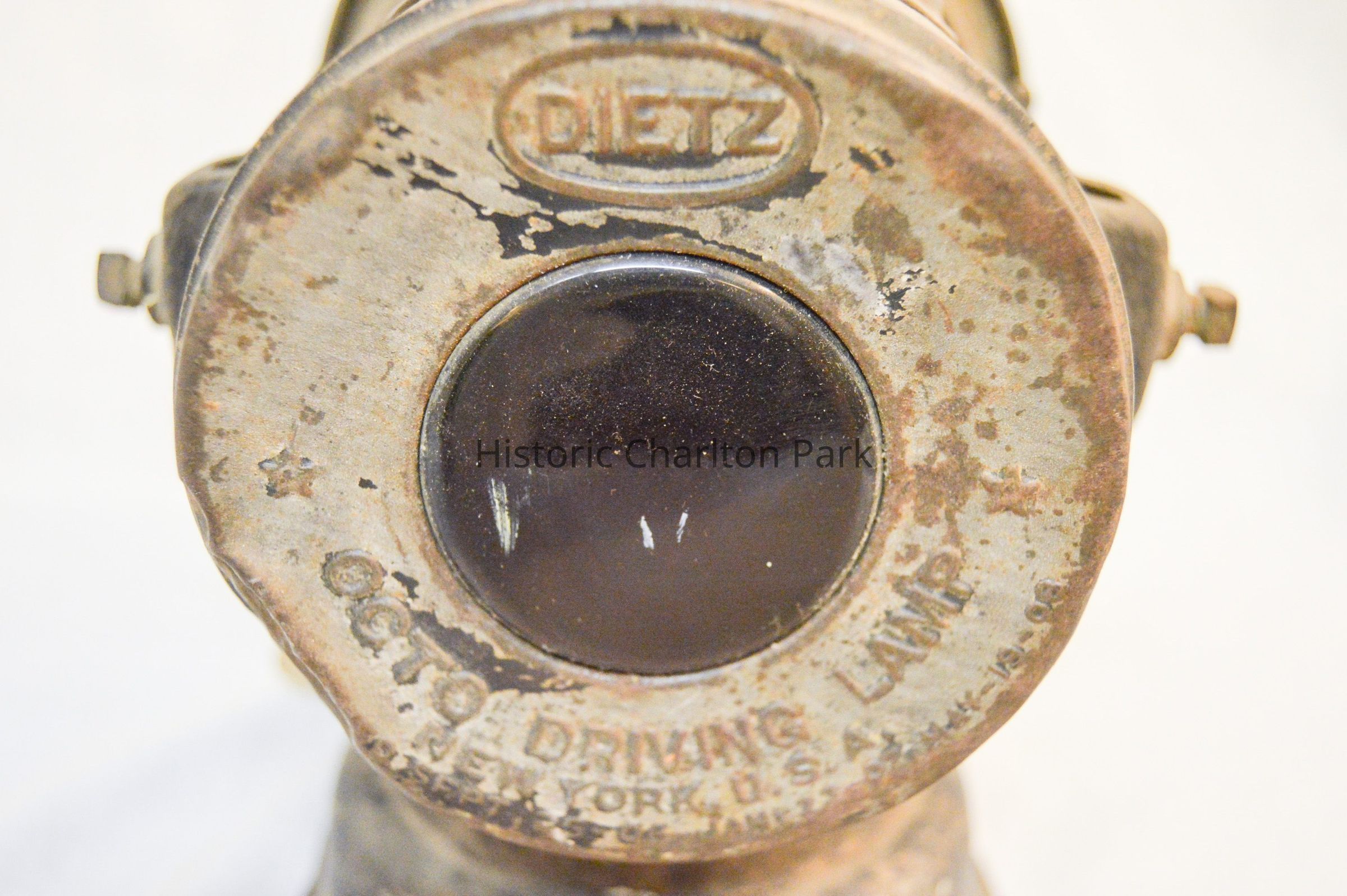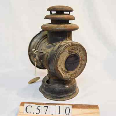 Large kerosene driving lantern with a circular base and a horizontal, cylindrical body. There is a large, cone-shaped reflector on the front of the lantern, but it is missing a glass window. The reflector swings open on a hinge and clasps to the lantern on the right side. There are two slots for brackets, one on each side, used to attach the lantern to a vehicle. A small knob sits below the right bracket and is used to adjust the light. The back of the lamp has a red, circular glass reflector and inscription on the metal. The top of the lamp is cylindrical and has three concentric discs, each with space between them.Inscription/Signature/Marks