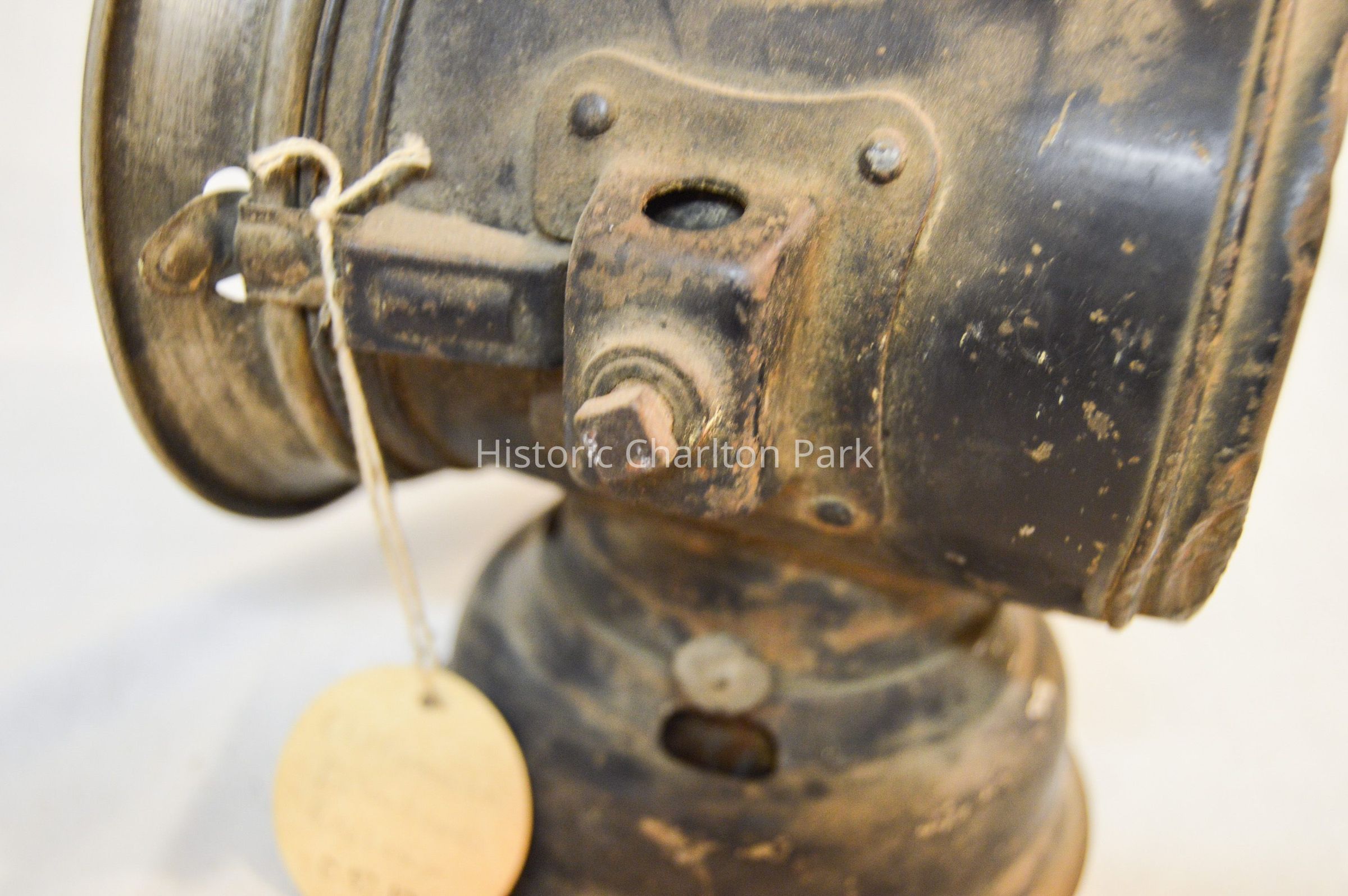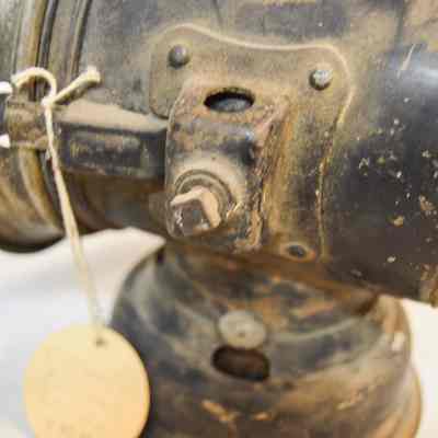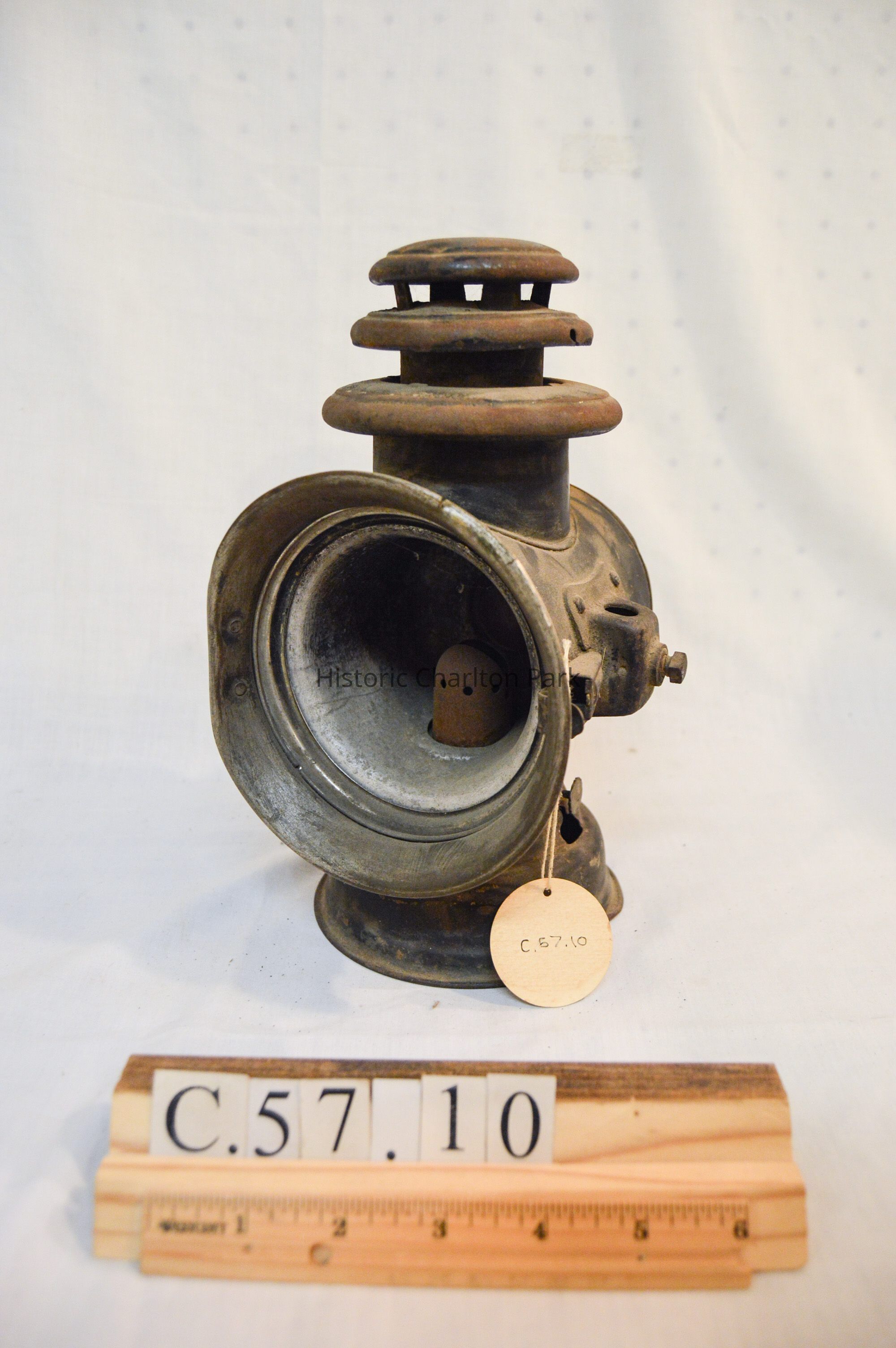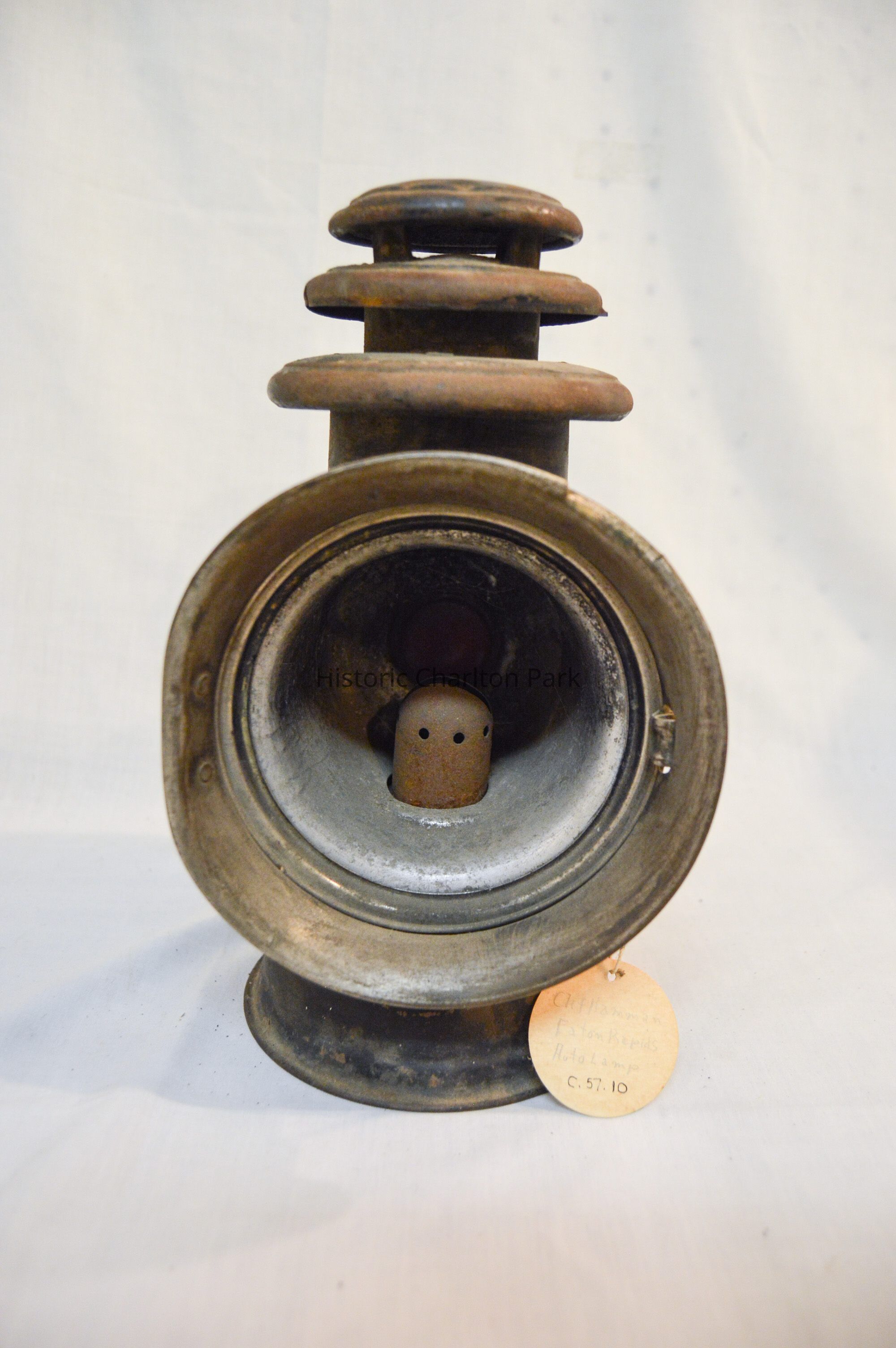 Large kerosene driving lantern with a circular base and a horizontal, cylindrical body. There is a large, cone-shaped reflector on the front of the lantern, but it is missing a glass window. The reflector swings open on a hinge and clasps to the lantern on the right side. There are two slots for brackets, one on each side, used to attach the lantern to a vehicle. A small knob sits below the right bracket and is used to adjust the light. The back of the lamp has a red, circular glass reflector and inscription on the metal. The top of the lamp is cylindrical and has three concentric discs, each with space between them.Inscription/Signature/Marks