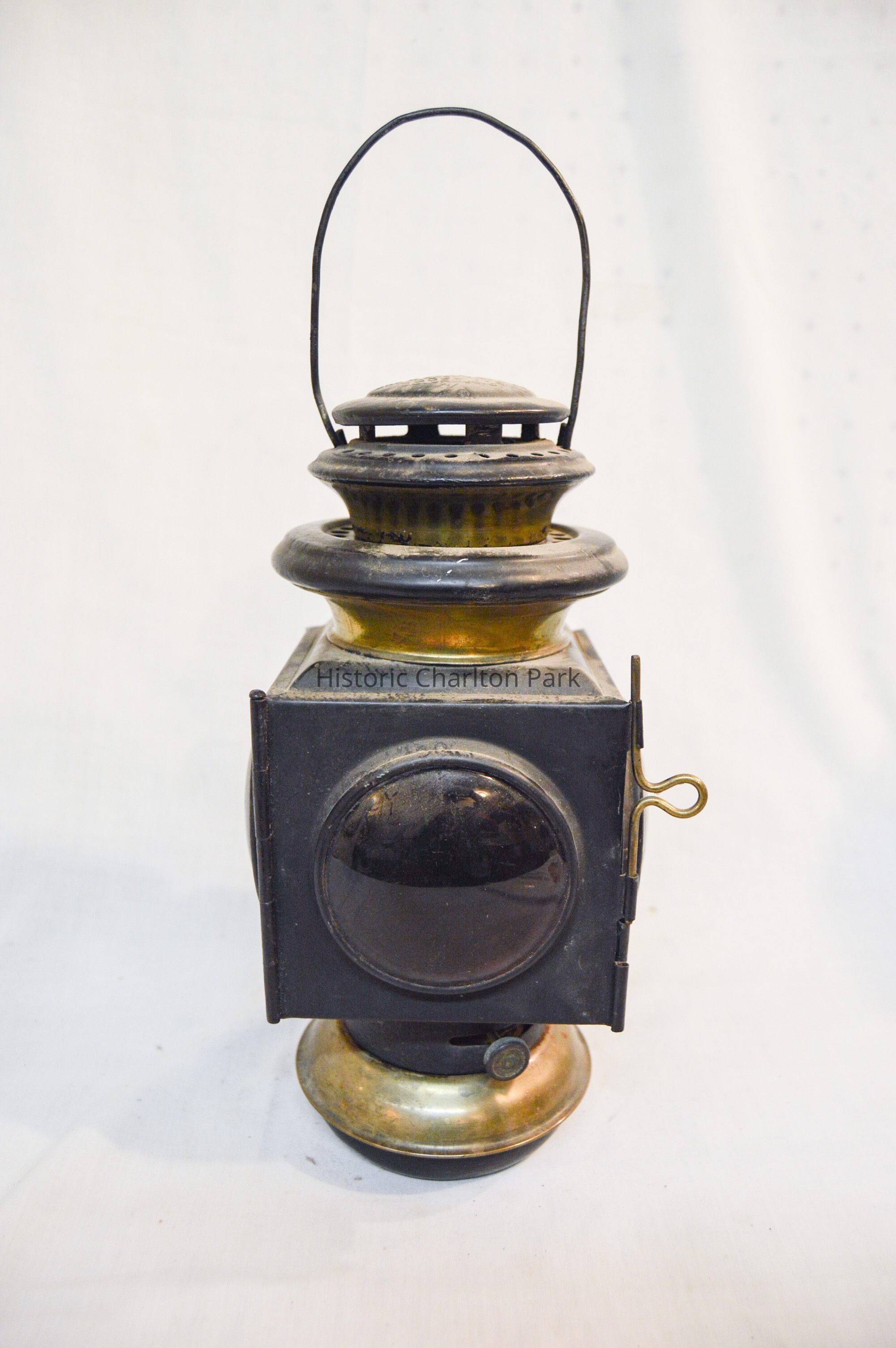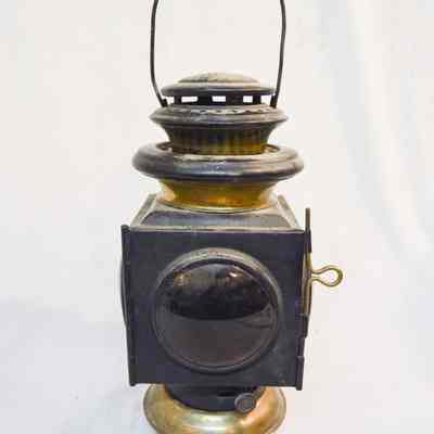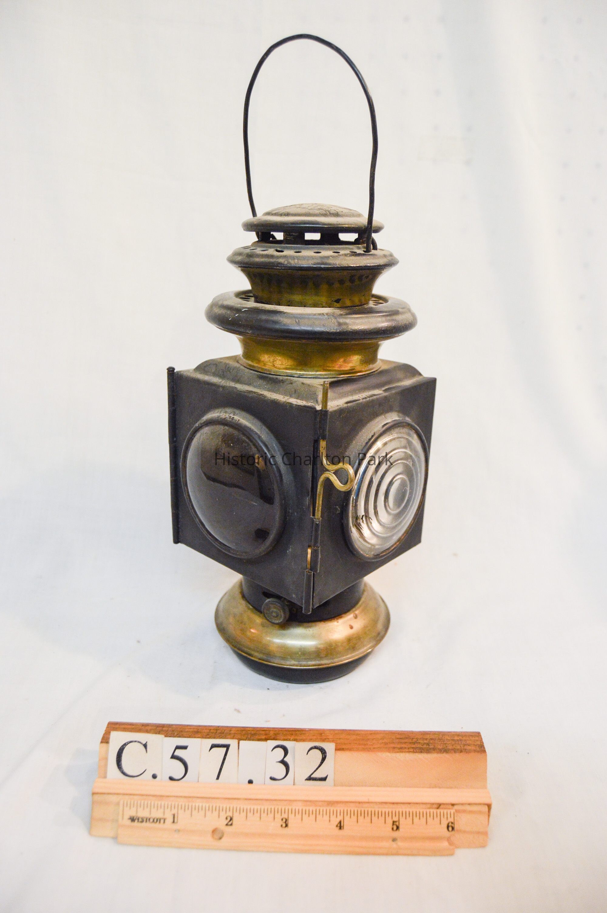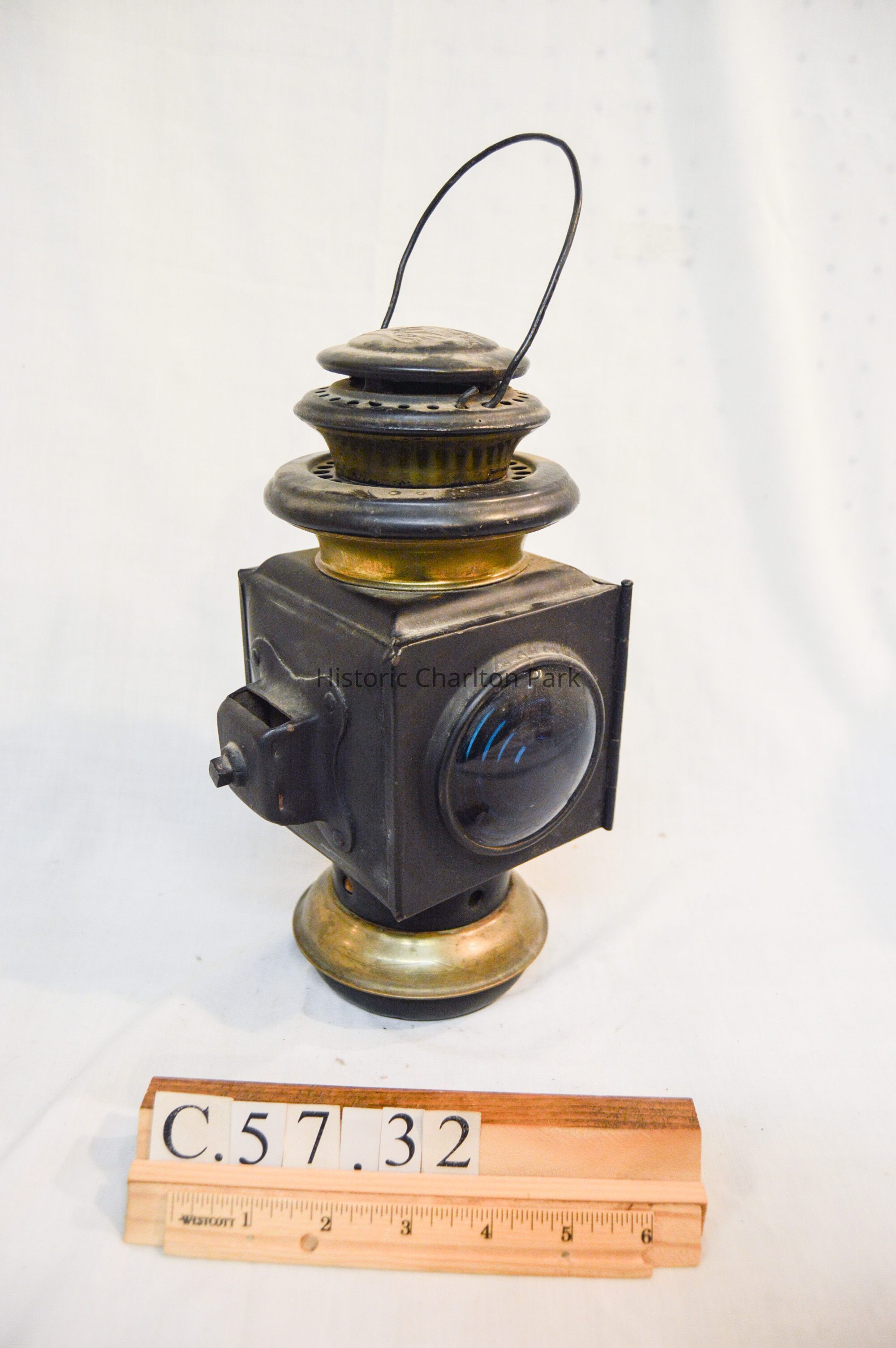 Ford kerosene driving lantern painted black with brass highlights The base of the lantern is circular and has a brass ring around the top. There is a round, wick-adjusting knob near the top of of the base. The lantern body is cube-shaped and has three sides with circular glass reflectors. The back side has a bracket attachment. The front reflector is red and its frame opens on a hinge. The left side reflector is blue, and the right side reflector is clear. The top of the lantern is also generally cylindrical and has three discs around it, the bottom and middle having circular vents around them. The top has an inscription and a looped metal handle.Inscription/Signature/Marks