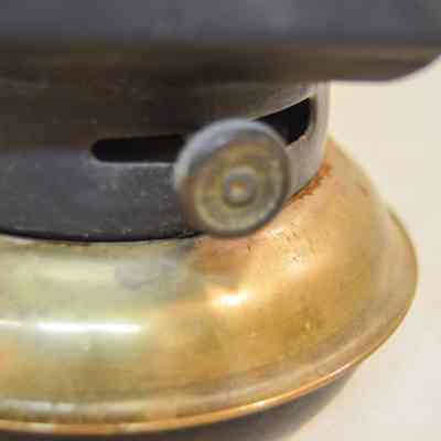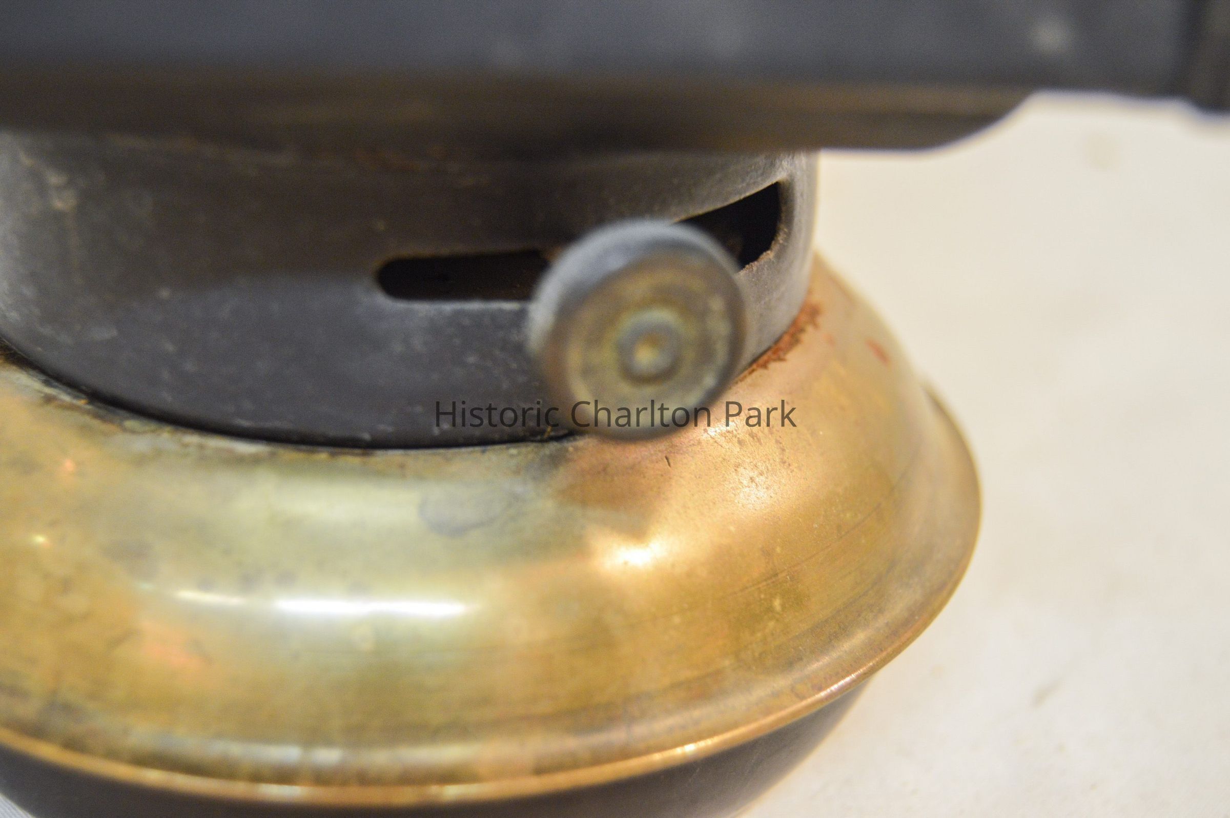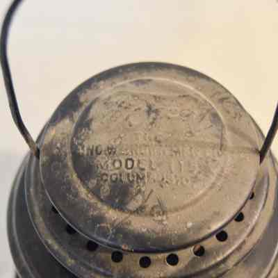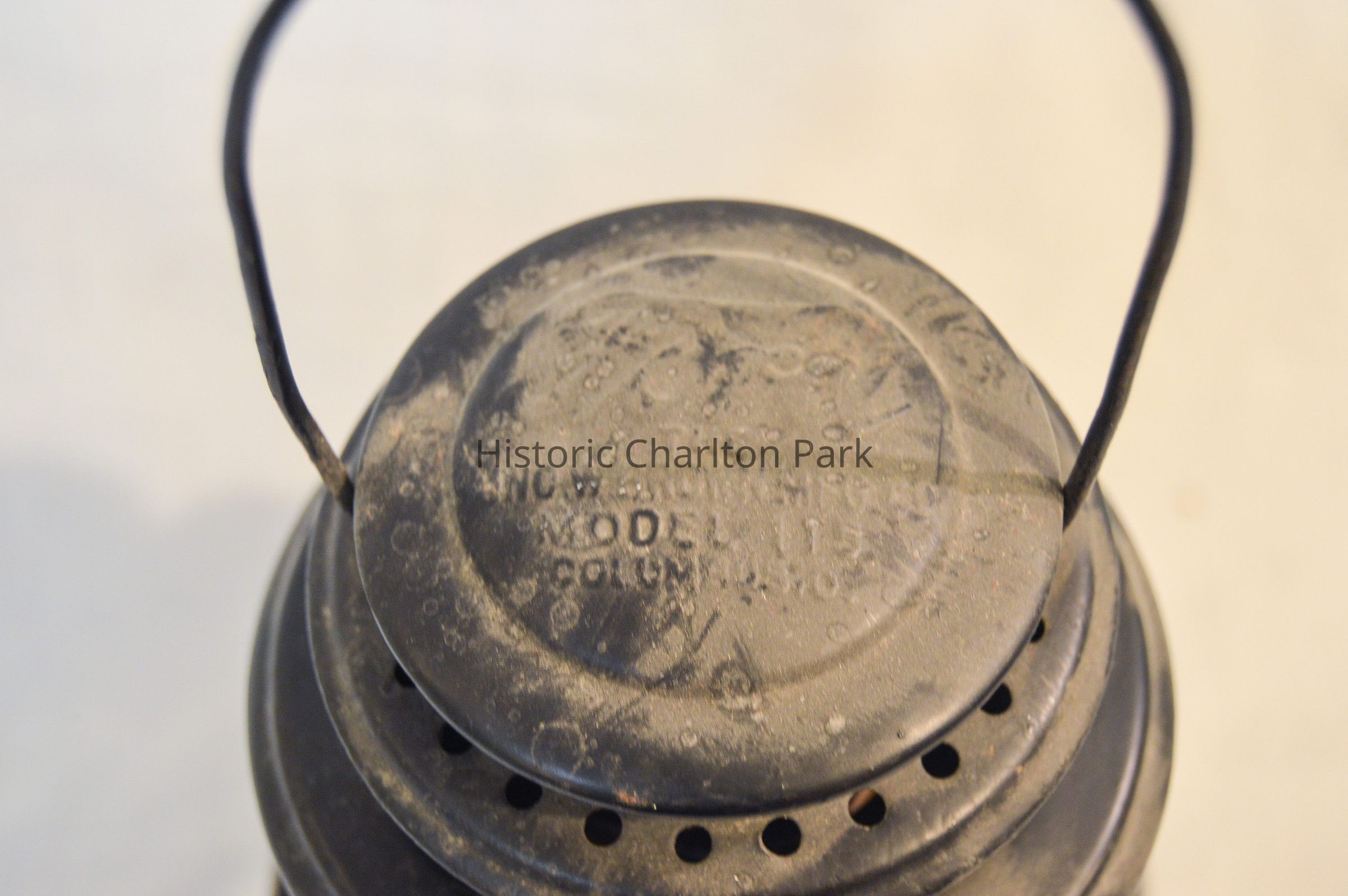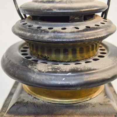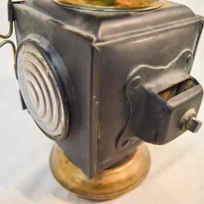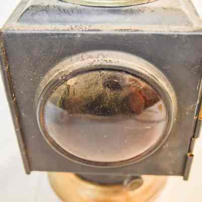 Ford kerosene driving lantern painted black with brass highlights The base of the lantern is circular and has a brass ring around the top. There is a round, wick-adjusting knob near the top of of the base. The lantern body is cube-shaped and has three sides with circular glass reflectors. The back side has a bracket attachment. The front reflector is red and its frame opens on a hinge. The left side reflector is blue, and the right side reflector is clear. The top of the lantern is also generally cylindrical and has three discs around it, the bottom and middle having circular vents around them. The top has an inscription and a looped metal handle.Inscription/Signature/Marks