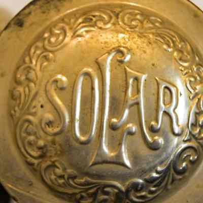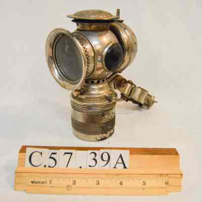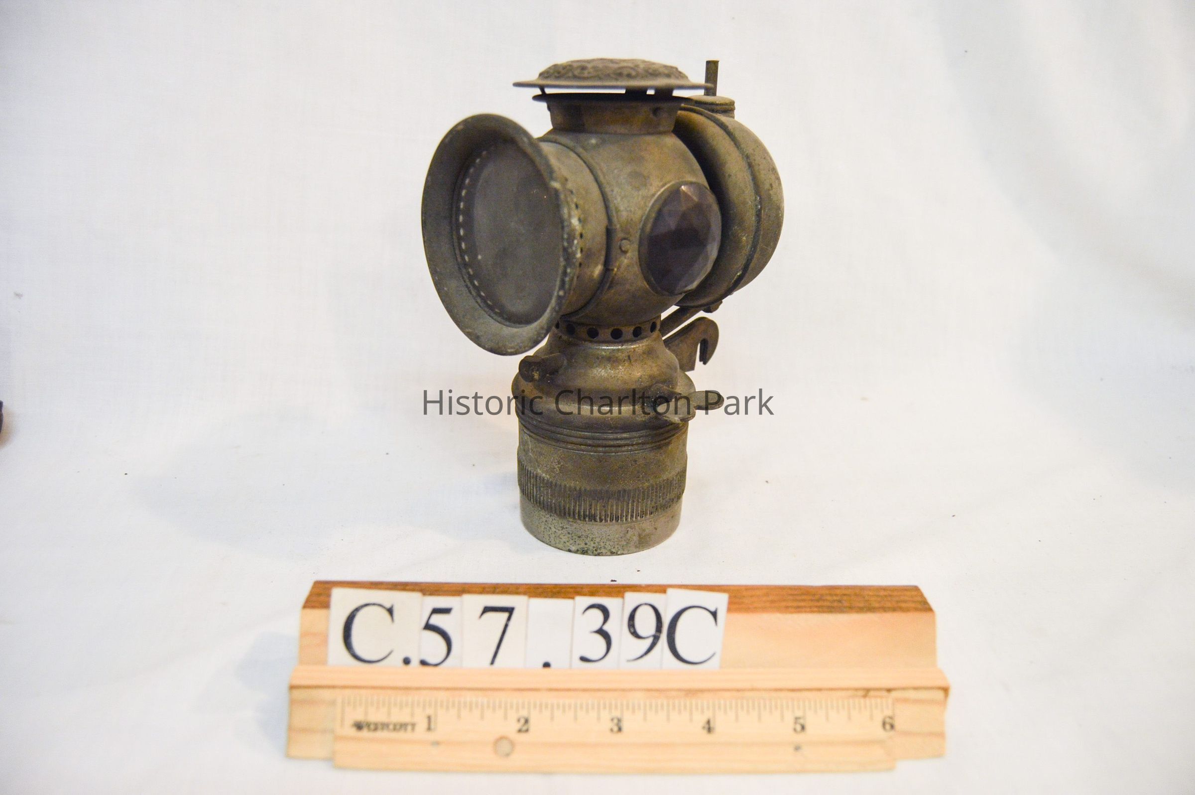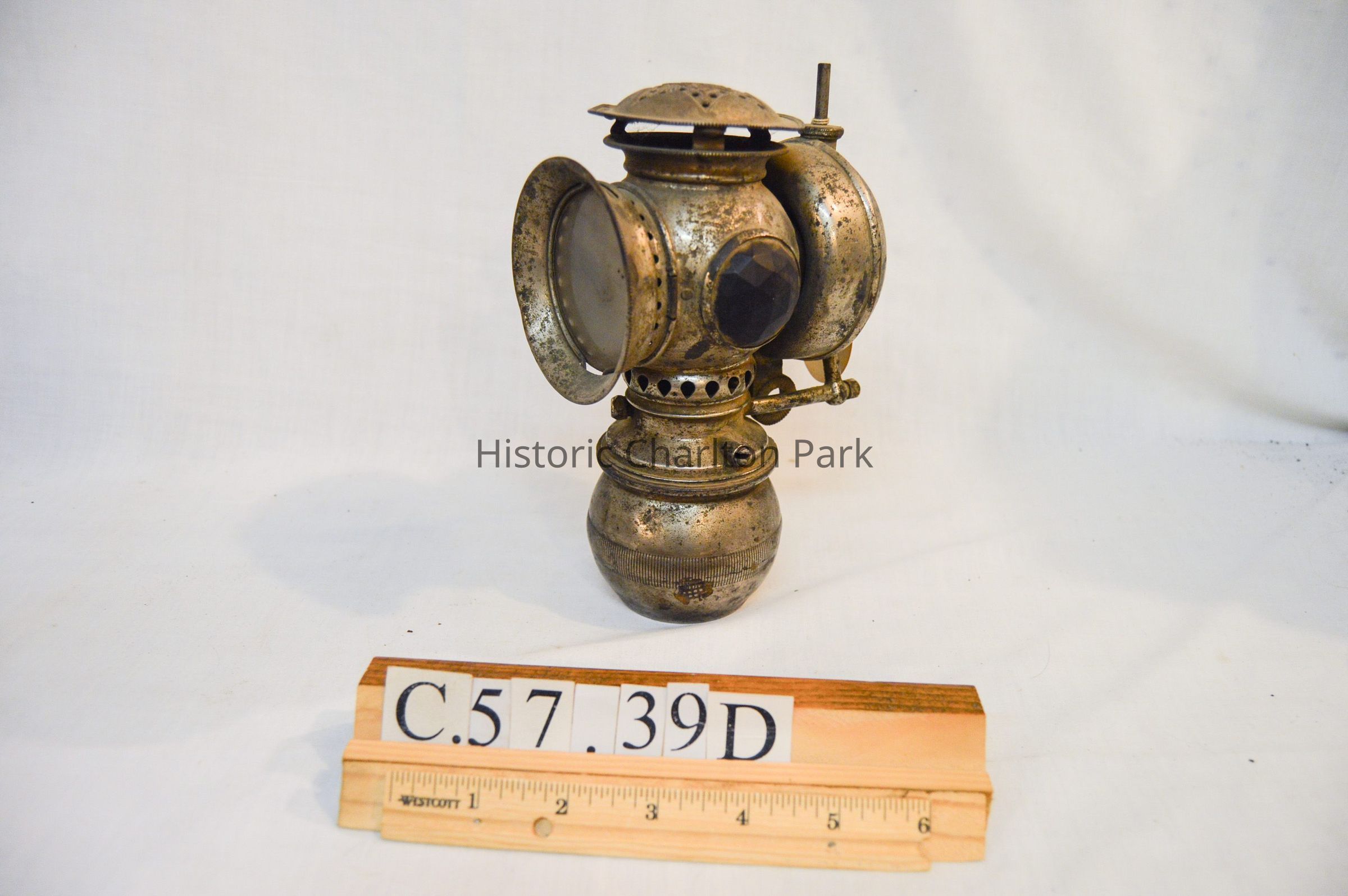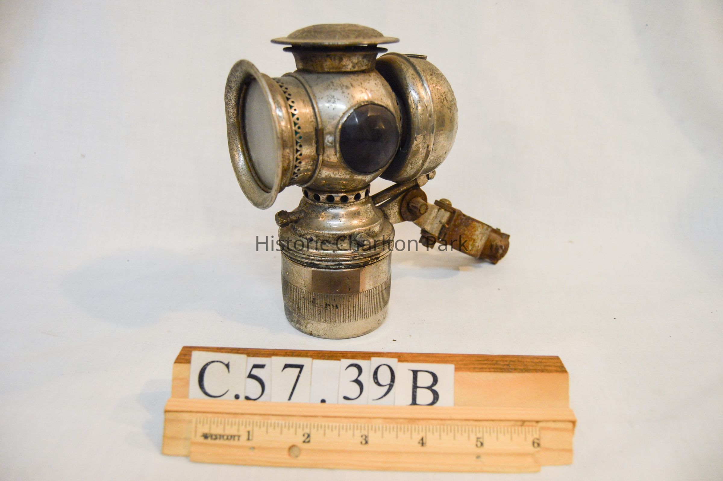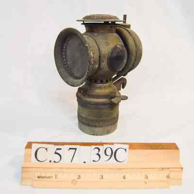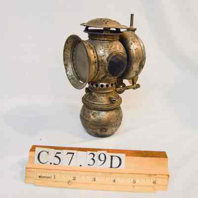 D: The lantern has a somewhat spherical bottom with vertical grooves around the middle. The lantern screws into the base at its top and has a somewhat horizontal, cylindrical shape. There is a large, cone-shape reflector on the front with a glass window, and two green, gem-shaped reflectors on the right and left sides, respectively. The back of the lamp has a circular fuel canister that is capped at the top. The cap has a metal tube that extends upward. The back of the lantern has a circular protrusion that a clamp attaches to, but that clamp is missing. The top of the lamp has a star pattern with an inscription and horizontal openings on the side.Made/Created