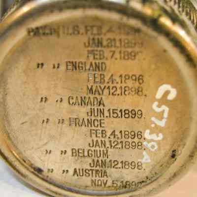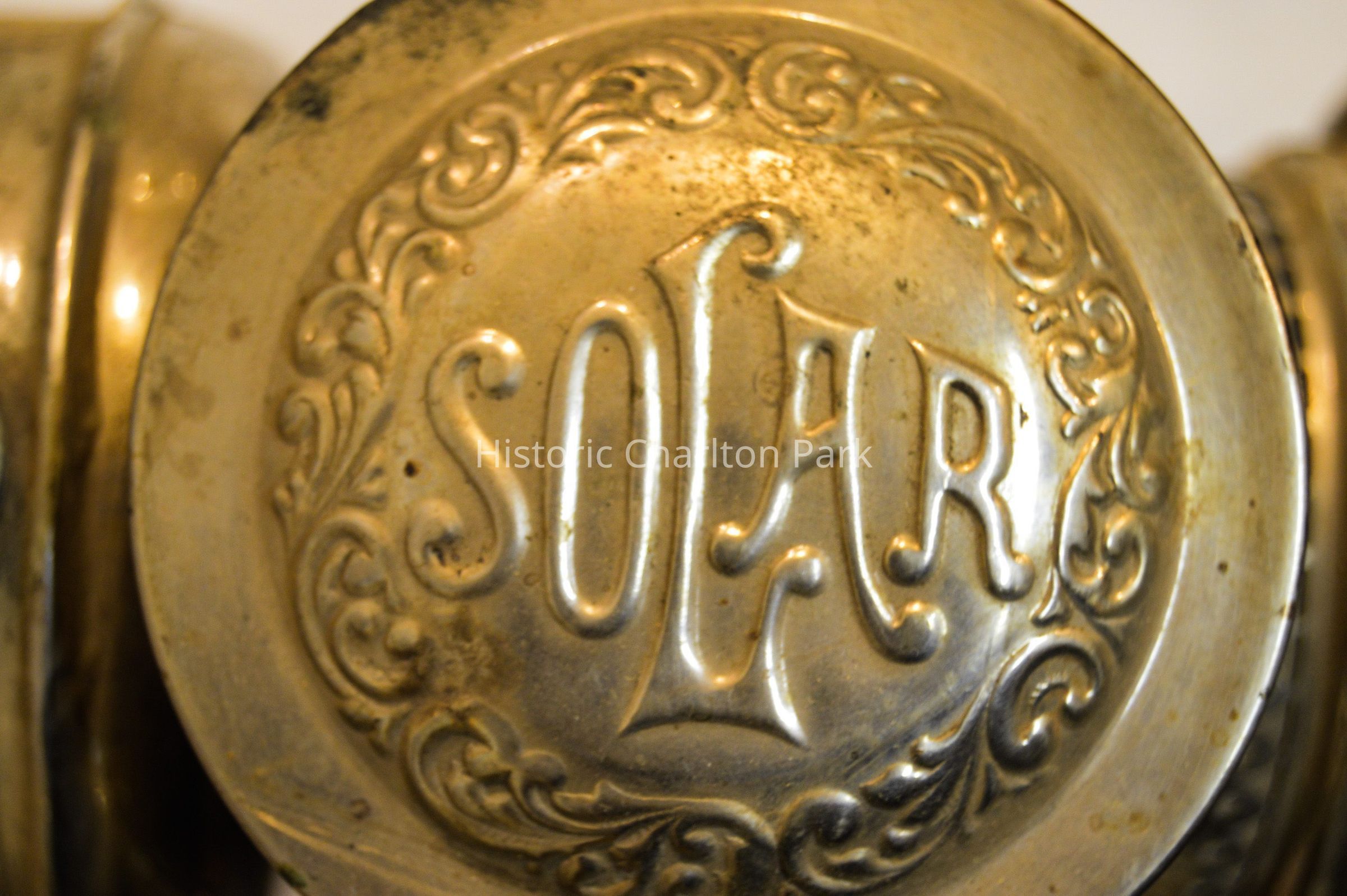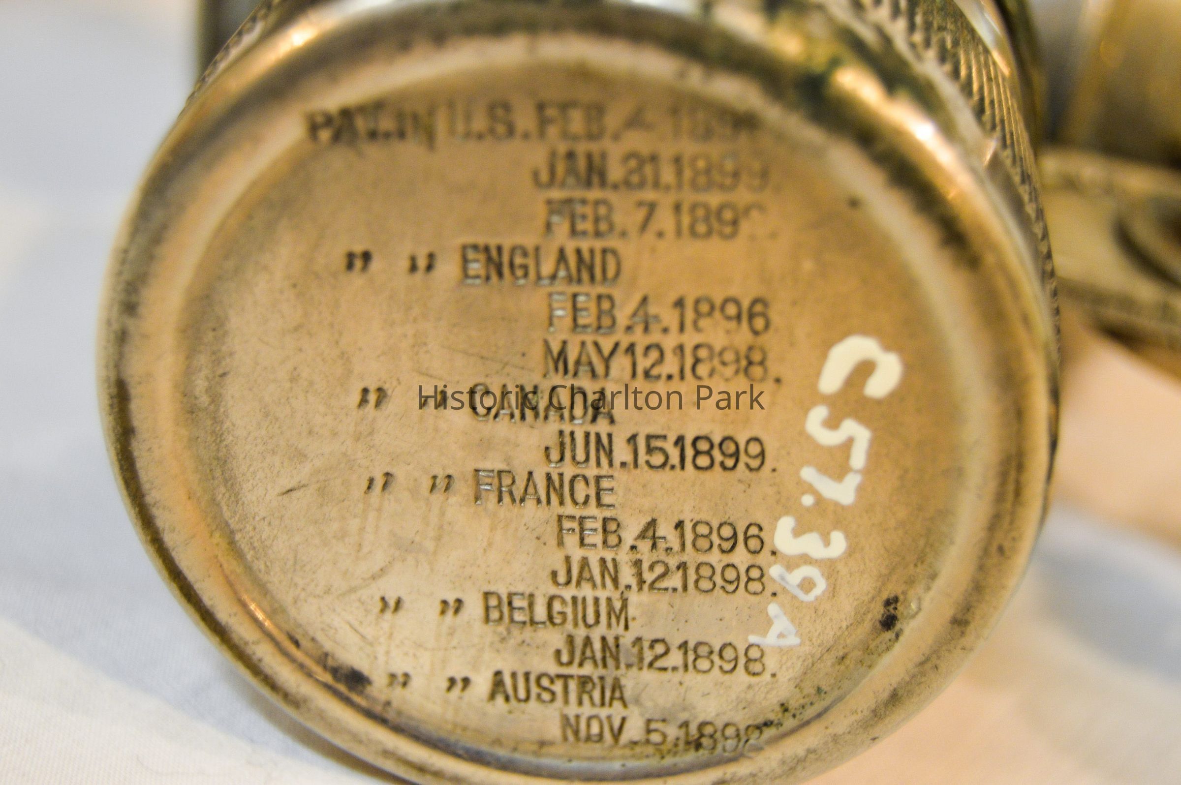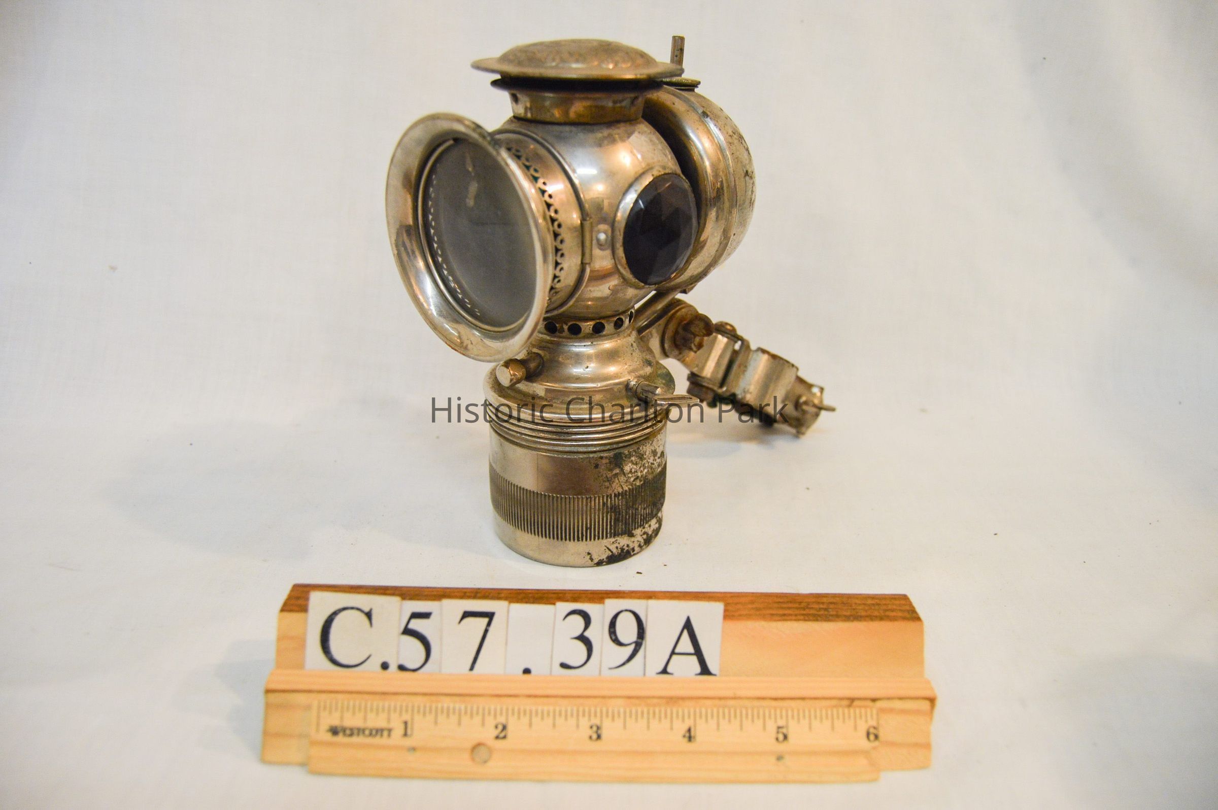 C: This lantern is identical to objects A and B, except it is missing the clamp arm on the back of the lamp. There is a different design near the rim of the front reflector as well, and a different inscription on the bottom of the lantern.