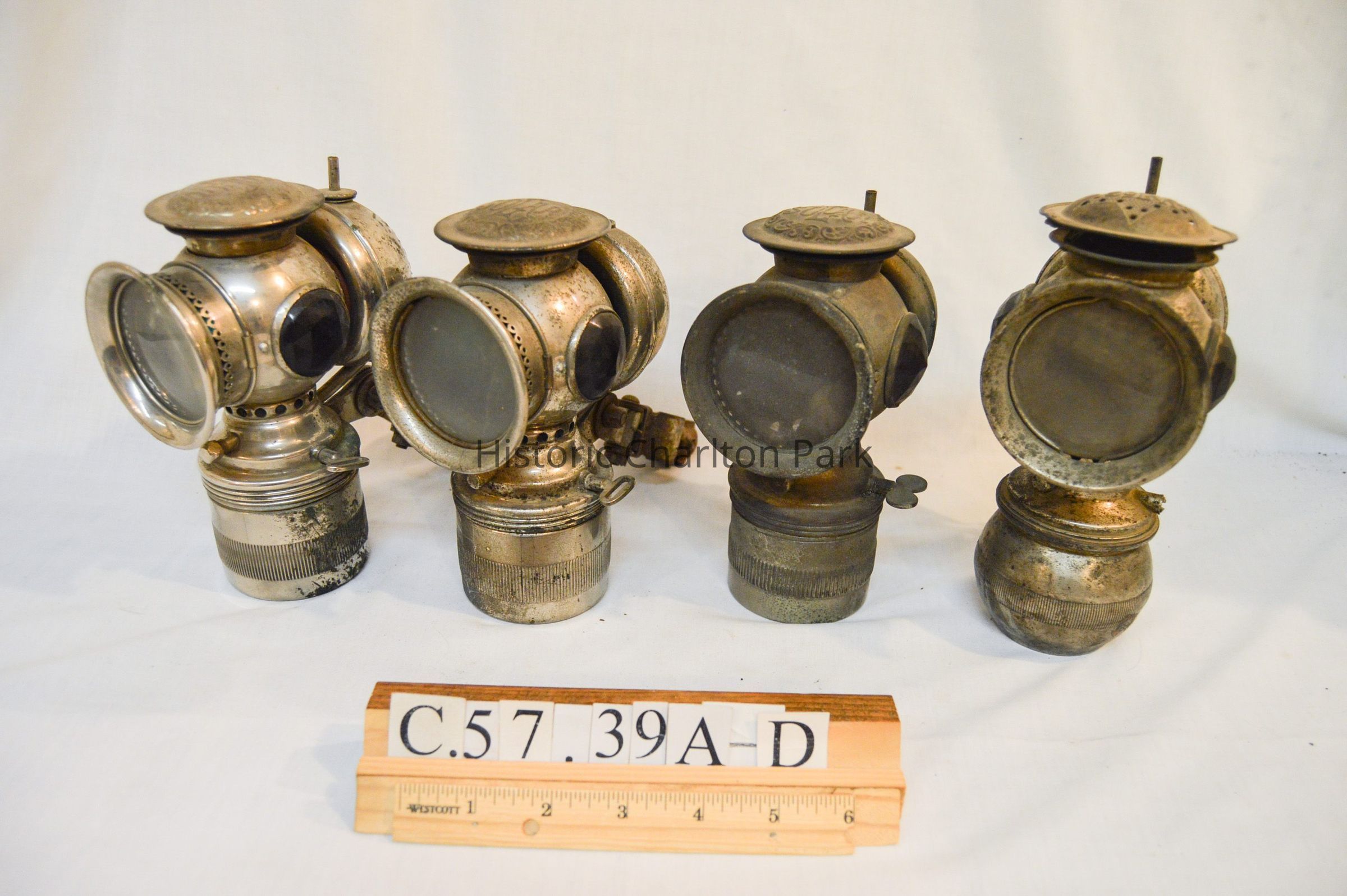 Four kerosene bicycle lamps (A-D) made of silver-colored metal.