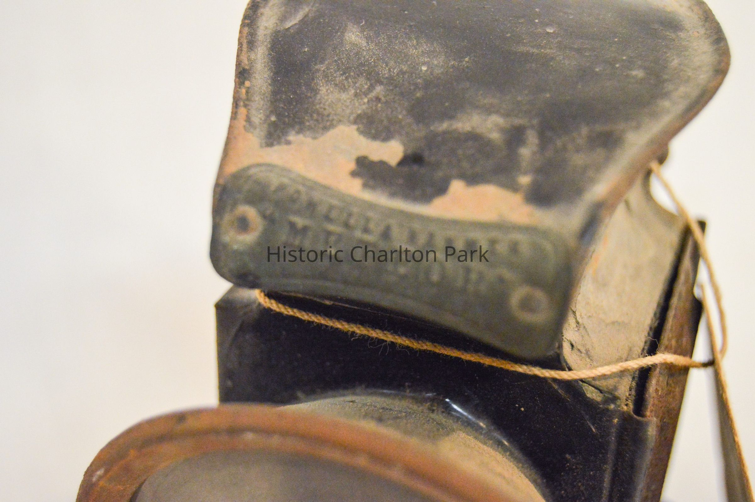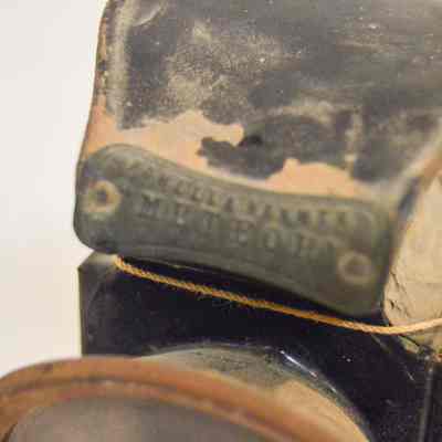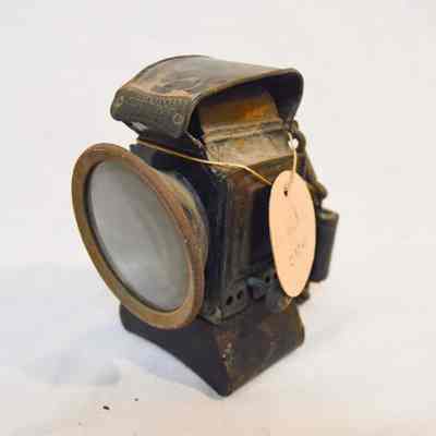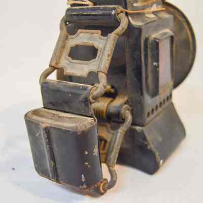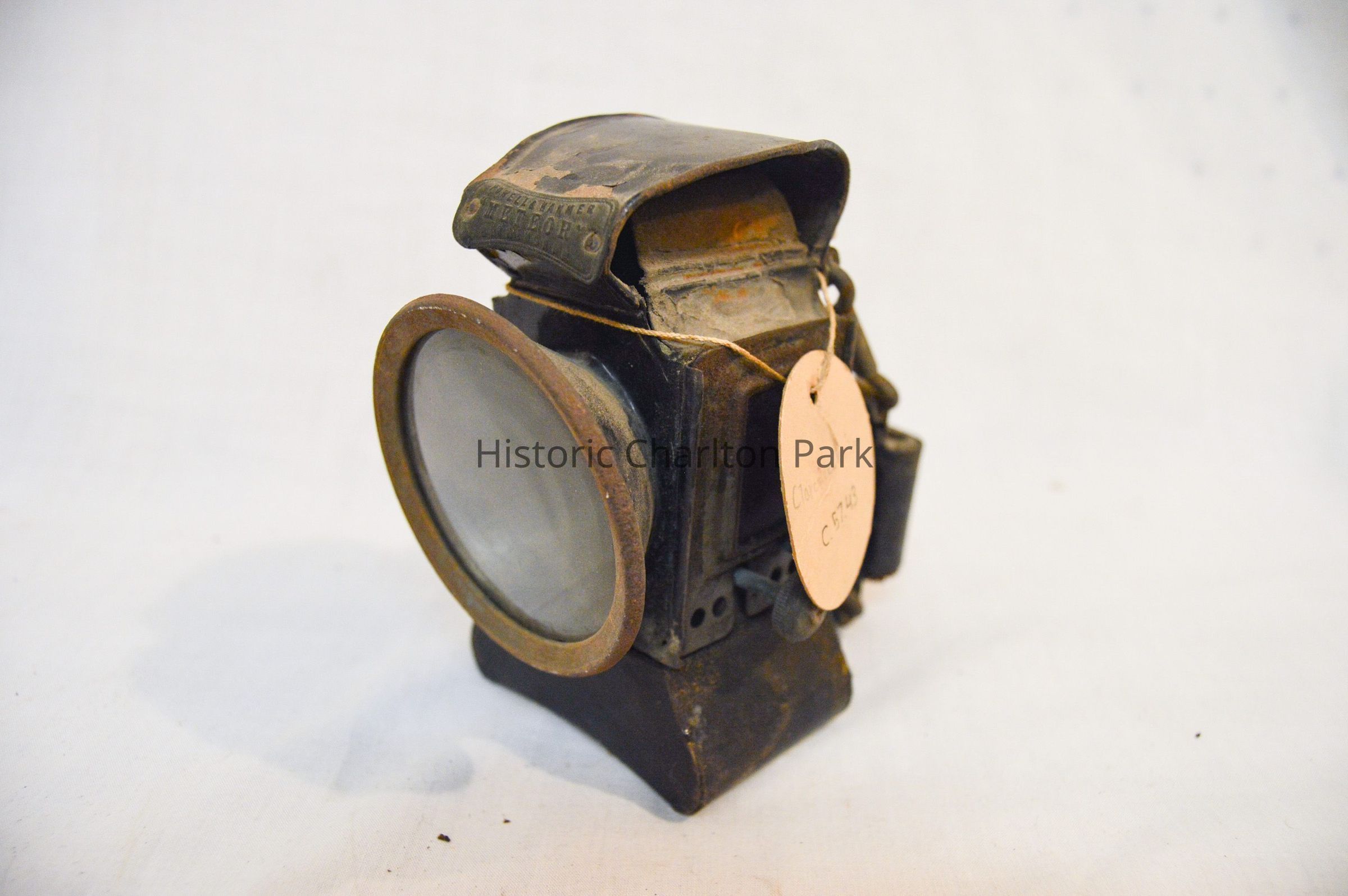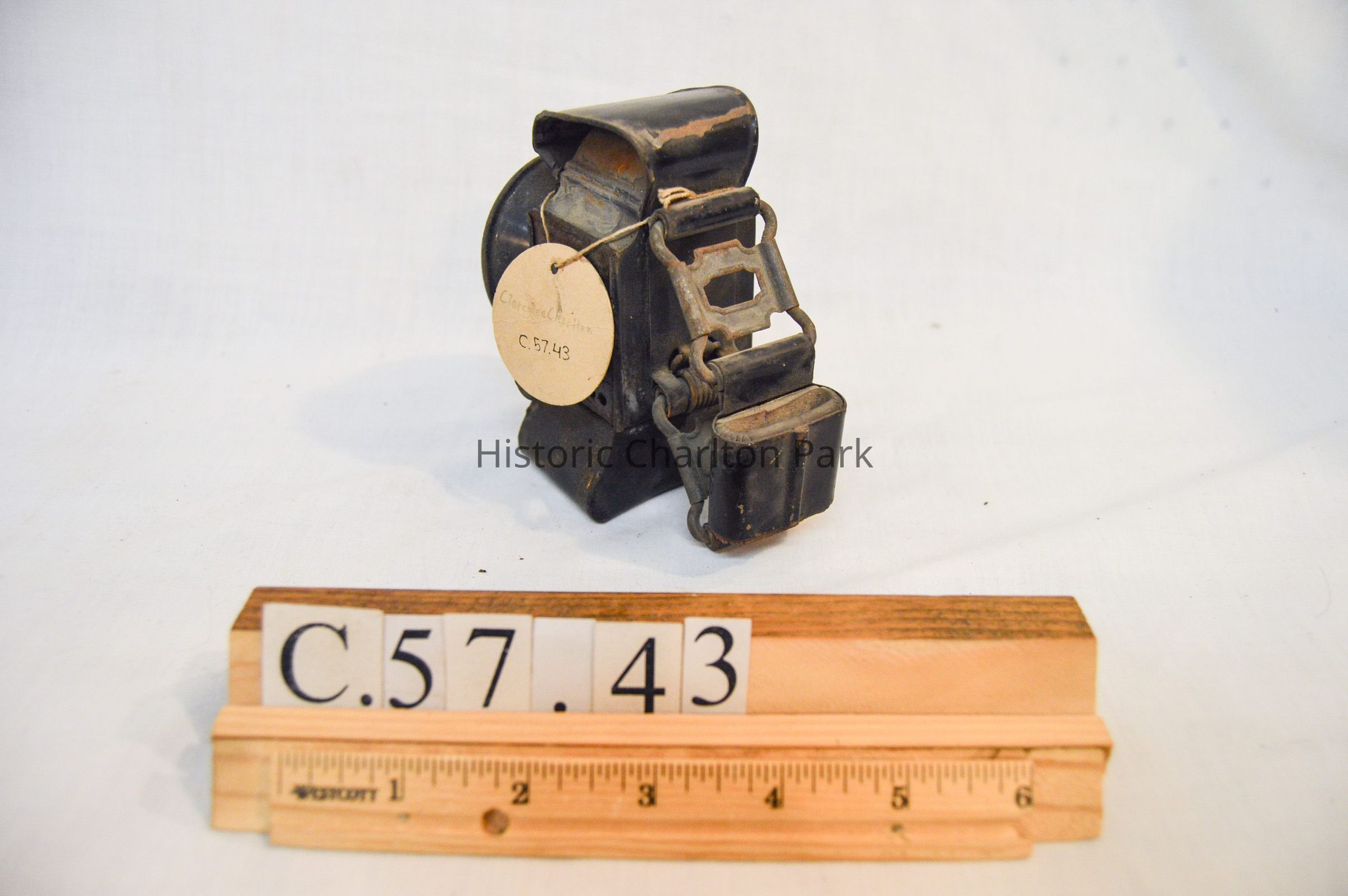 Small kerosene bicycle lantern made of metal and painted black. The body is rectangular, and has a trapezoidal base with rounded corners. There are two rectangular red reflectors on the sides made of glass. The right side has a round knob below the reflector. The front of the lamp has a cone-shaped reflector with a glass screen in the front. There is an oil burner on the inside of the lamp. Attached to the back, there is an adjustable metal box, allowing the lantern to attach to a bicycle. The top of the lantern is flat and has a nameplate on the front.Inscription/Signature/Marks
