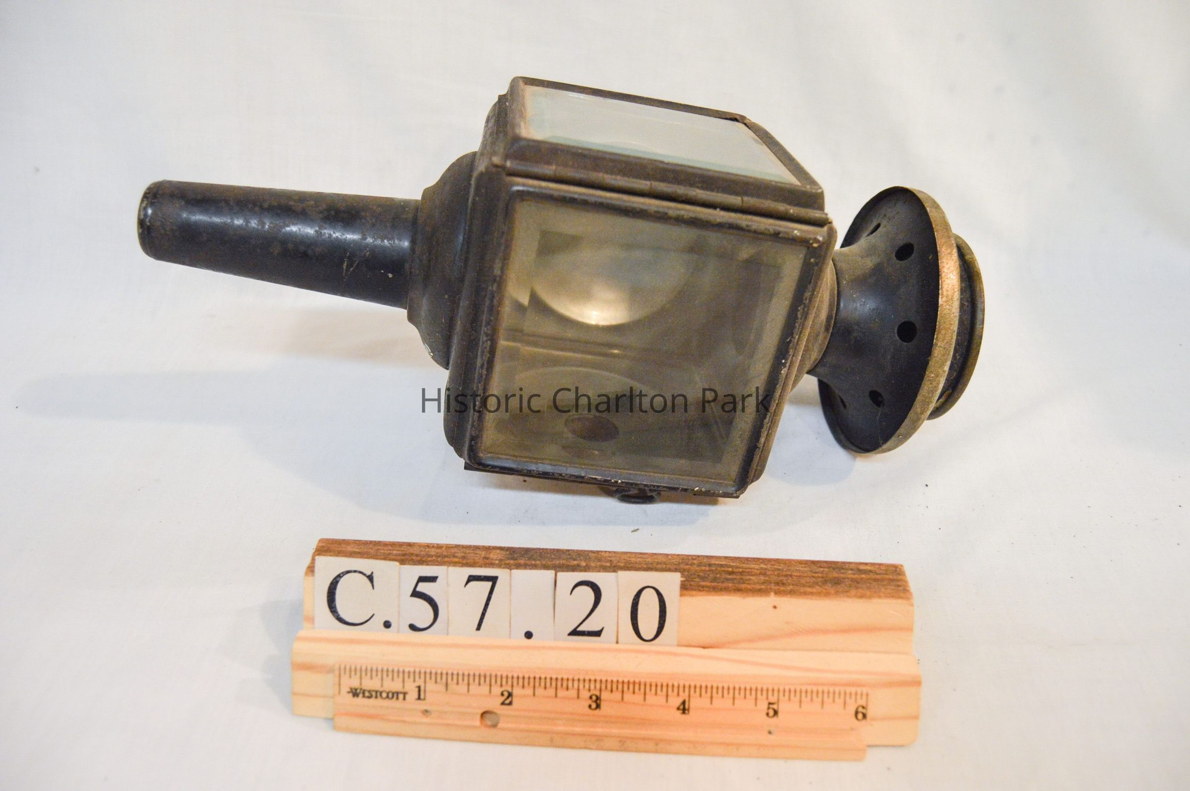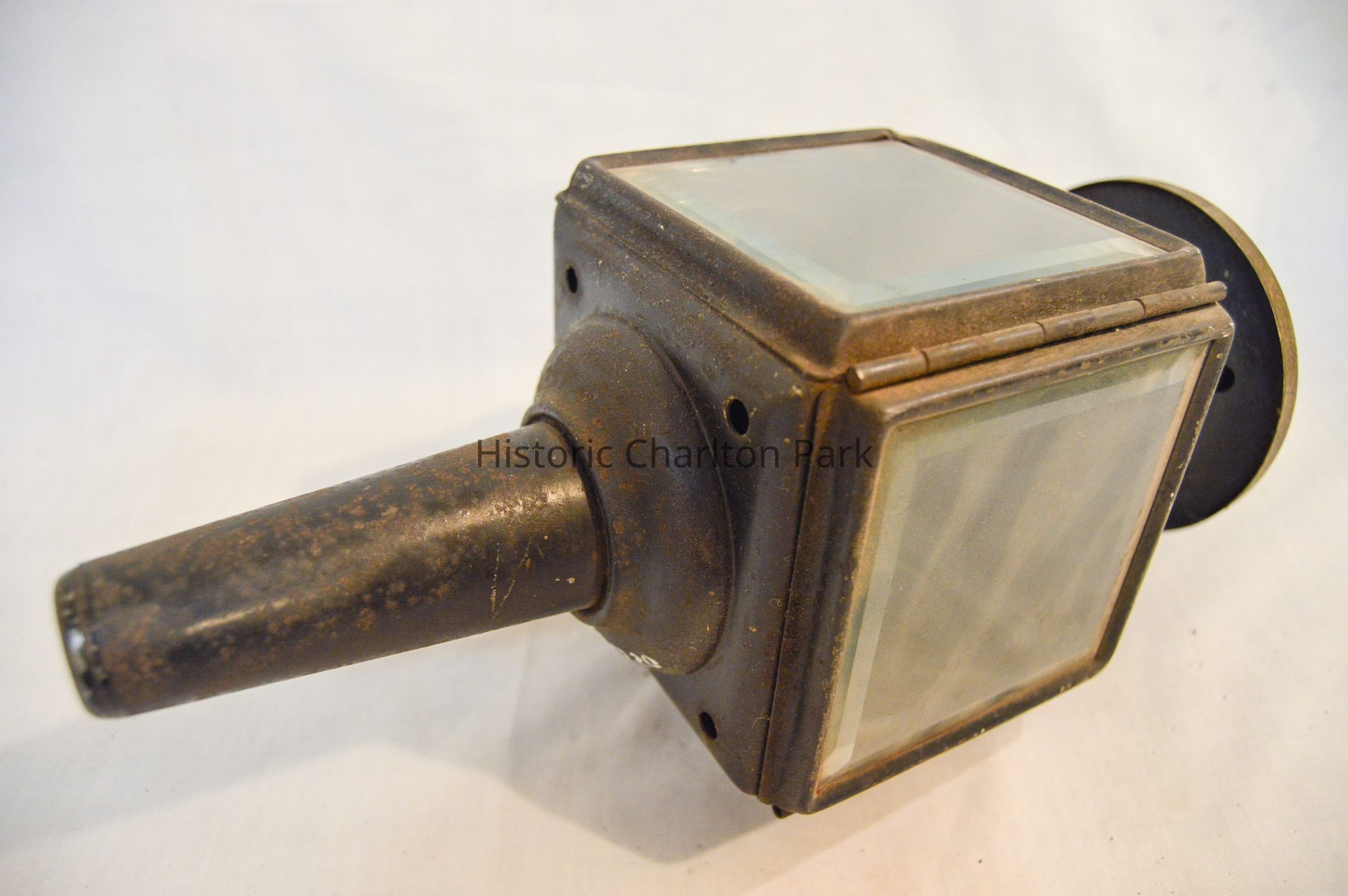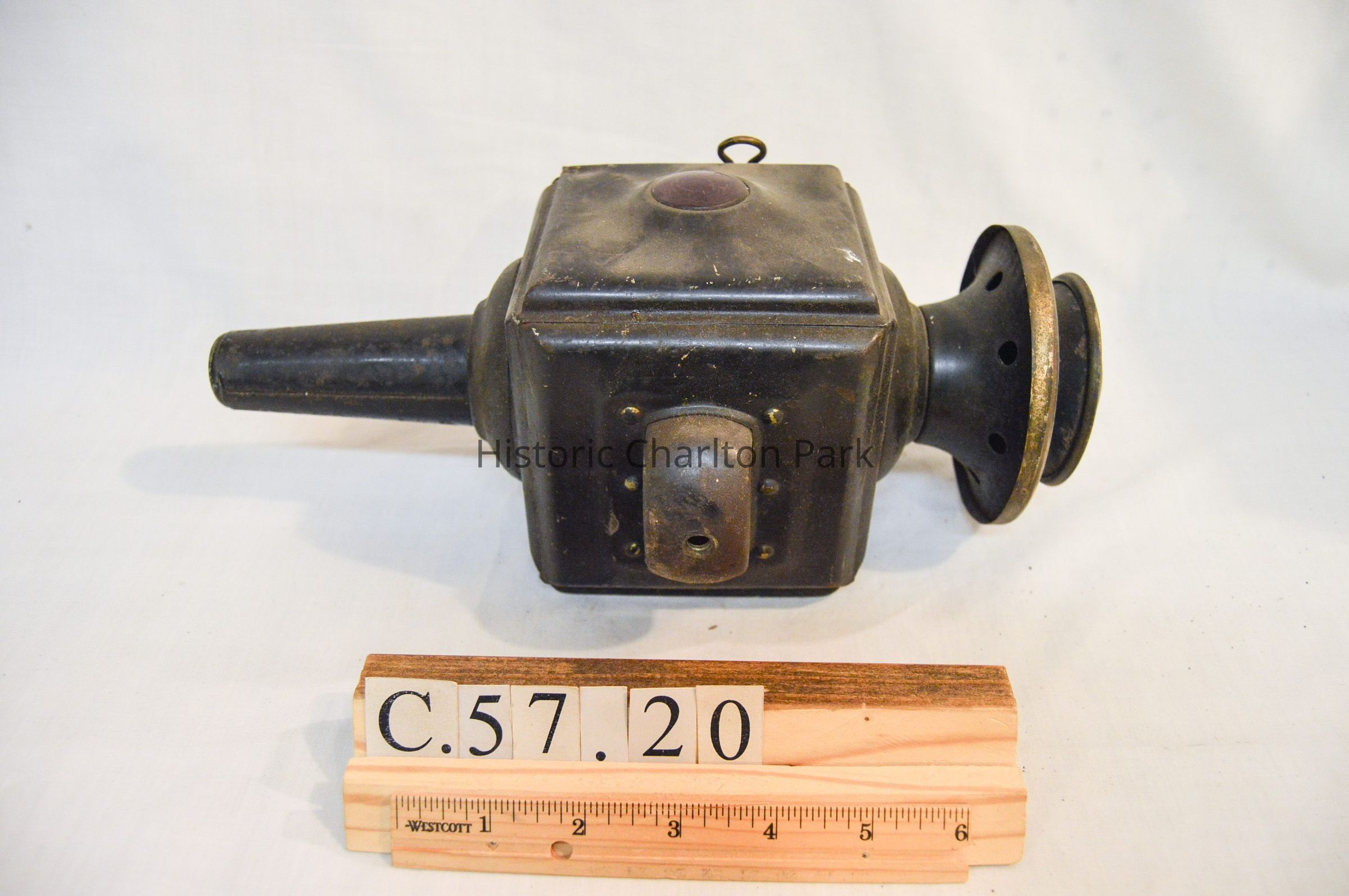 Kerosene driving lantern and the base of the lantern is tall and cylindrical and has an upward-facing, dome-shaped portion at the top that supports the body of the lantern. The body is square-shaped and has four sides. Two of the sides are flat metal and two are glass panels. One of the metal sides has a circular, red glass reflector in the middle. The other metal side has a rectangular bracket with holes in the top, bottom, and side to attach to a vehicle. One of the glass sides is housed in a panel that swings open from a hinge on the left and secures shut on the right. The top of the lamp is circular and has two layers, the top being dome-shaped and the bottom disc-shaped with circular vents on the underside.Inscription/Signature/Marks