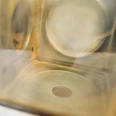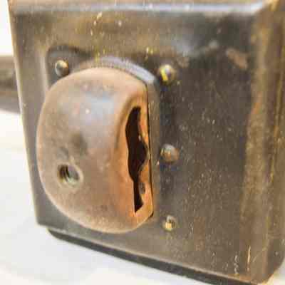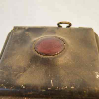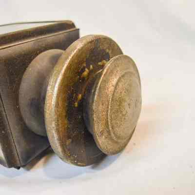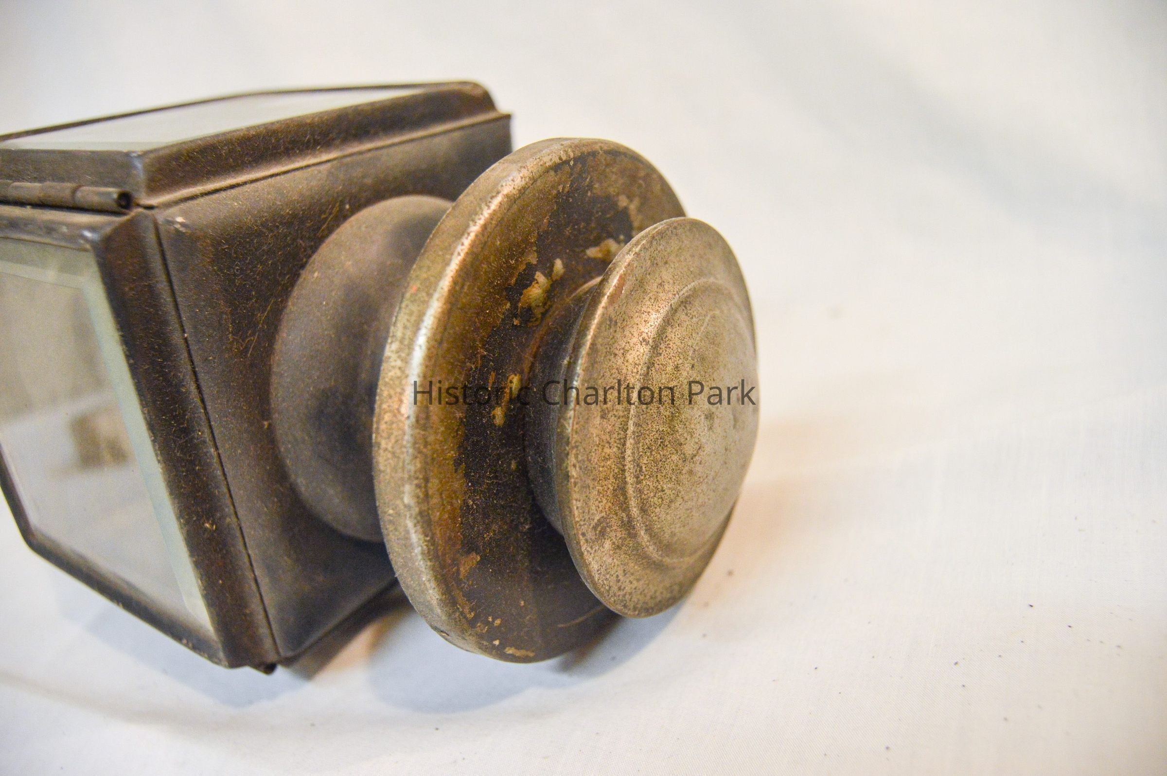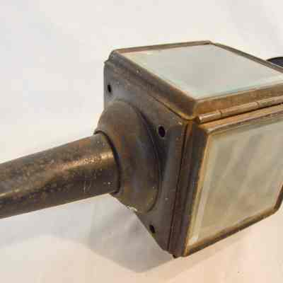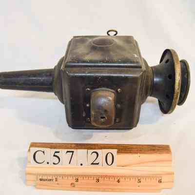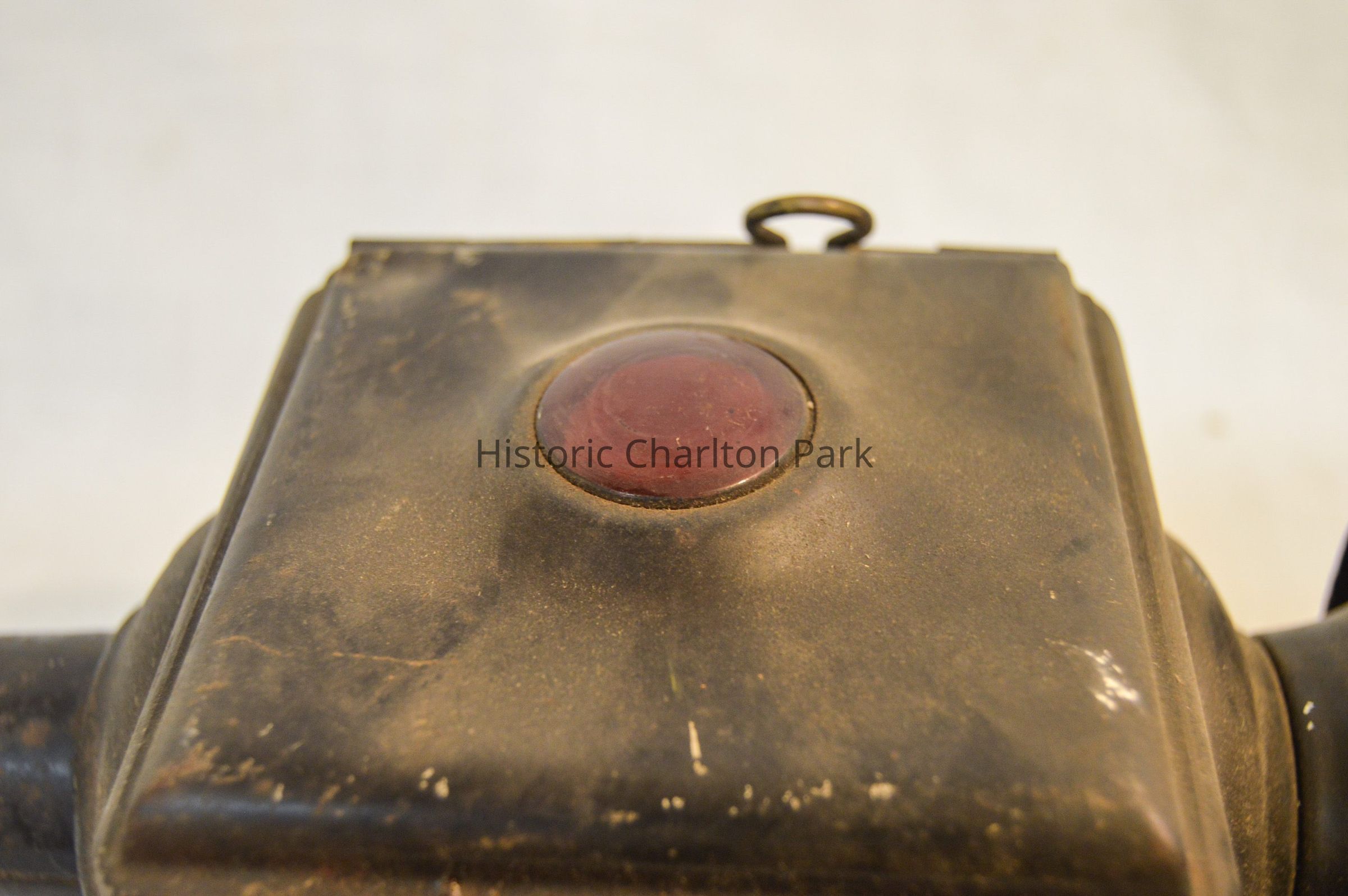 Kerosene driving lantern and the base of the lantern is tall and cylindrical and has an upward-facing, dome-shaped portion at the top that supports the body of the lantern. The body is square-shaped and has four sides. Two of the sides are flat metal and two are glass panels. One of the metal sides has a circular, red glass reflector in the middle. The other metal side has a rectangular bracket with holes in the top, bottom, and side to attach to a vehicle. One of the glass sides is housed in a panel that swings open from a hinge on the left and secures shut on the right. The top of the lamp is circular and has two layers, the top being dome-shaped and the bottom disc-shaped with circular vents on the underside.Inscription/Signature/Marks