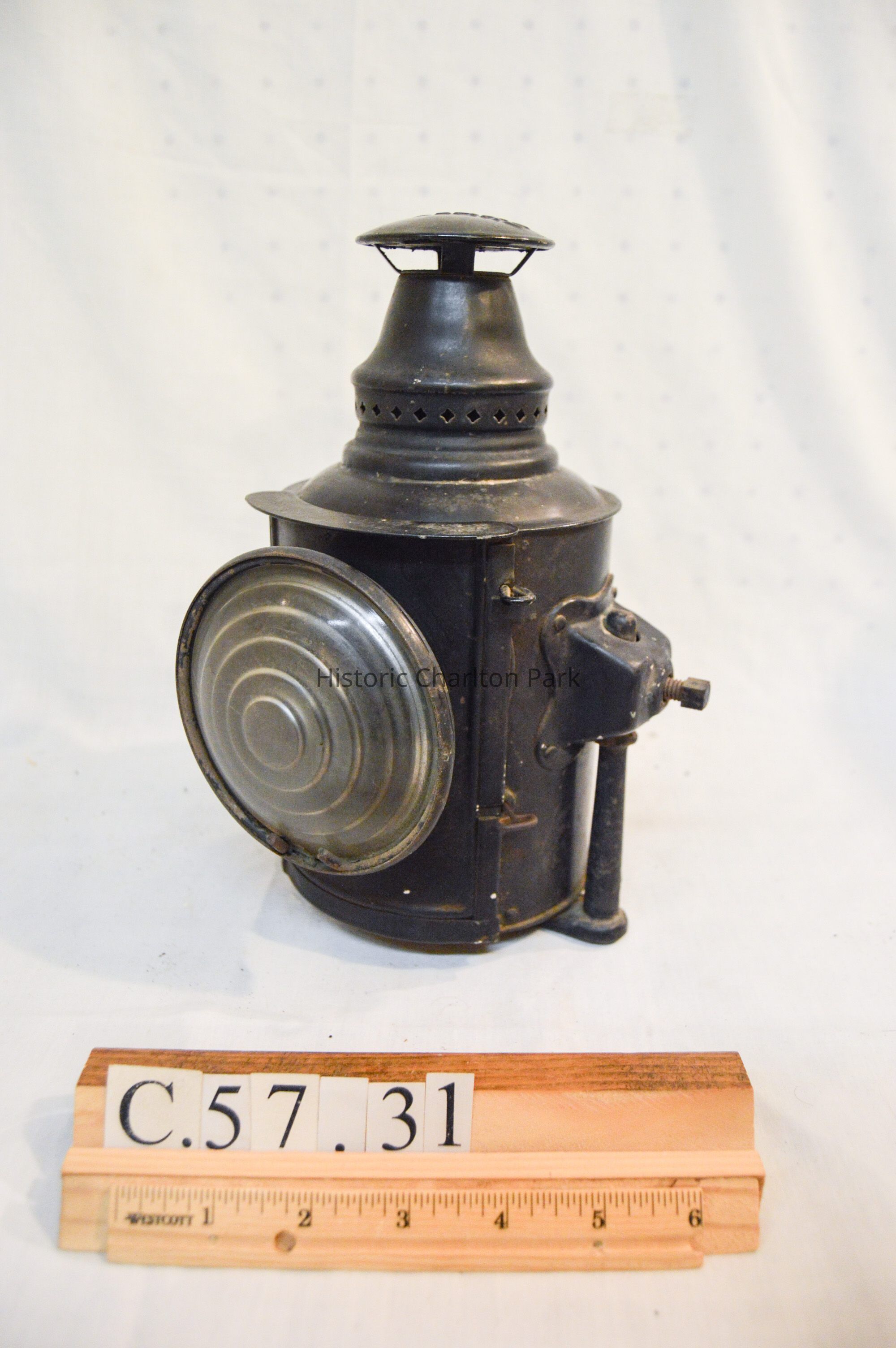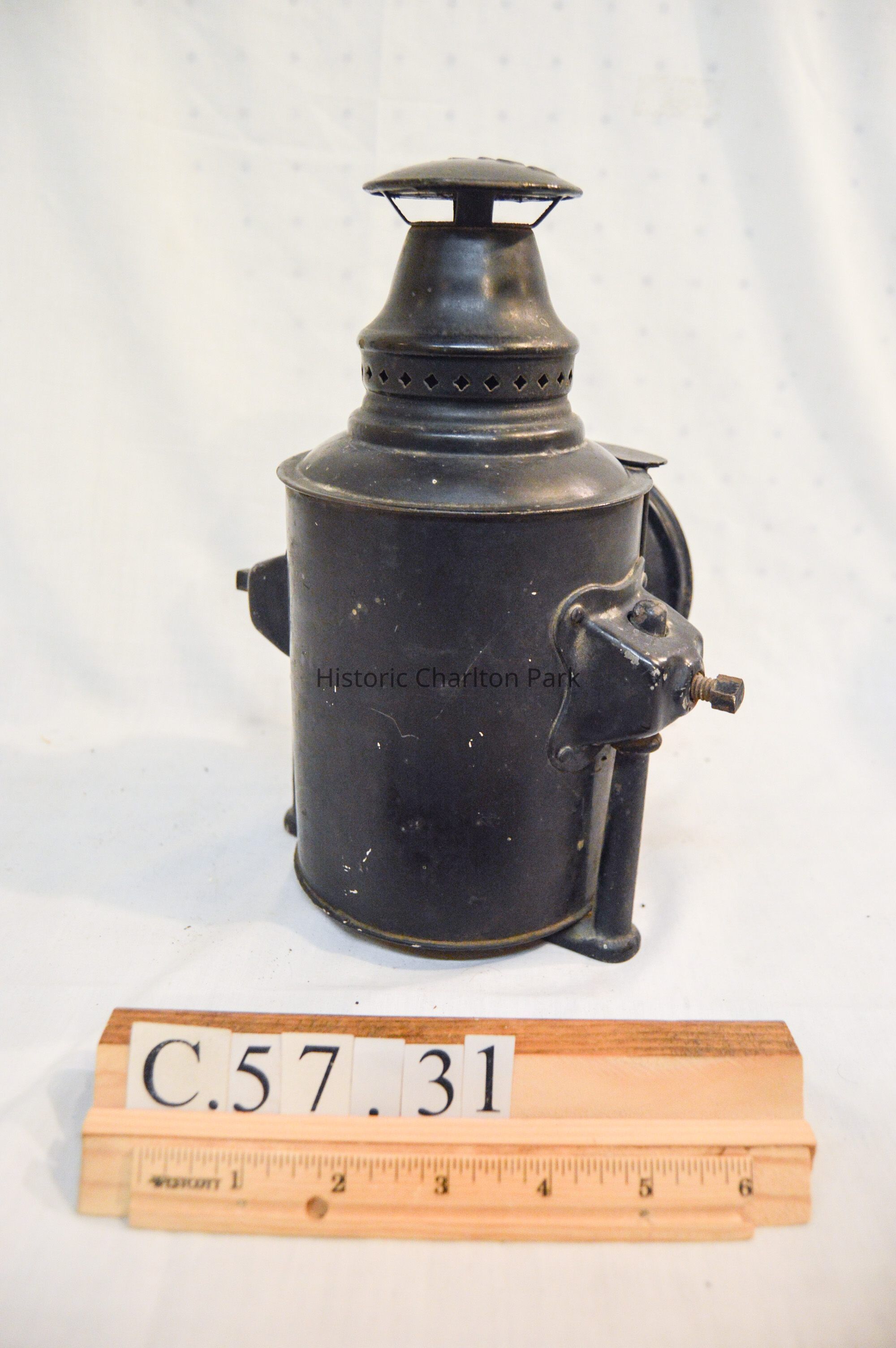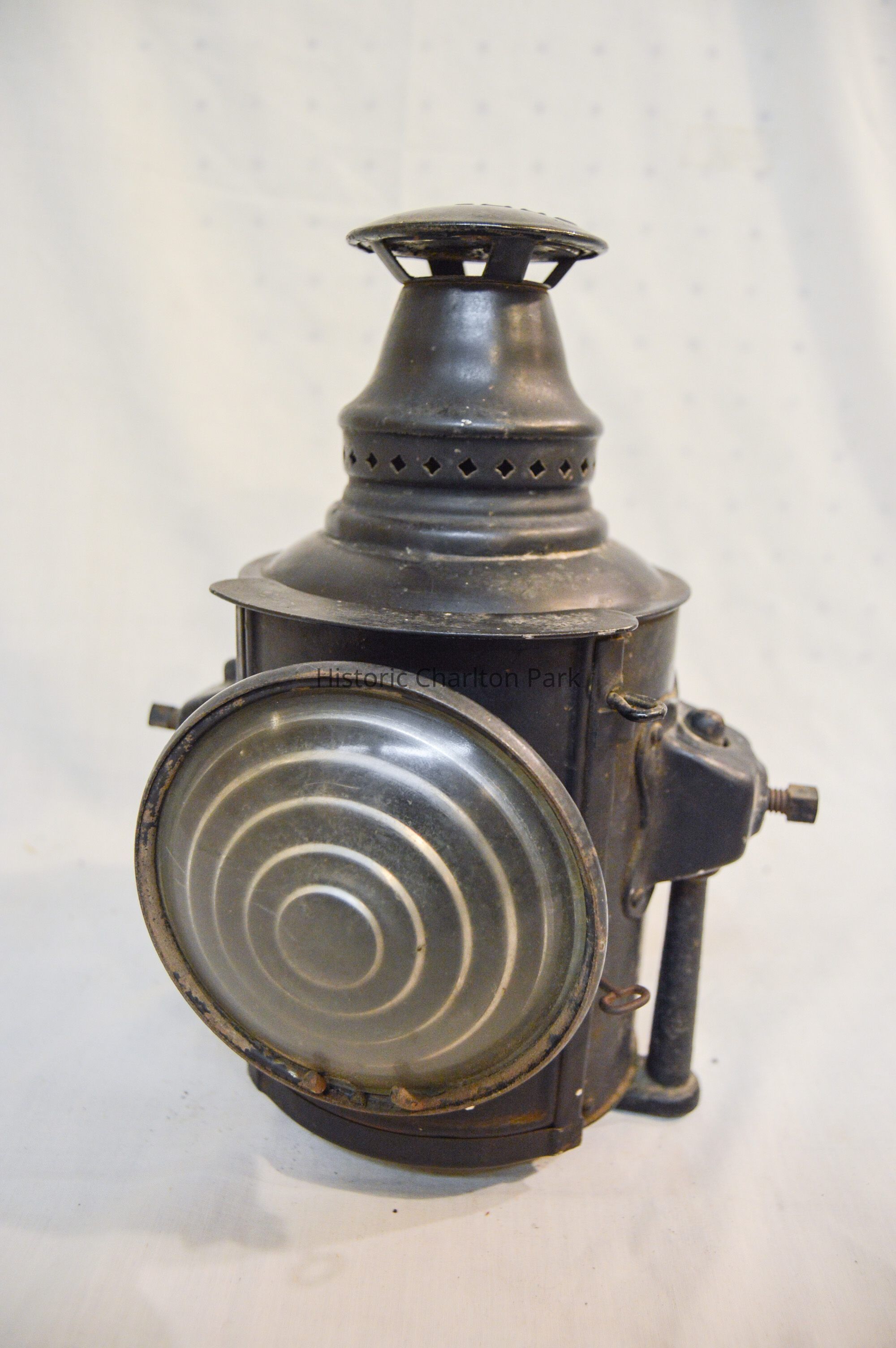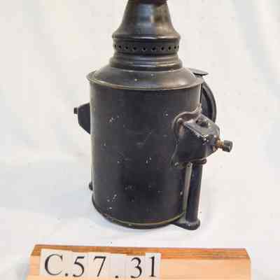 Kerosene driving lantern made of metal and painted black. The lamp has a cylindrical shape and brackets on either side, which are secured with bolts and can be adjusted height-wise. The bracket loops underneath the lamp and acts as a base. The front of the lamp has a panel that swings open. This panel also houses the reflector, which is made of glass and has a concentric circle pattern. The panel opens via hinge and closes with clasps. The top of the lantern has a somewhat conical cap There are diamond-shaped holes around the side near the bottom, and a flat, circular portion at the top with an inscription.