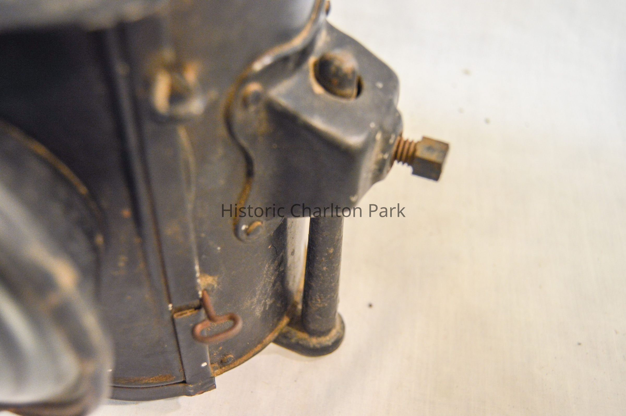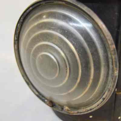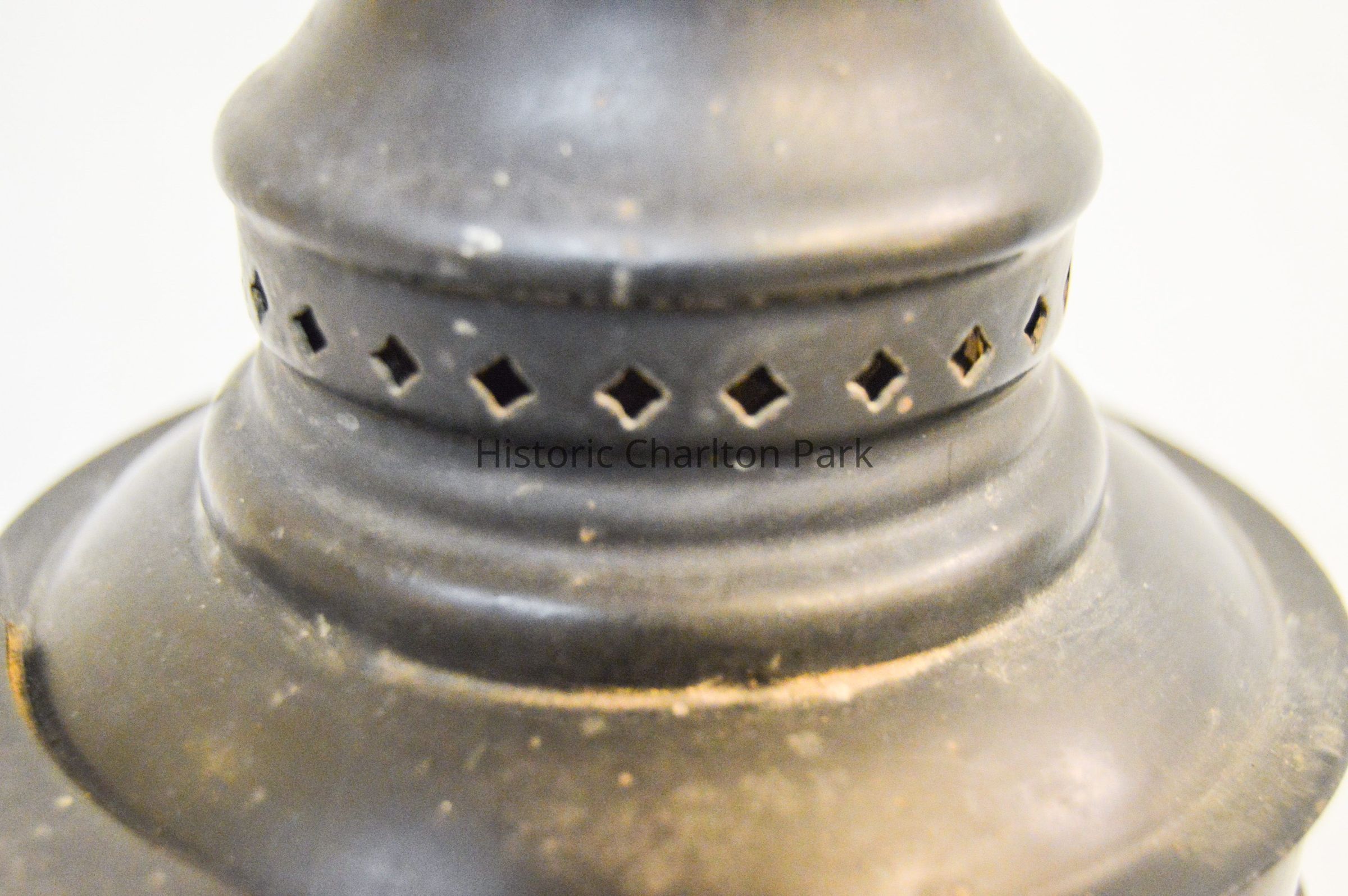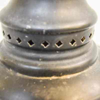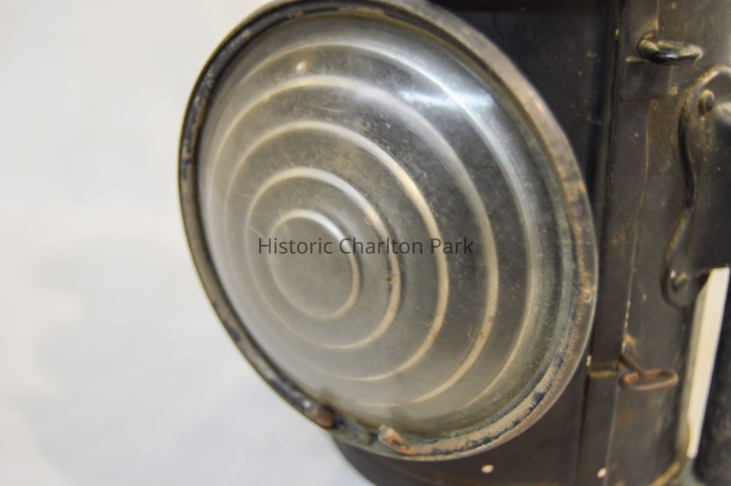 Kerosene driving lantern made of metal and painted black. The lamp has a cylindrical shape and brackets on either side, which are secured with bolts and can be adjusted height-wise. The bracket loops underneath the lamp and acts as a base. The front of the lamp has a panel that swings open. This panel also houses the reflector, which is made of glass and has a concentric circle pattern. The panel opens via hinge and closes with clasps. The top of the lantern has a somewhat conical cap There are diamond-shaped holes around the side near the bottom, and a flat, circular portion at the top with an inscription.