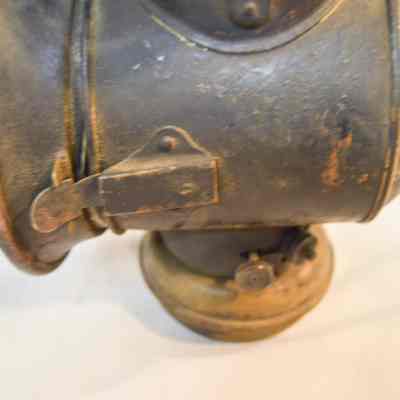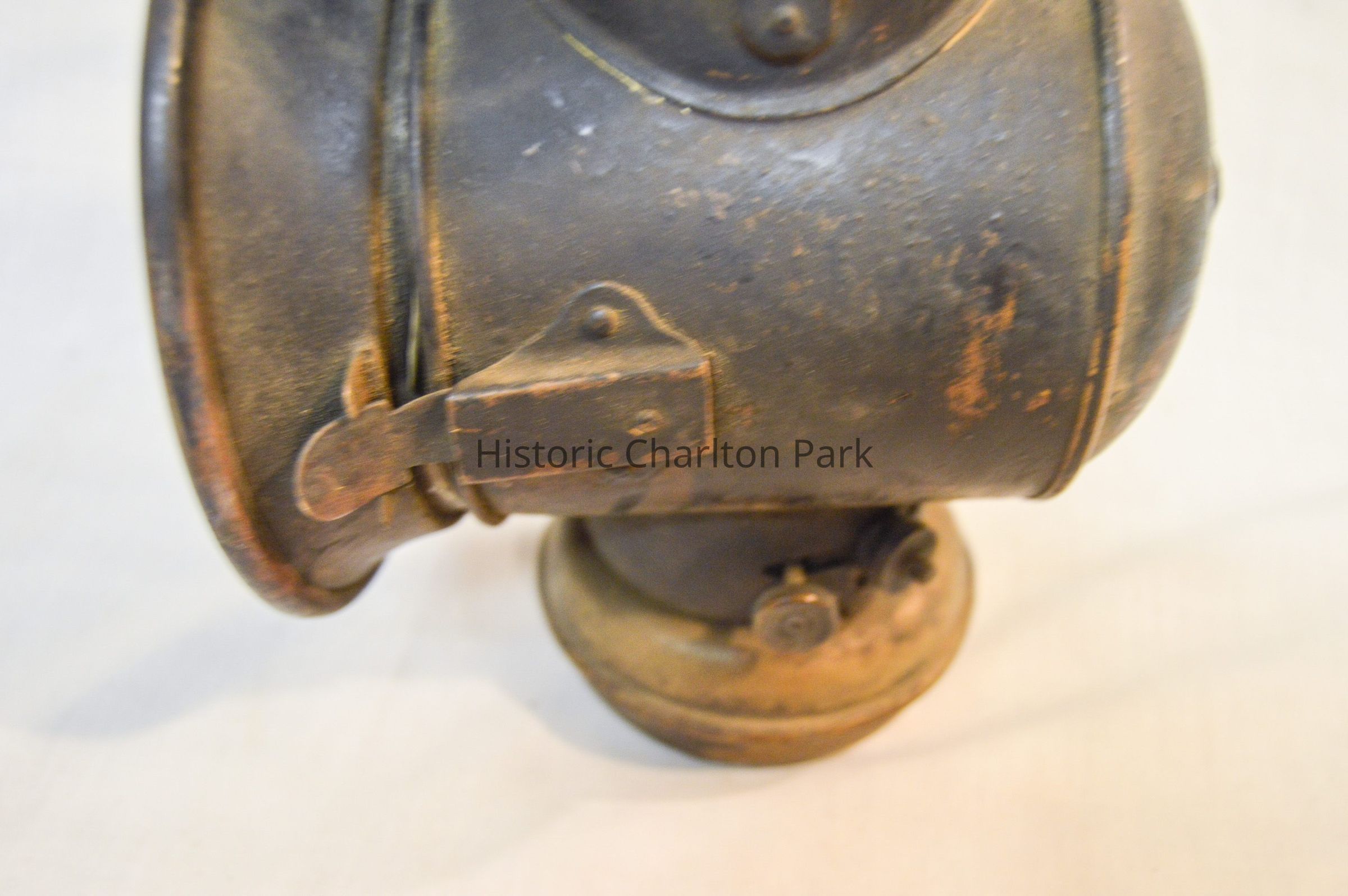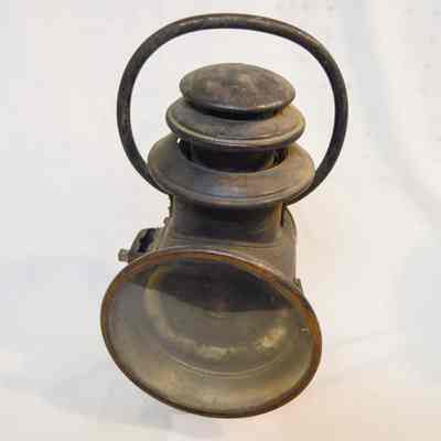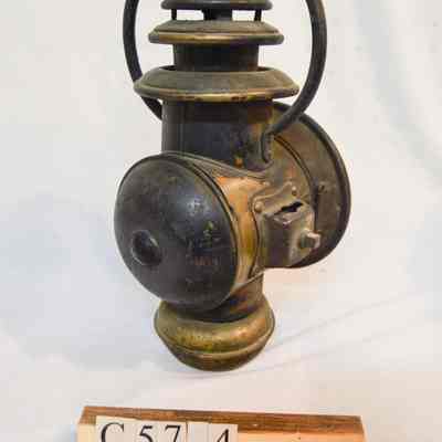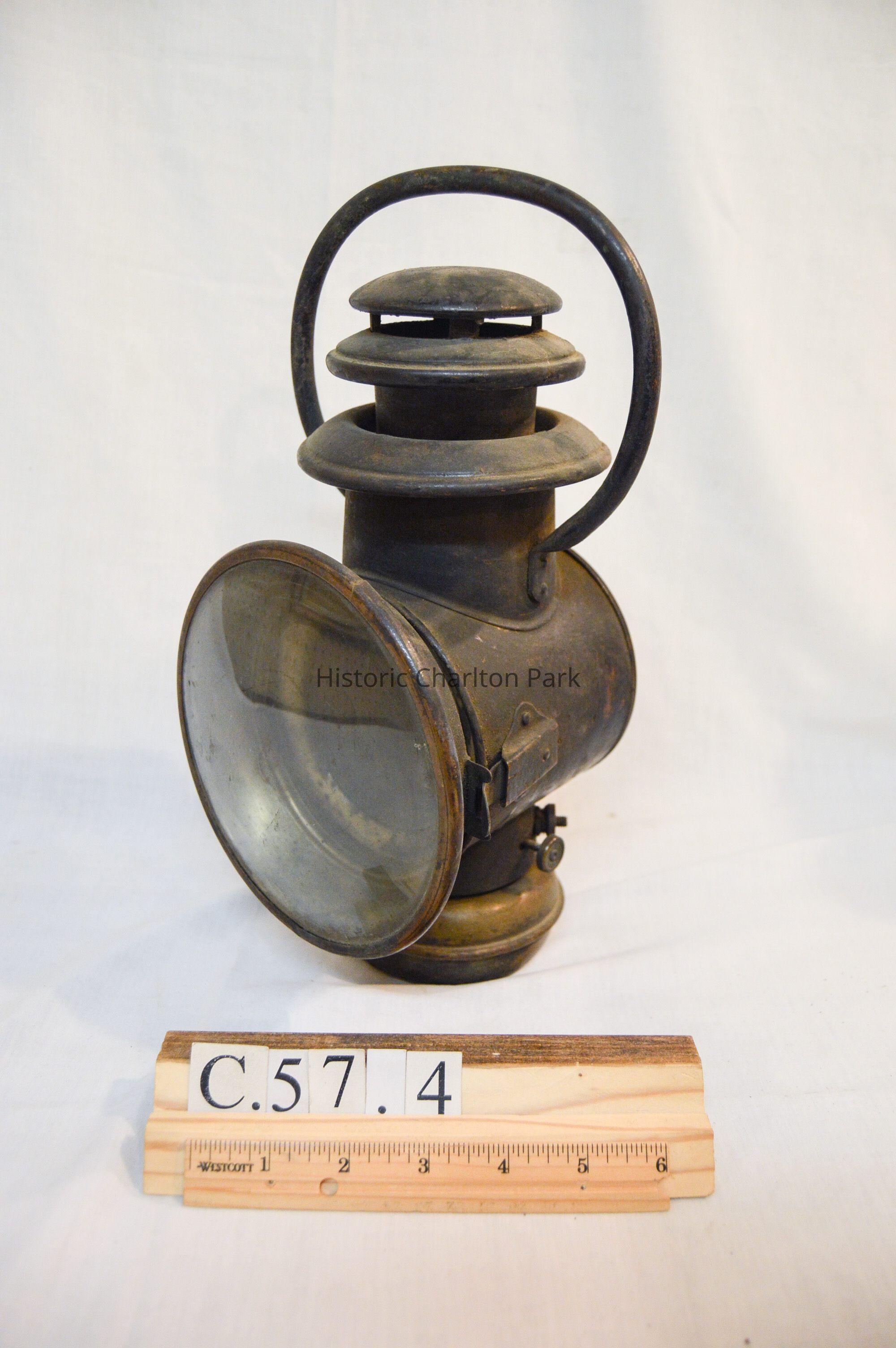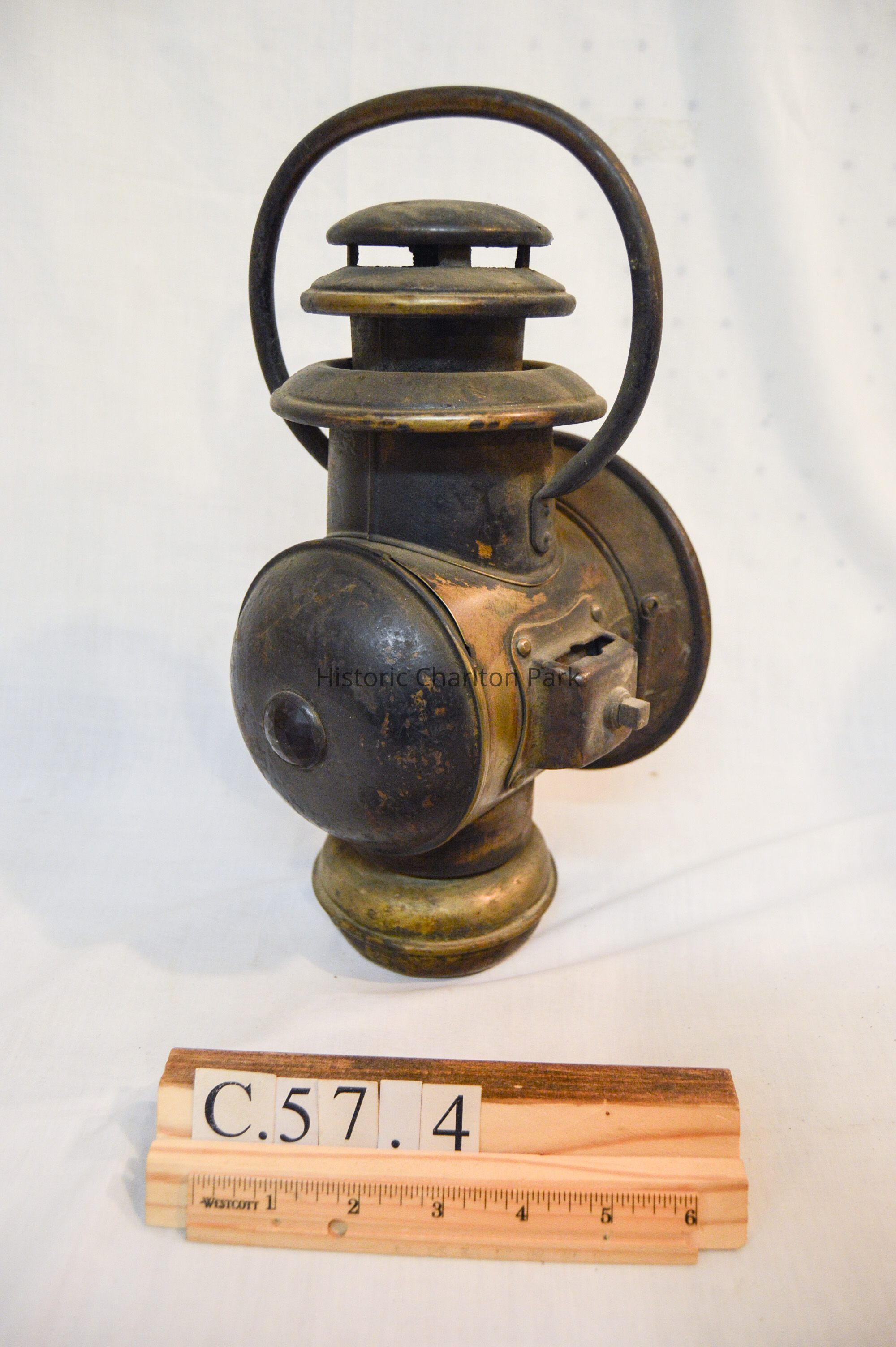 Kerosene driving lamp made of metal and has a circular base. The body of the lamp is cylindrical and has a horizontal orientation. The front of the lamp has a large, glass reflector housed in a metal frame that swings open on a hinge. The frame clasps shut on the right side. There is a bracket on the left side of the lamp for attaching the lamp to a vehicle. The right side of the lamp has a round knob near the base for adjusting the light level. The back of the lamp is dome-shaped and has a red, gem-shaped reflector in the middle. The top of the lamp is cylindrical and has three discs around it. The top two discs are attached to a thinner cylinder that rests inside the bottom one. A large, looped metal handle is attached below the bottom disc.Dimensions