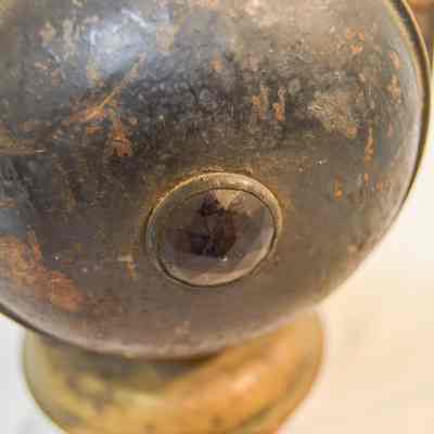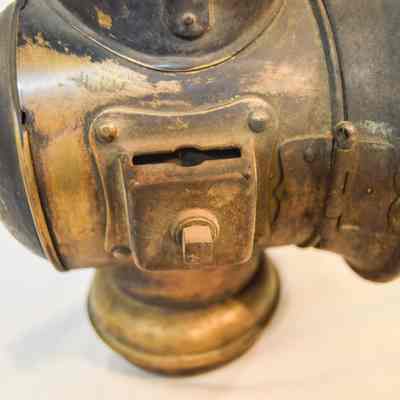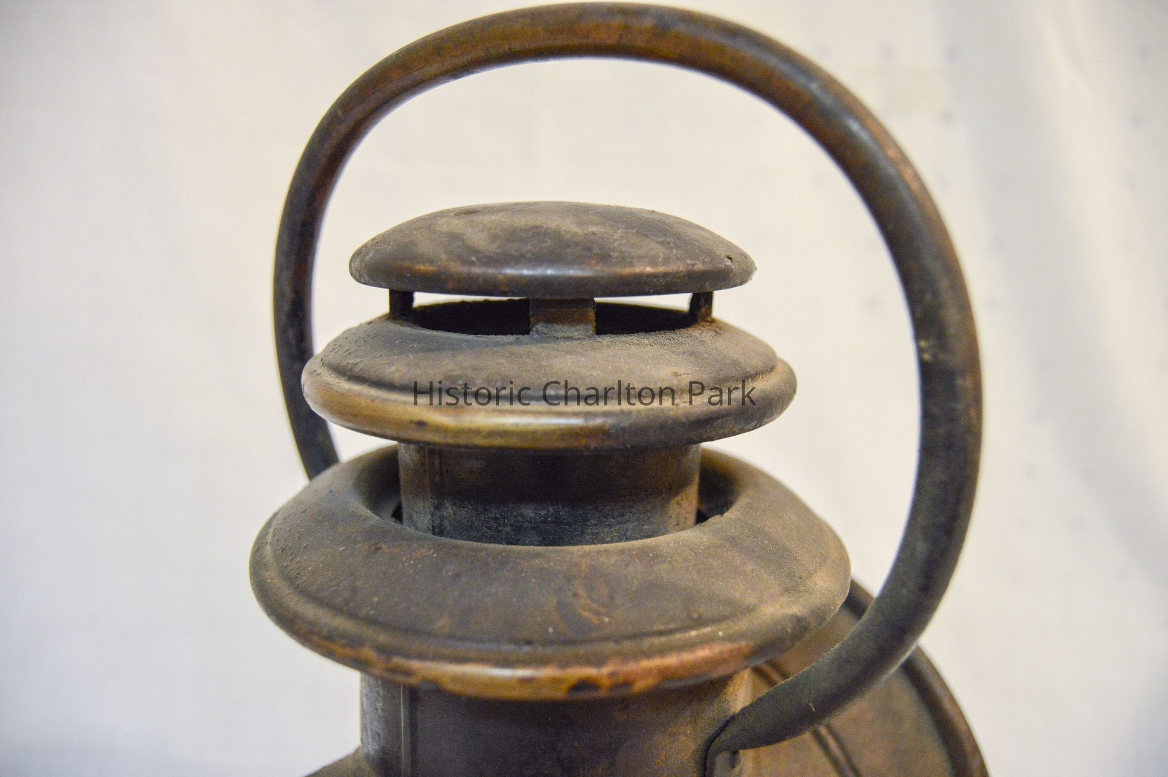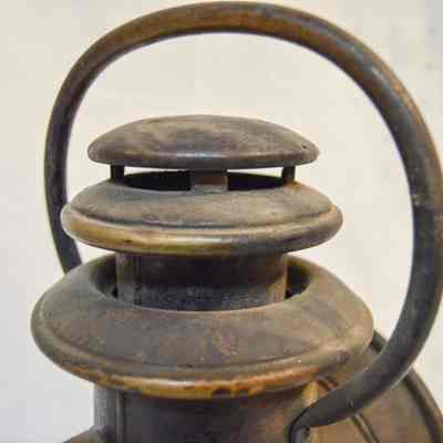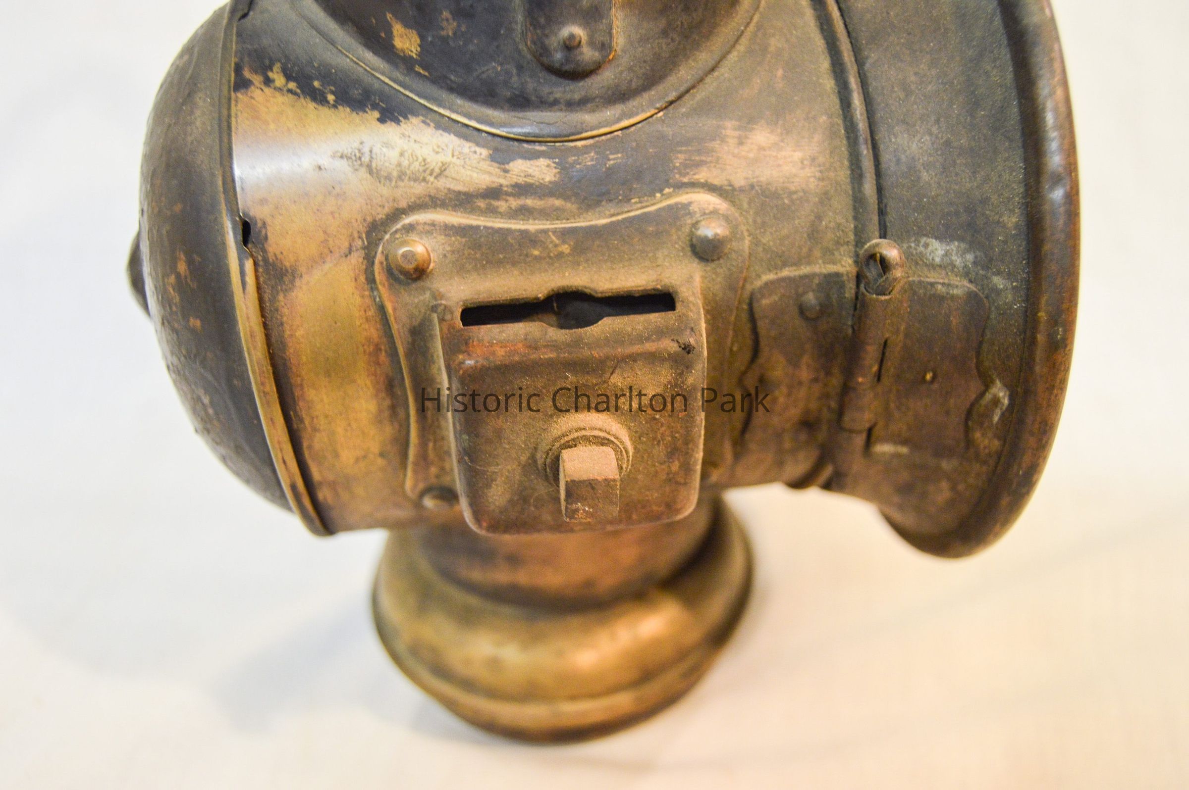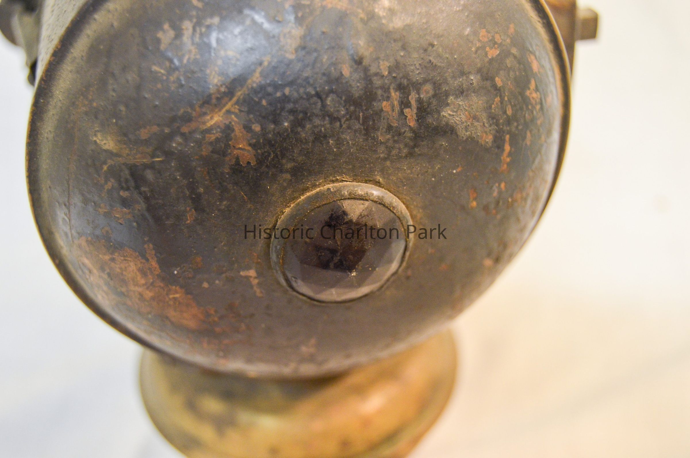 Kerosene driving lamp made of metal and has a circular base. The body of the lamp is cylindrical and has a horizontal orientation. The front of the lamp has a large, glass reflector housed in a metal frame that swings open on a hinge. The frame clasps shut on the right side. There is a bracket on the left side of the lamp for attaching the lamp to a vehicle. The right side of the lamp has a round knob near the base for adjusting the light level. The back of the lamp is dome-shaped and has a red, gem-shaped reflector in the middle. The top of the lamp is cylindrical and has three discs around it. The top two discs are attached to a thinner cylinder that rests inside the bottom one. A large, looped metal handle is attached below the bottom disc.Dimensions