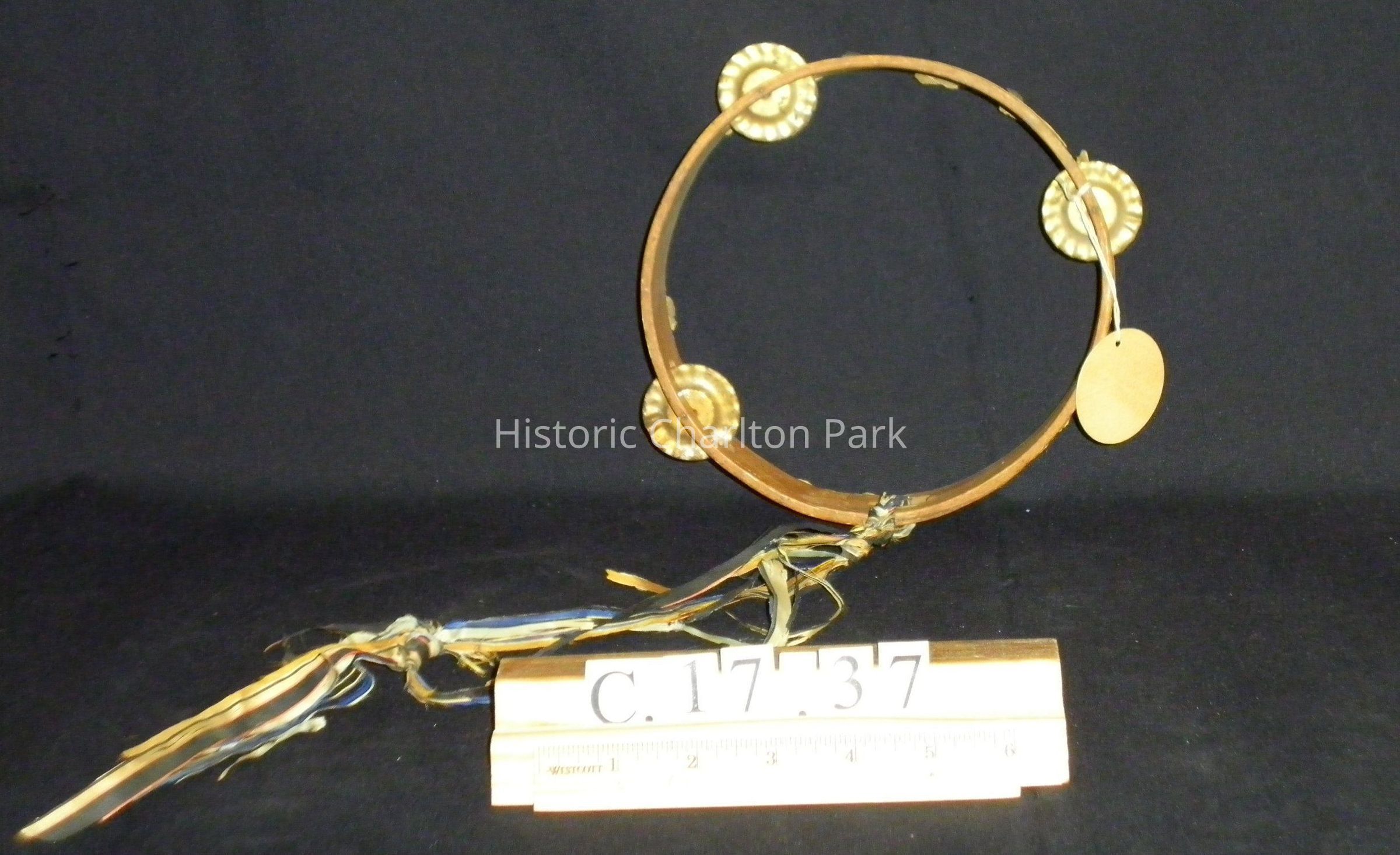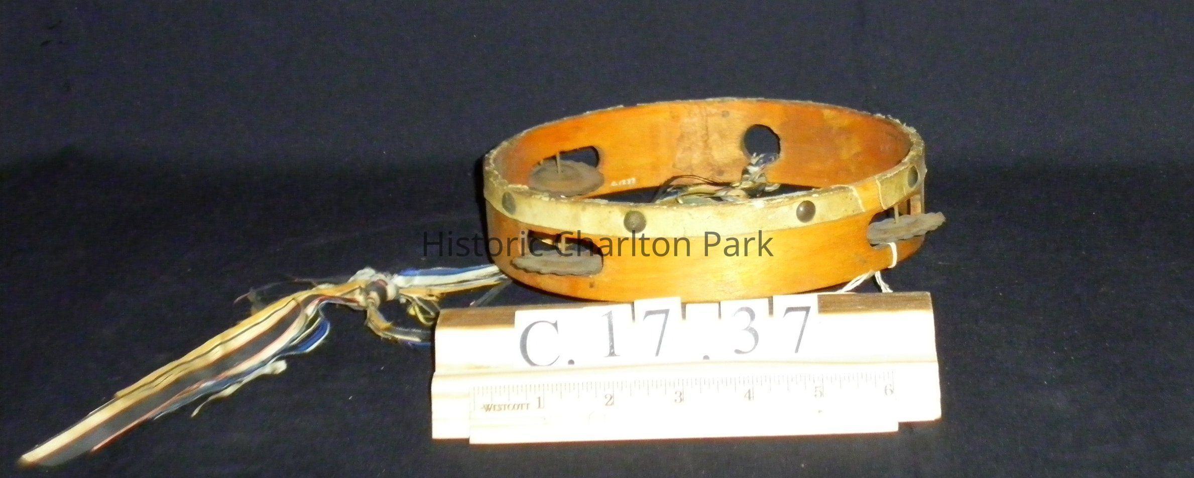 The musical instrument is a tambourine with a light wooden frame. It is round with 3 sets of brass jingles with ribbon streamers. It measures 7 inches in diameter and 23 inches around. It is 1 1/2 inches high. The original notes reference Mattie Teeter.