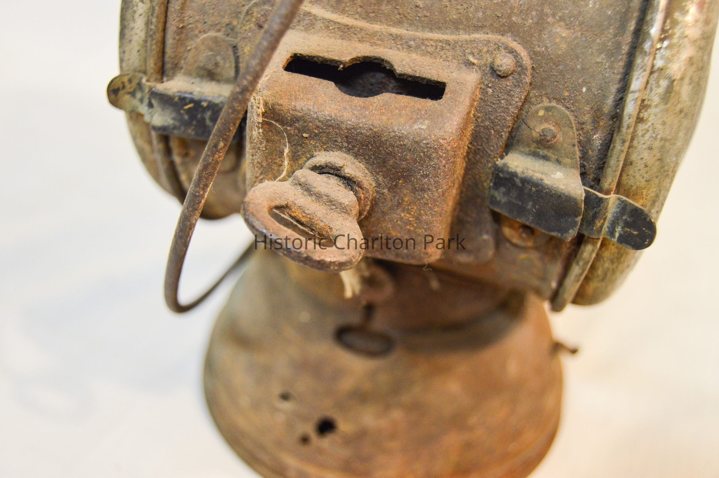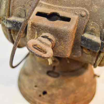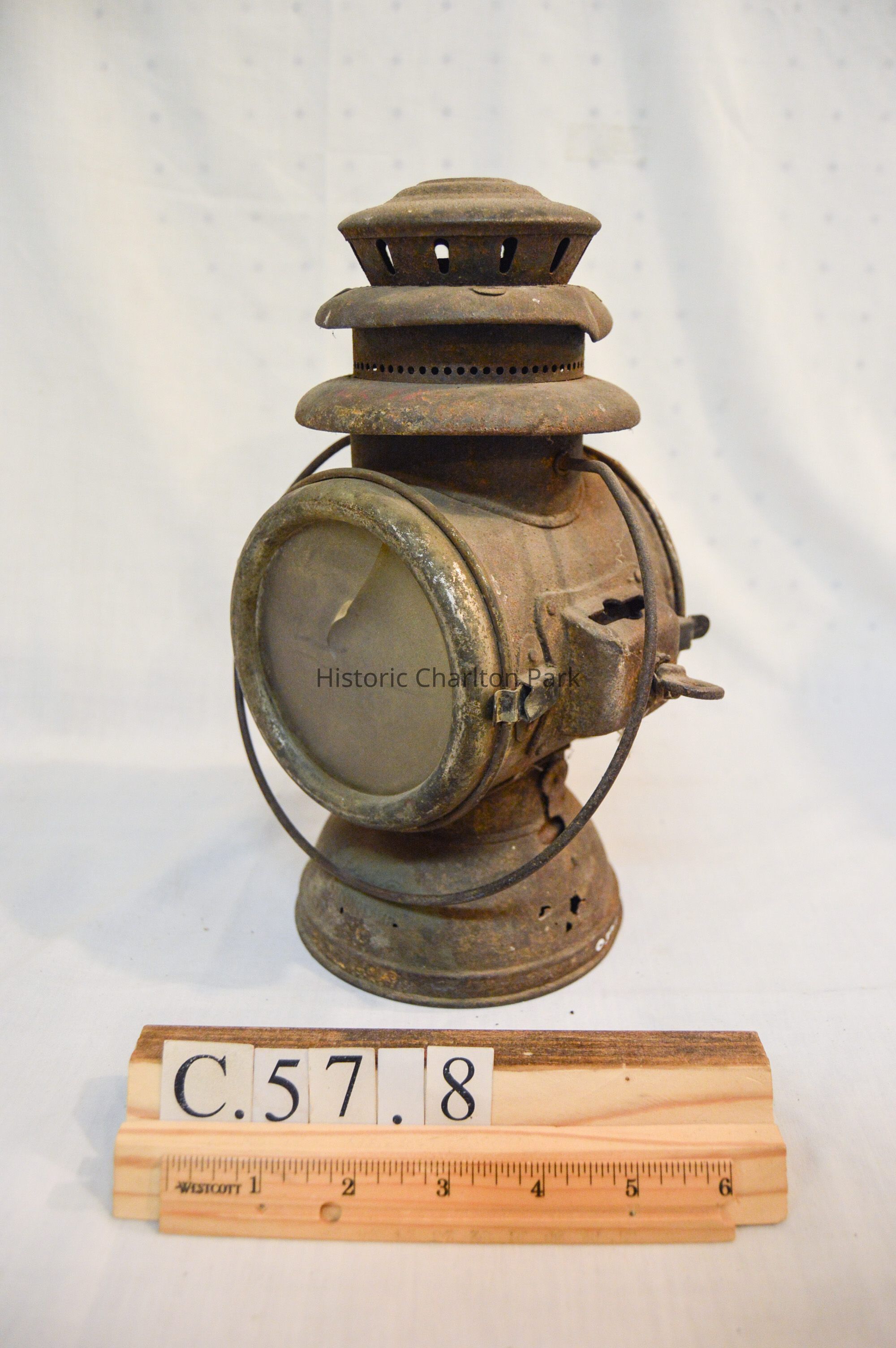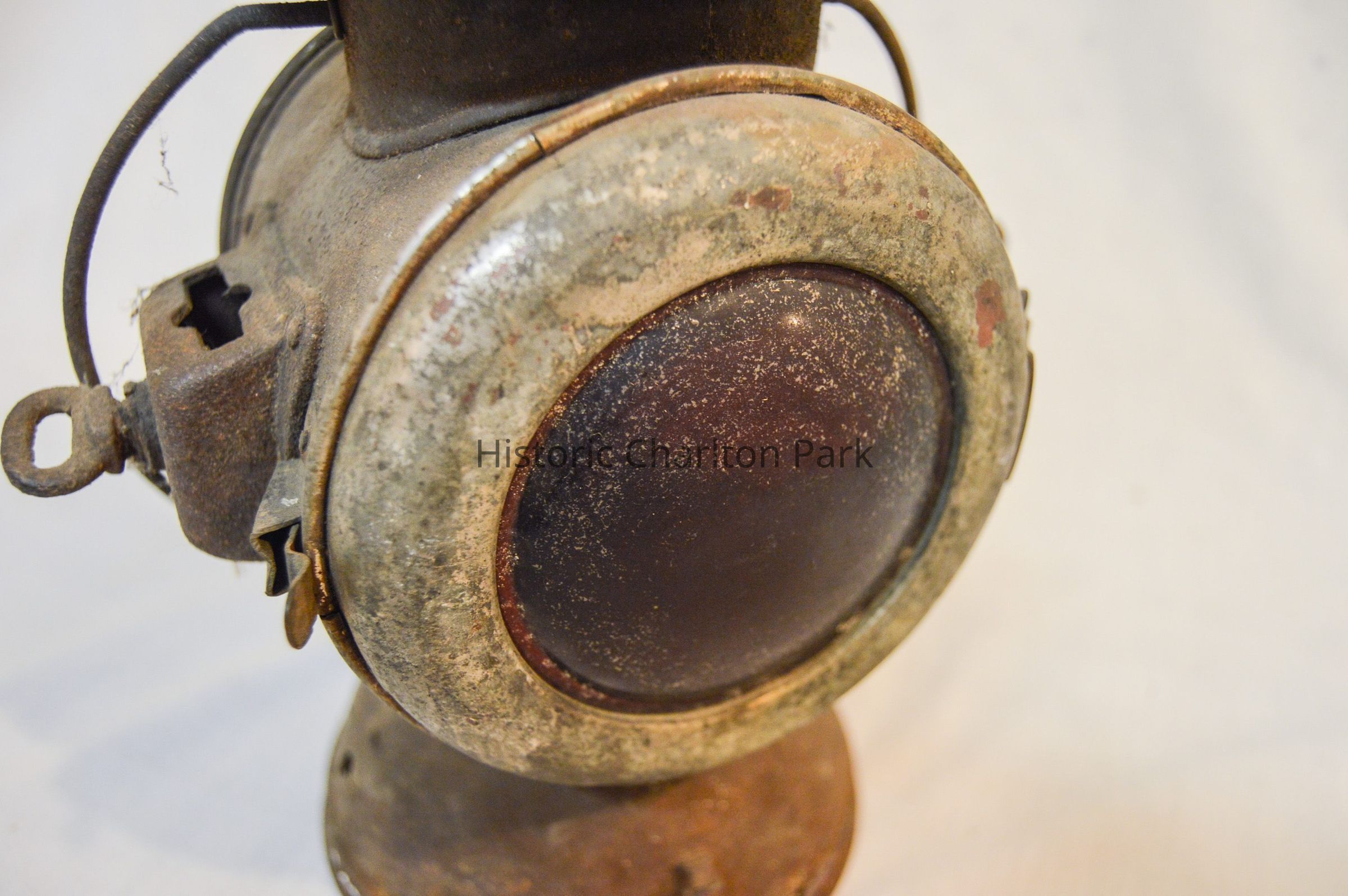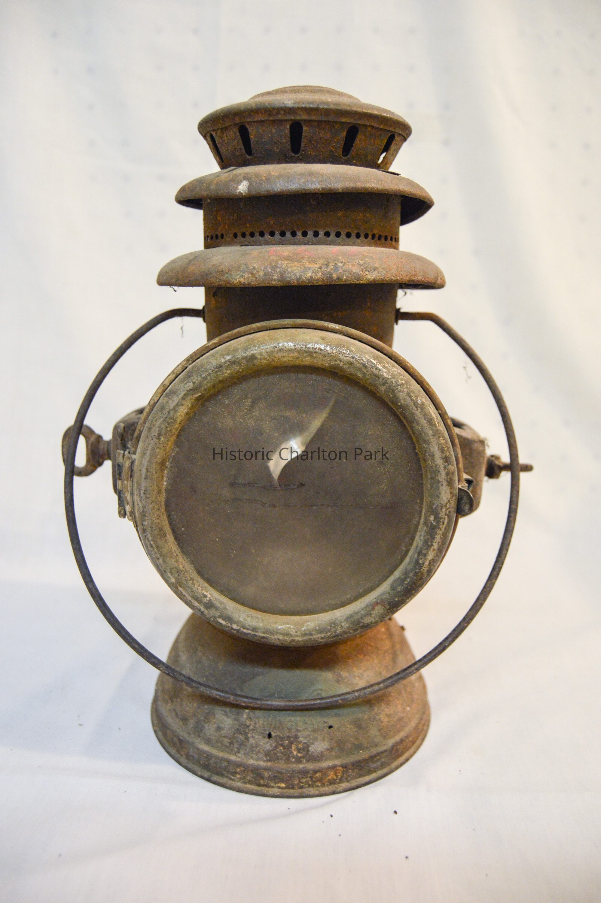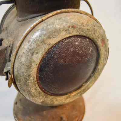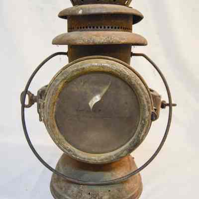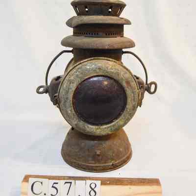 Large kerosene driving lamp made of metal and has a circular, somewhat dome-shaped base. The body of the lamp is cylindrical and has a horizontal orientation. On each end of the body, there is a large glass reflector. The front reflector is clear and the back reflector is red. Both reflectors are housed in a circular metal frame that swings open via hinge and clasps to the body on the right. There are brackets on the side of the lantern, which consist of rectangular boxes with holes in the top and bottom and key-shaped screws. The top of the lamp is cylindrical and has stacked concentric discs. The top and middle discs have circular vents around the circumference. A circular, wire loop handle is connected below the lowest disc.Inscription/Signature/Marks
