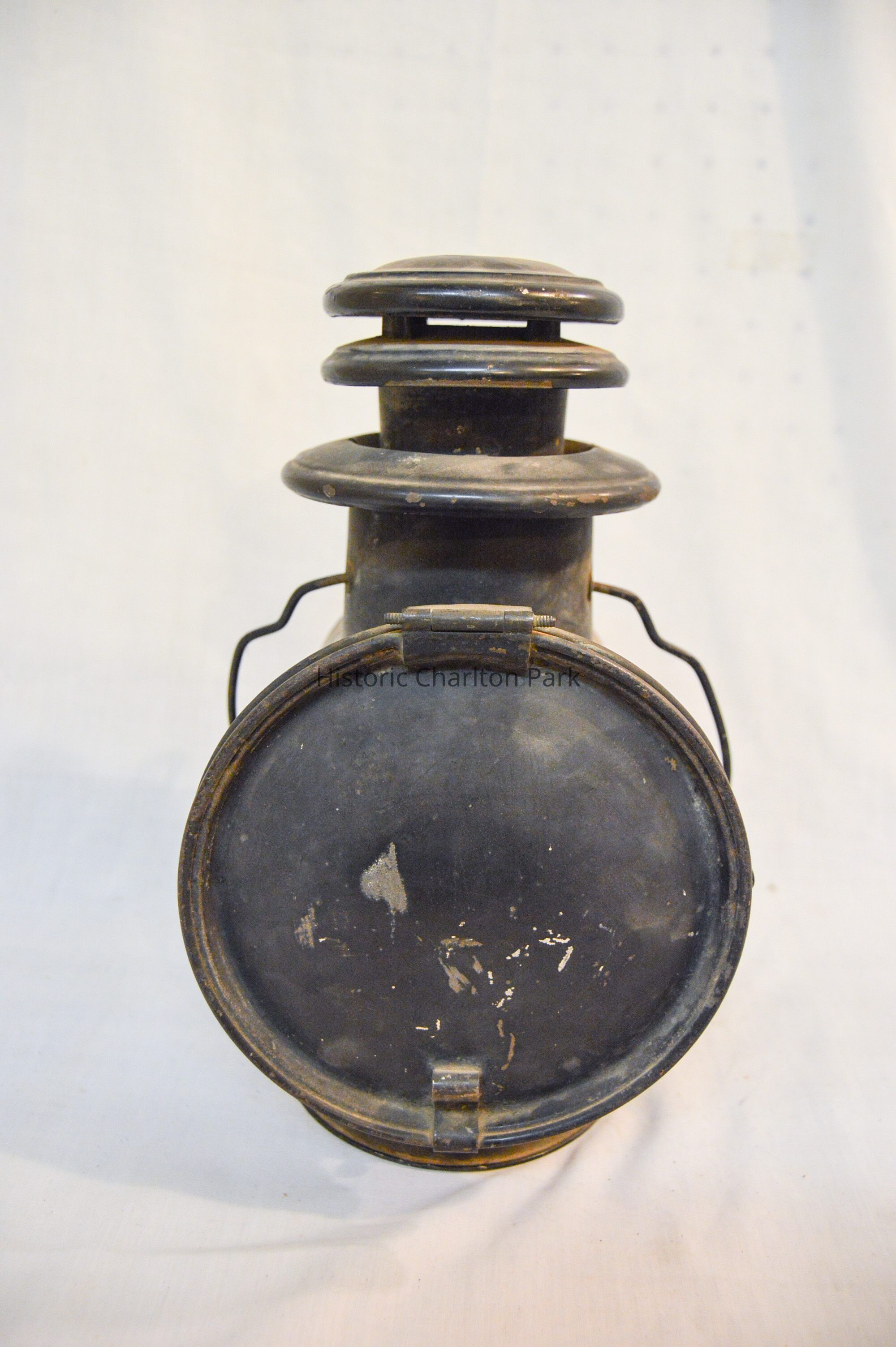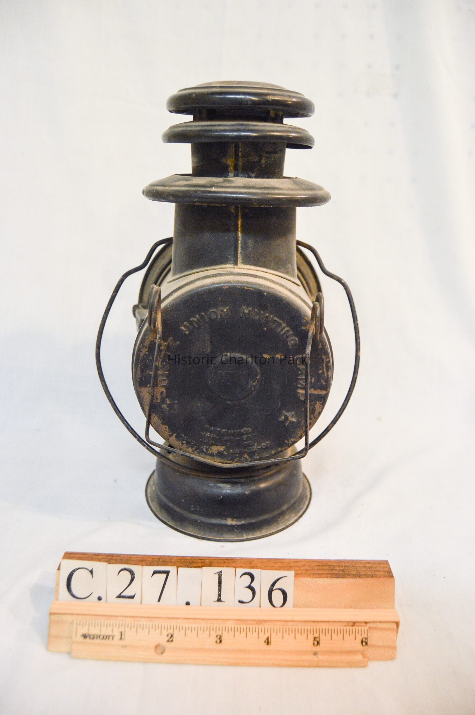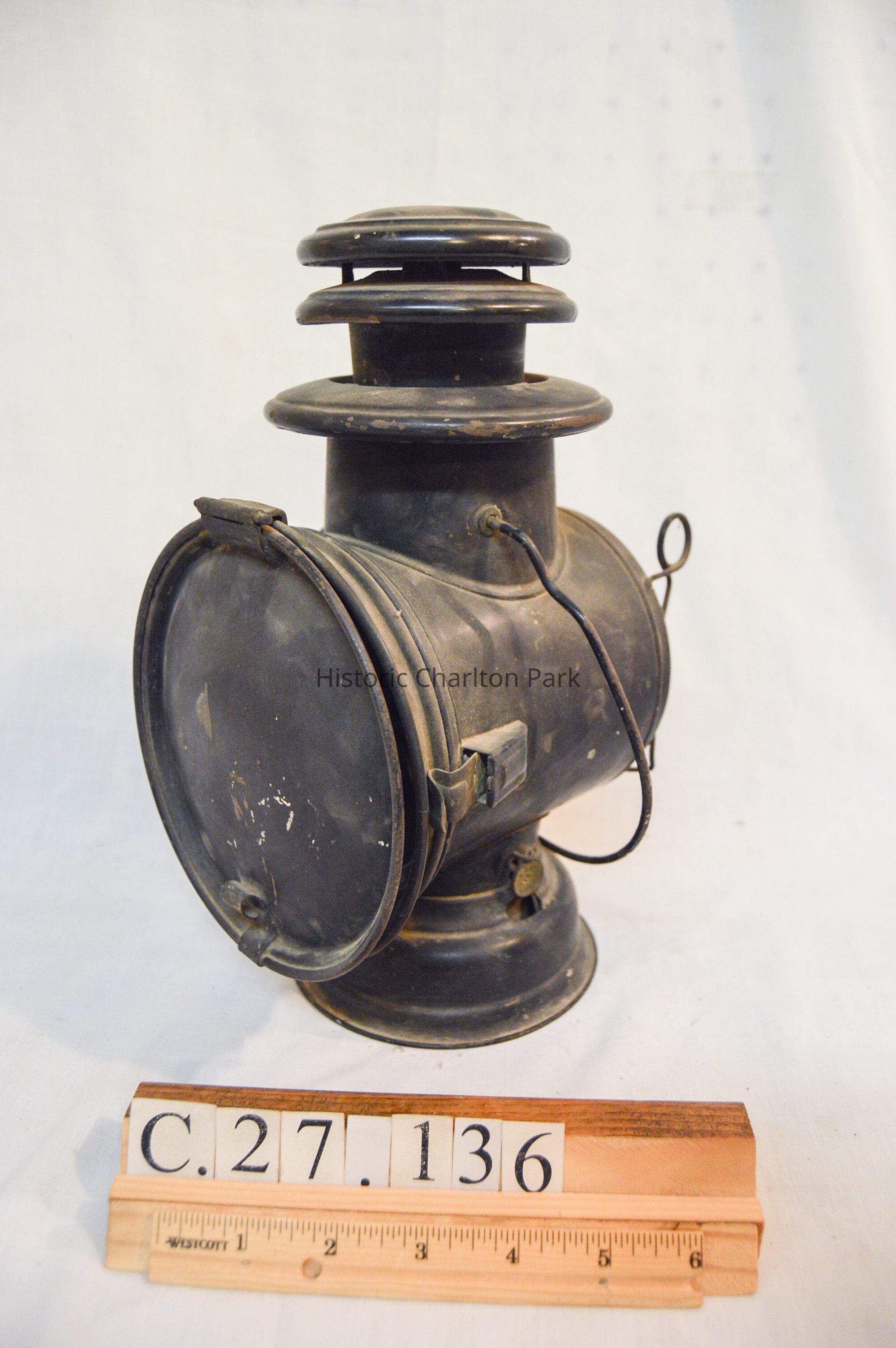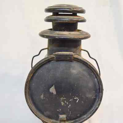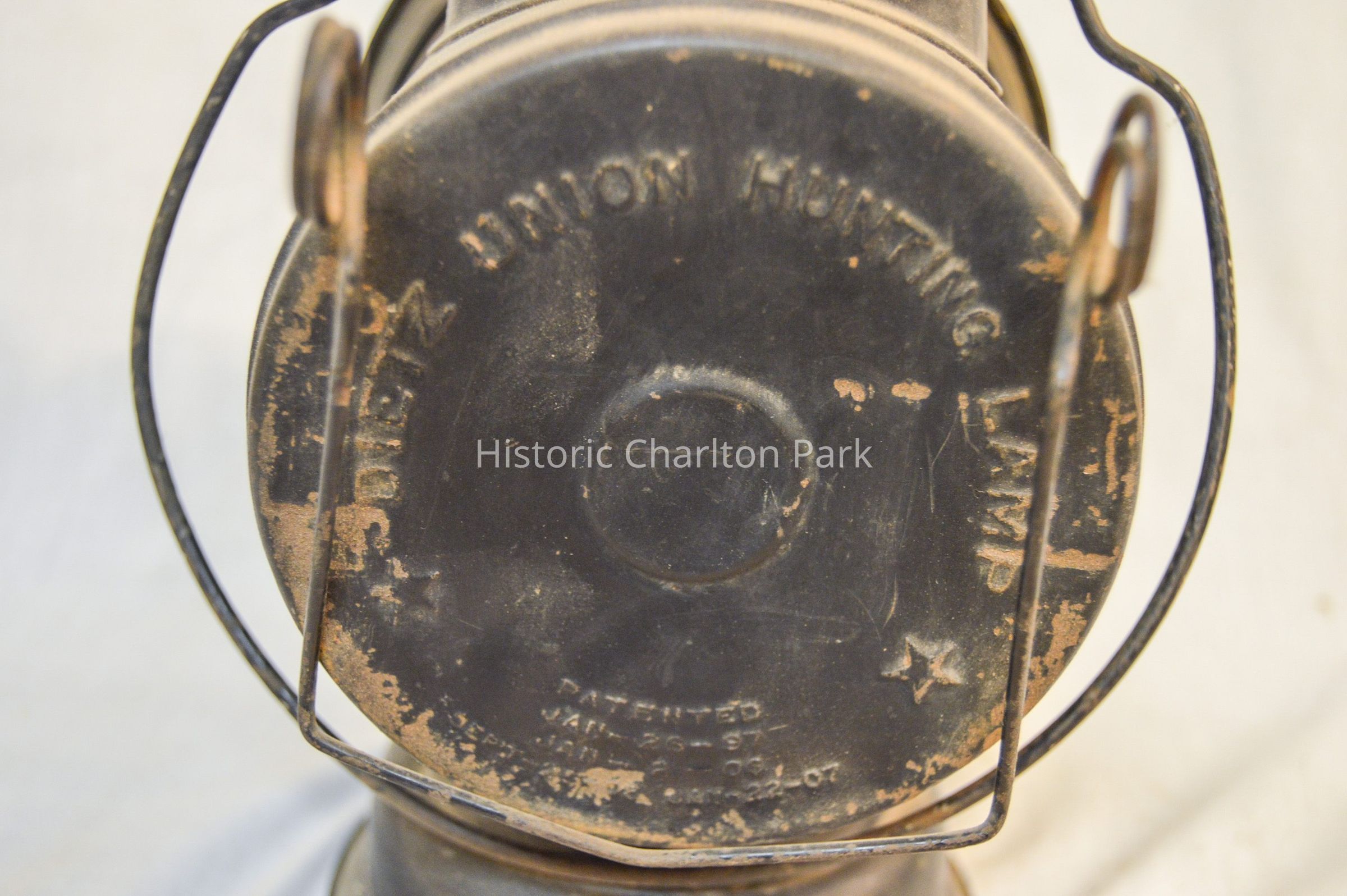 Metal hunting lamp painted black. The lamp has a circular base with a knob just above the right side. The body of the lantern is cylindrical and has a horizontal orientation. At the front, there is a large, glass reflector. The reflector has a circular metal cover that hinges at the top and clasps at the side. The back of the lantern has a metal wire tab with two coiled hinges and an inscription. The top of the lantern is cylindrical with three disc-shaped sections. A looped metal handle is attached to the top of the lantern.Inscription/Signature/Marks