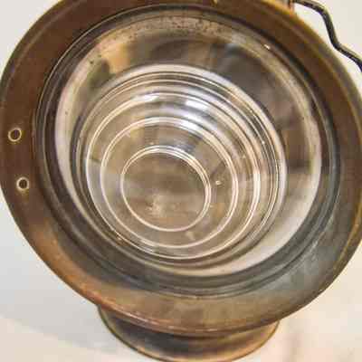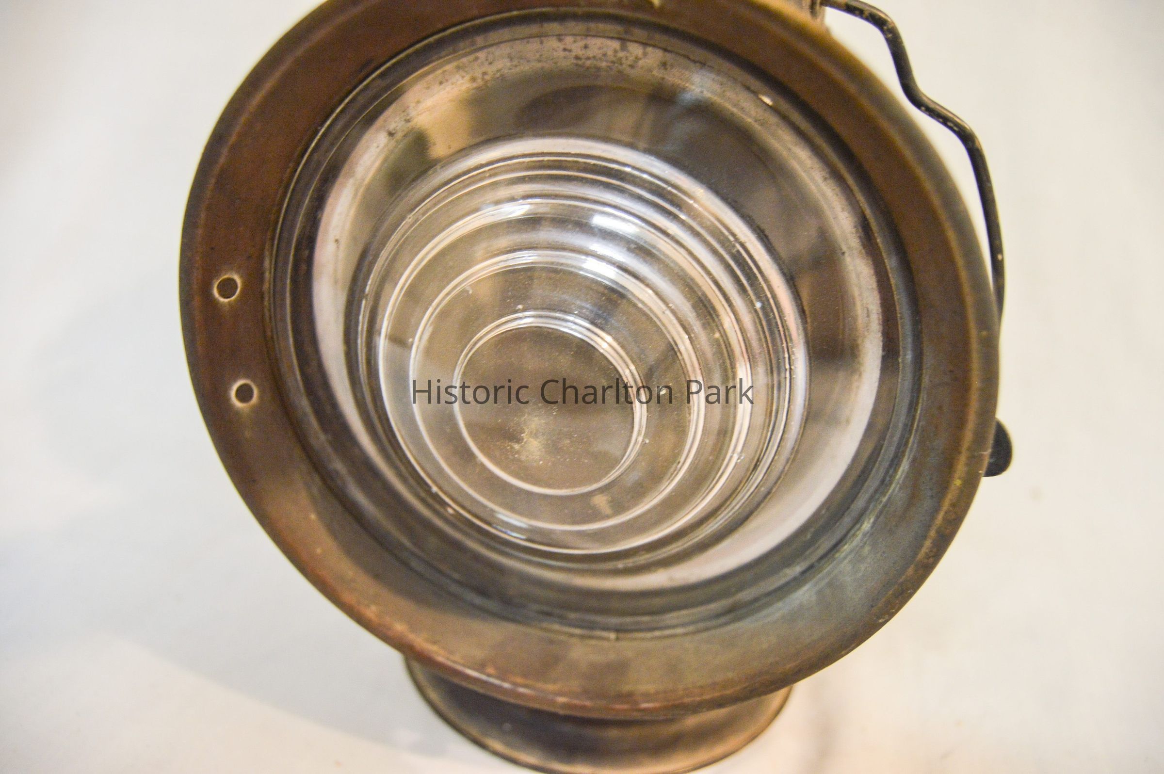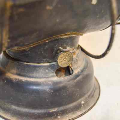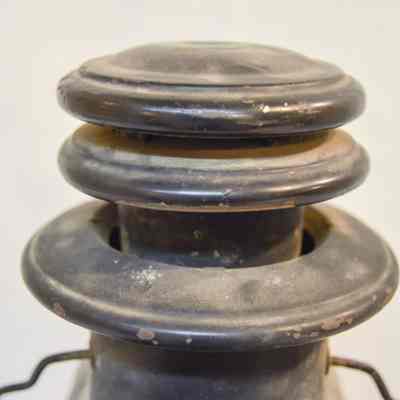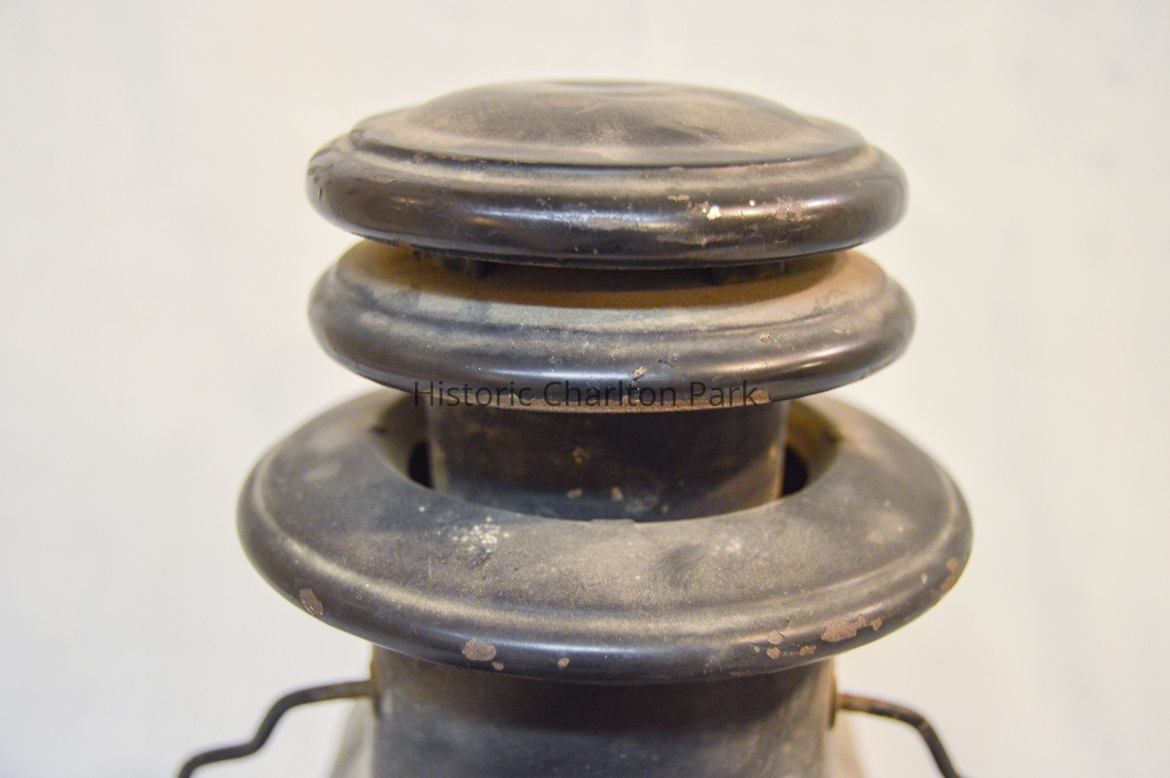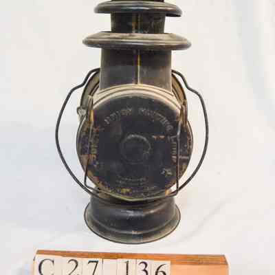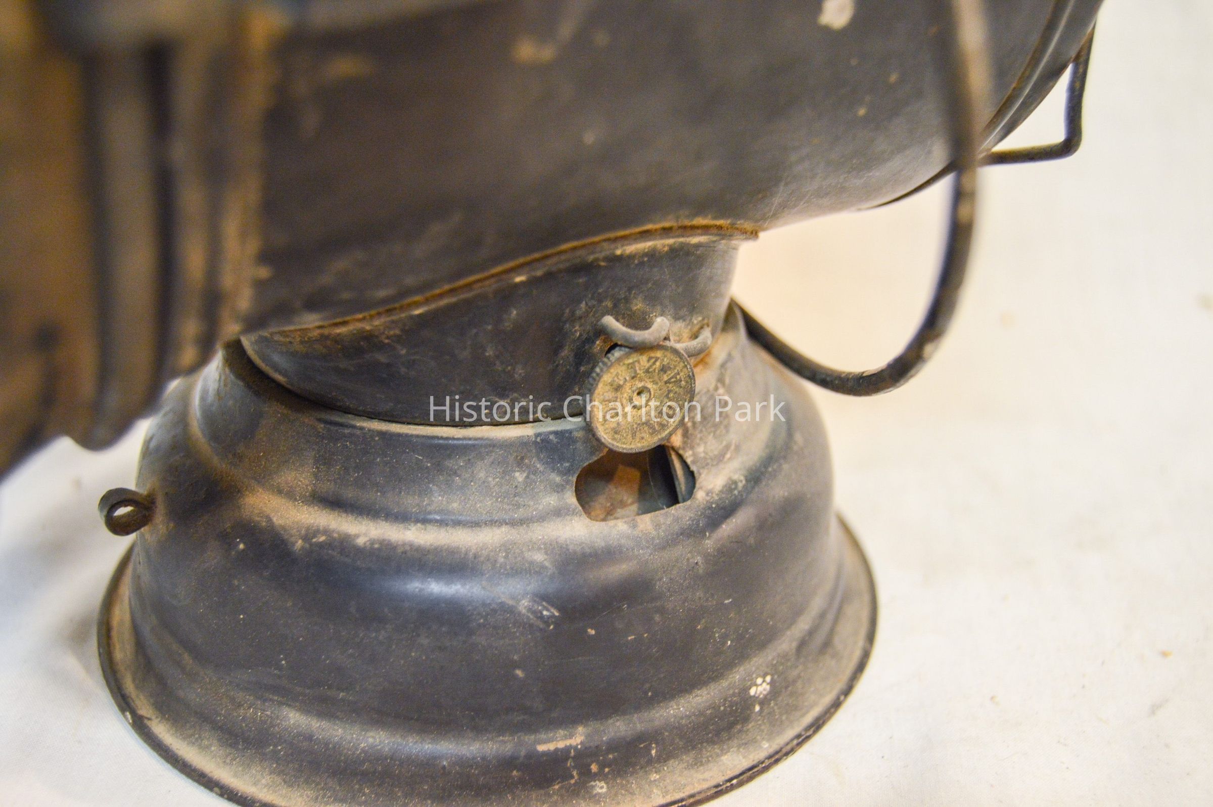 Metal hunting lamp painted black. The lamp has a circular base with a knob just above the right side. The body of the lantern is cylindrical and has a horizontal orientation. At the front, there is a large, glass reflector. The reflector has a circular metal cover that hinges at the top and clasps at the side. The back of the lantern has a metal wire tab with two coiled hinges and an inscription. The top of the lantern is cylindrical with three disc-shaped sections. A looped metal handle is attached to the top of the lantern.Inscription/Signature/Marks