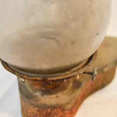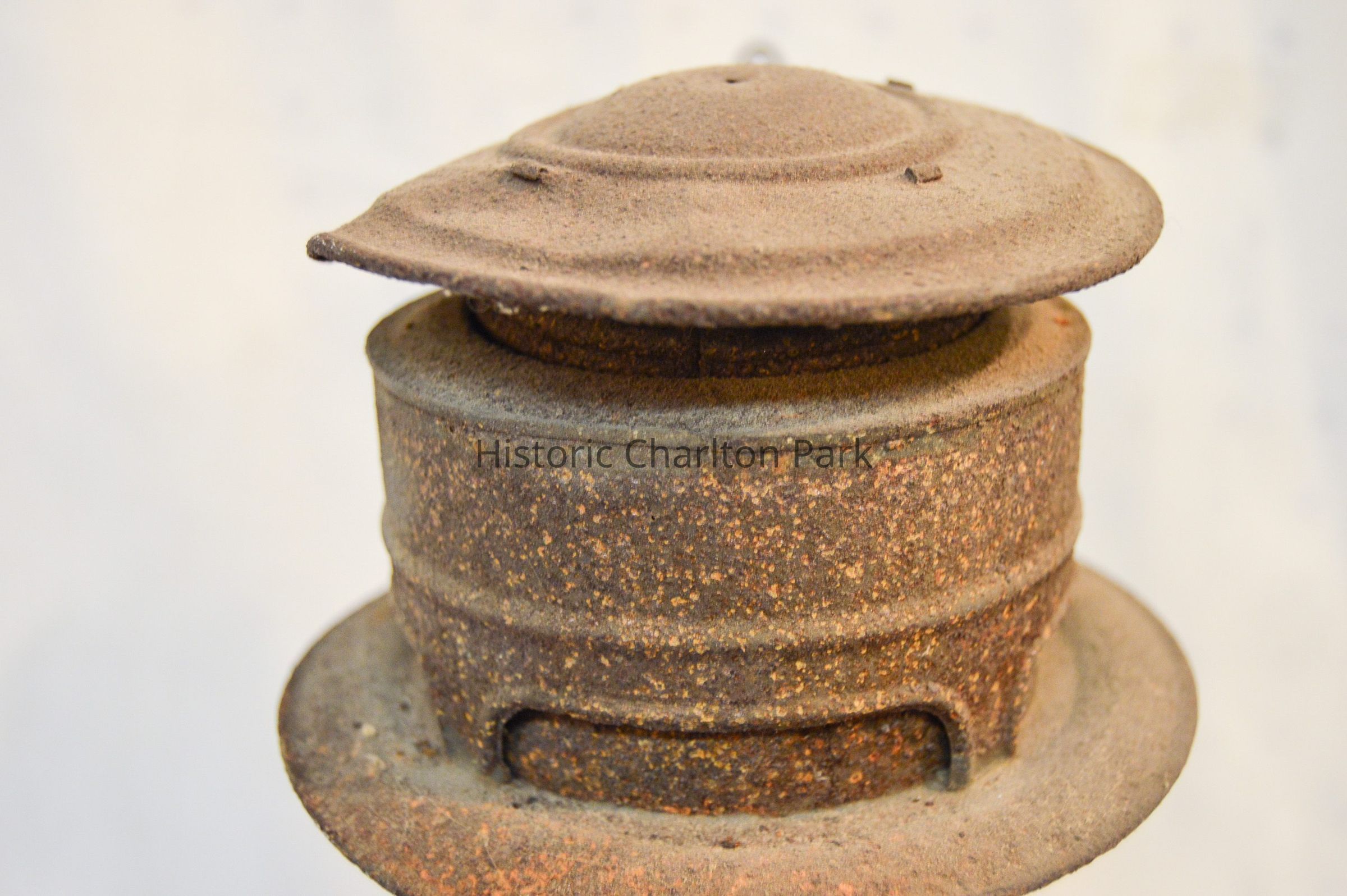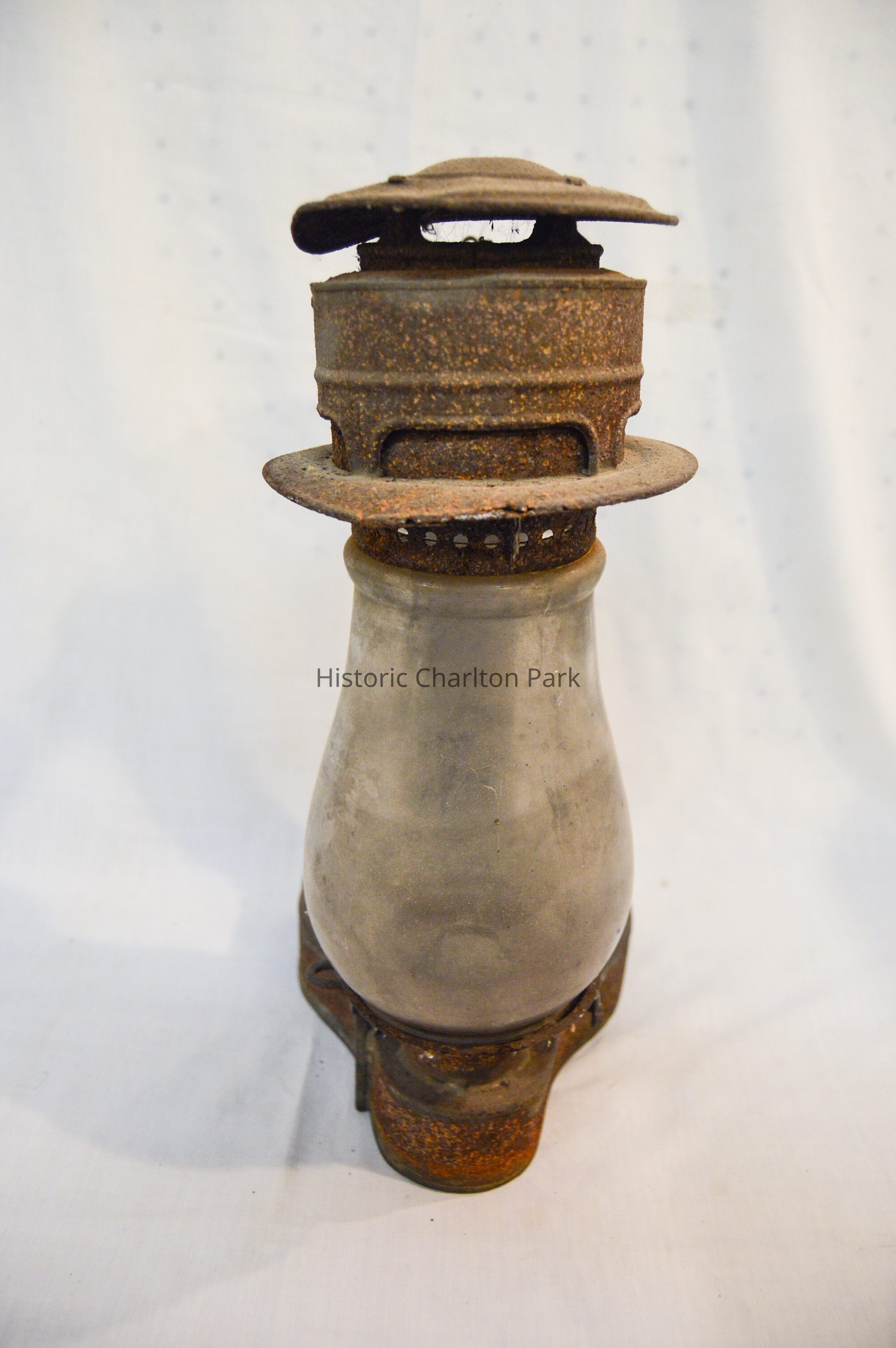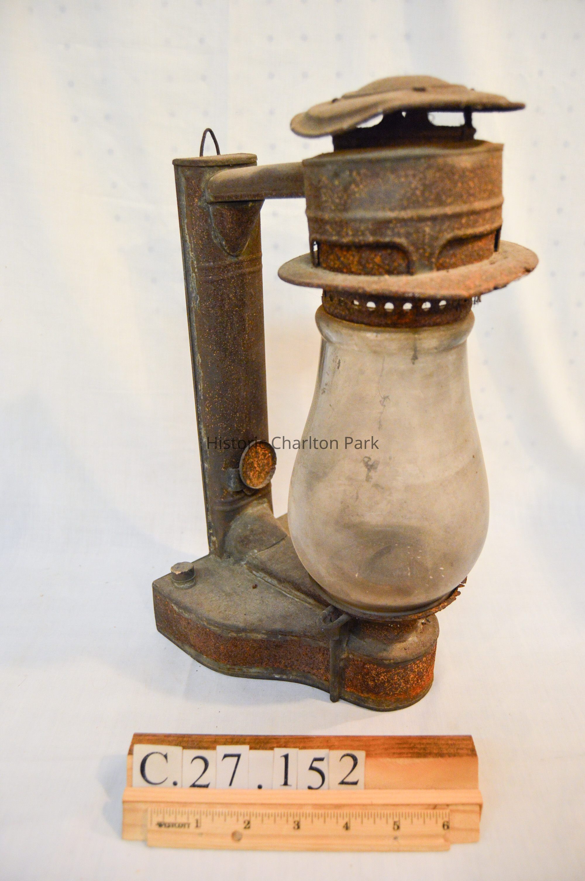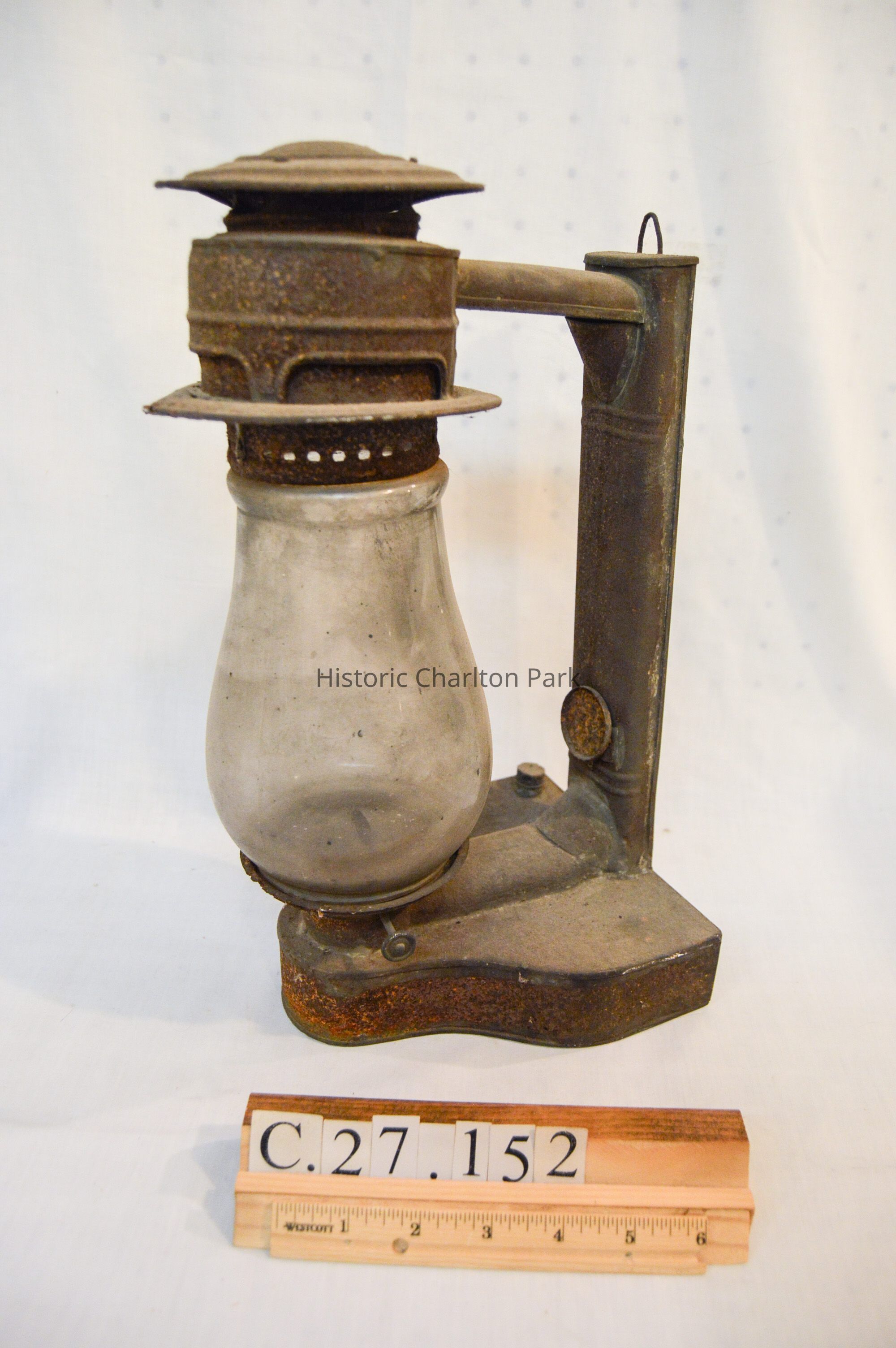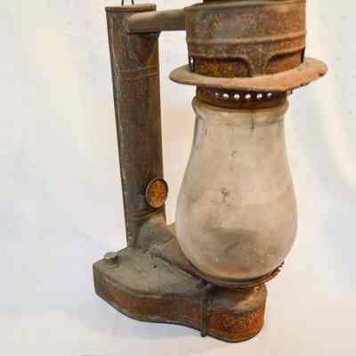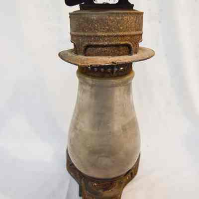 Large kerosene lamp made of metal and has a large frame, likely for mounting to a wall. The base of the lamp is trapezoidal, with a rounded portion at the front. Above the front of the frame sits the burner, which is comprised of a round knob off the right side, a metal right with circular vents, and a dome-shaped emitter in the center. The emitter has a slot in the top for the wick. The glass chimney, which has a somewhat pear-like shape, sits on top of the burner. There is a large structure at the back of the lantern that extends upward and over the chimney, capping it at its top opening. The cap is cylindrical and has a disc around the bottom. The top also somewhat disc-shaped. There is a circular attachment on the back structure near the base, which is circular and likely where a reflector attaches. There is also a small, circular fuel cap on the left side of the base.Dimensions